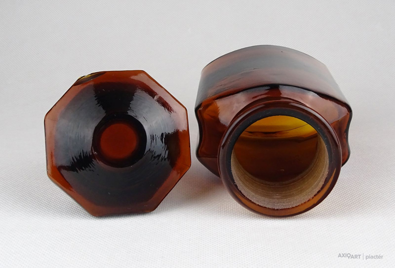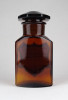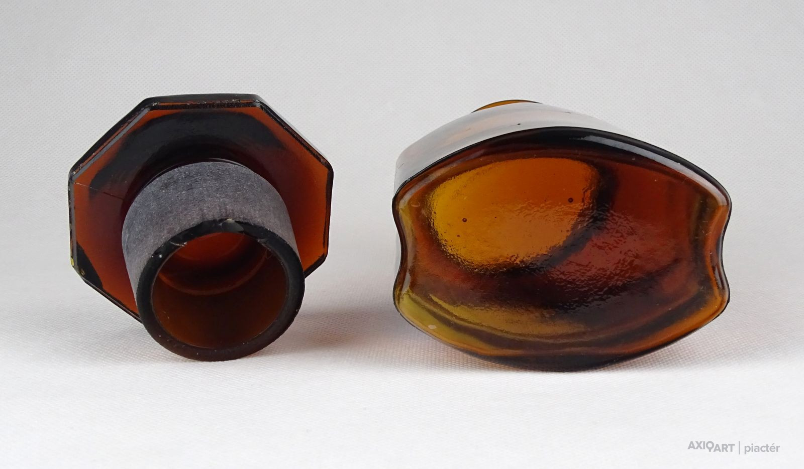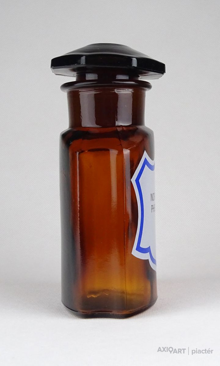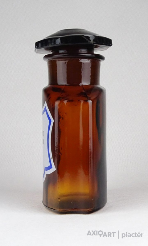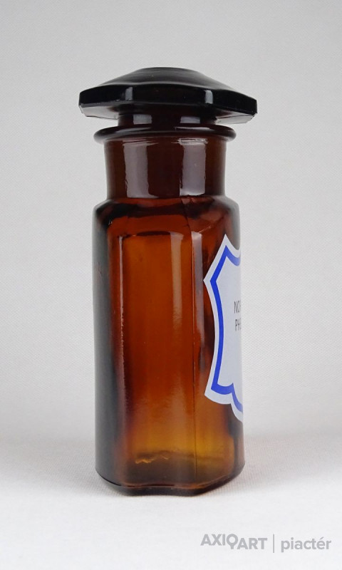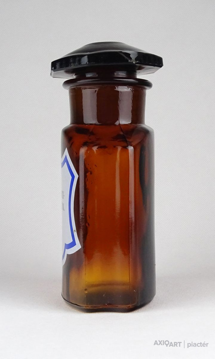 Régi, barna patika üveg, gyógyszerészeti tároló üveg. Dugóján kisebb lepattanás található.