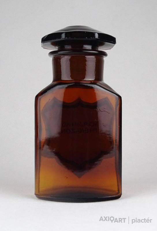 [0Y747/UZ-N] Régi, barna patika üveg, gyógyszerészeti tároló üveg. Dugóján kisebb lepattanás található. Oldalán címke, rajta felirat: NORAMINO-PHENAZON Magasság: 16 cm Szélesség: 8 cm Súly: 0.455 kg