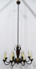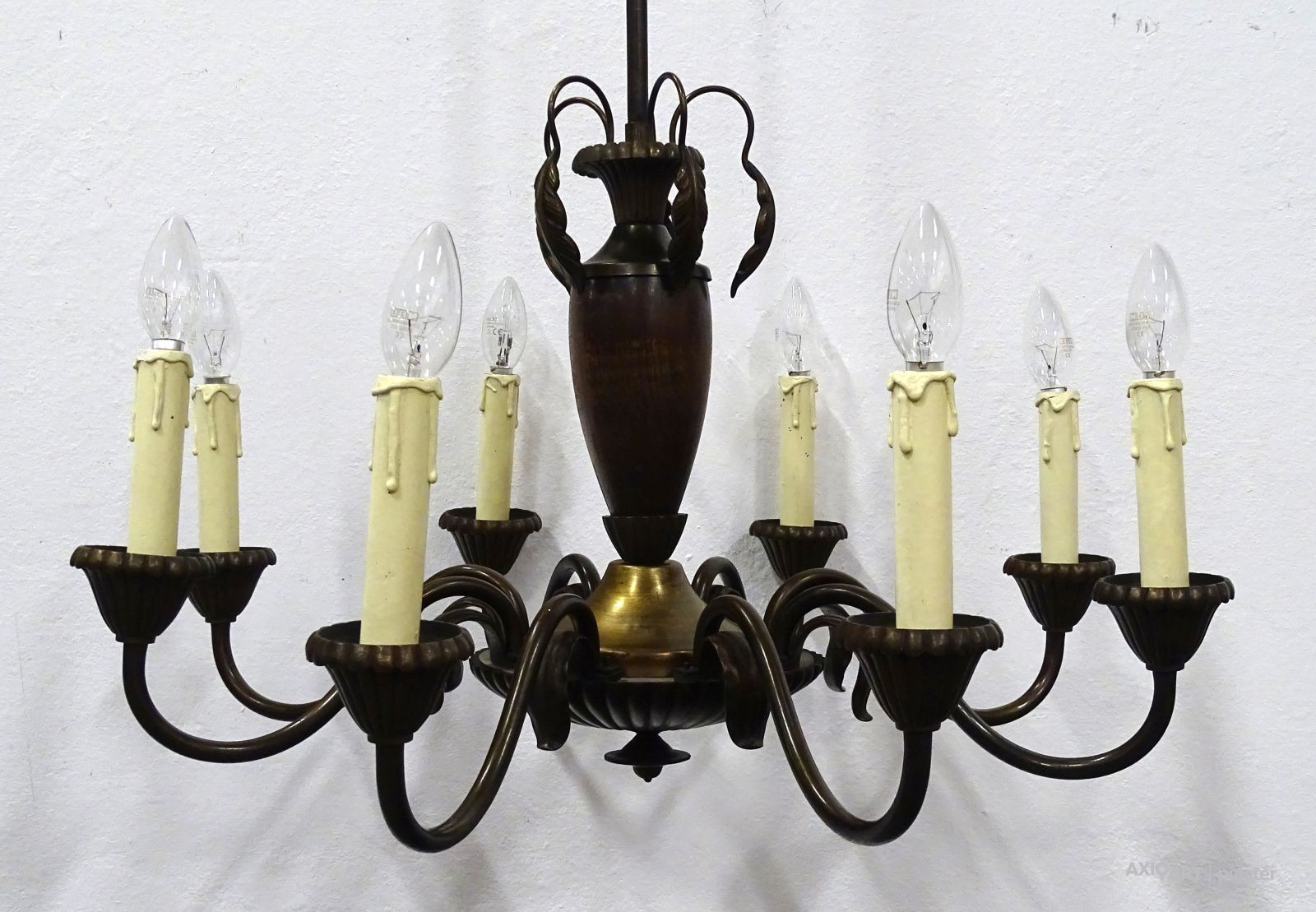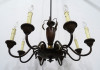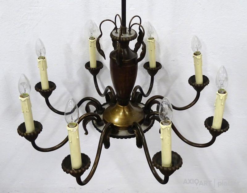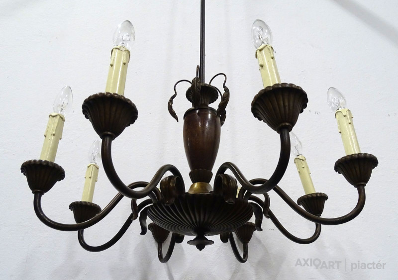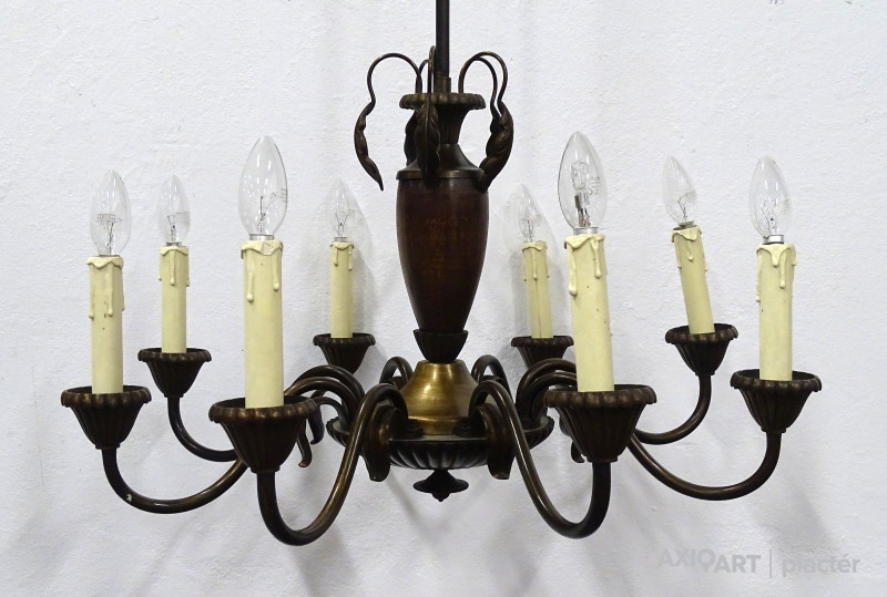 Régi, szép állapotú, nyolckarú réz csillár. A karok papírmasé gyertyákban végződnek. Kis méretű (E14) izzó való bele.