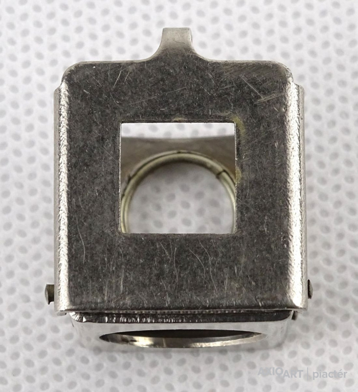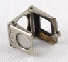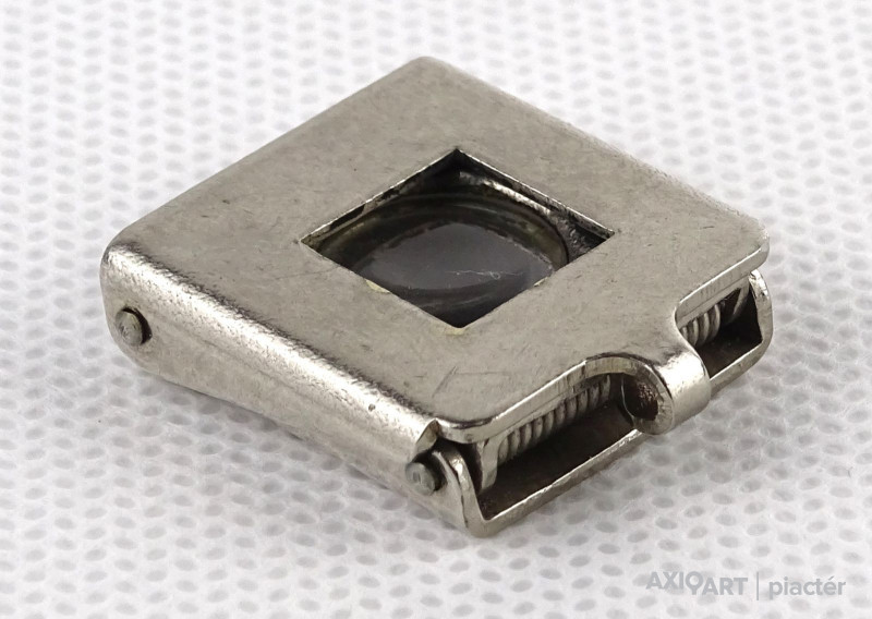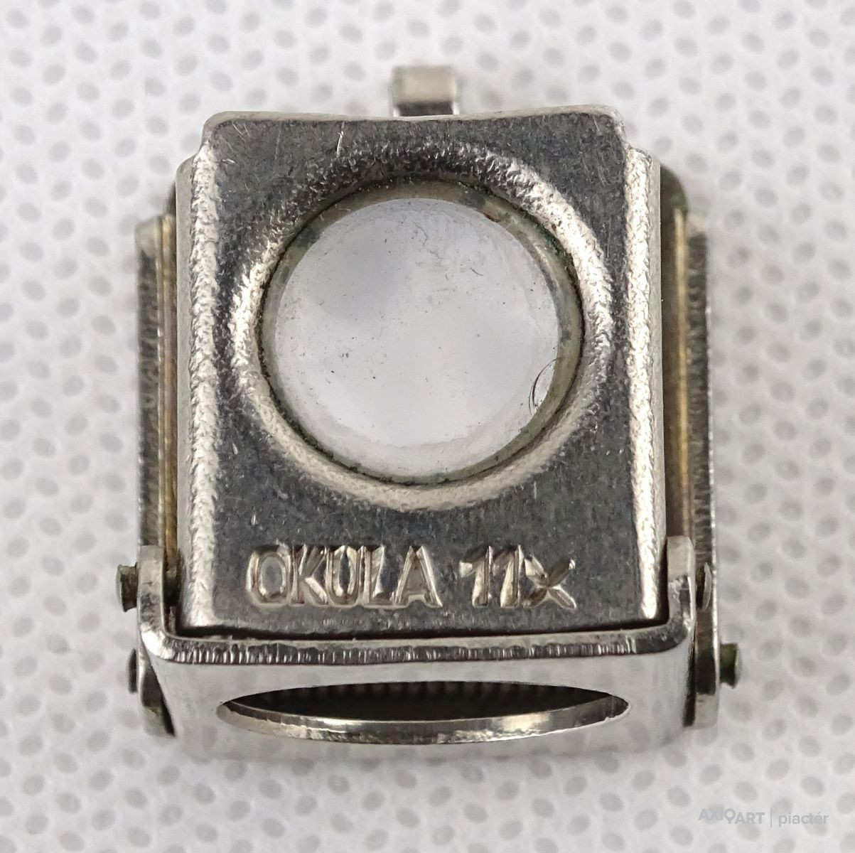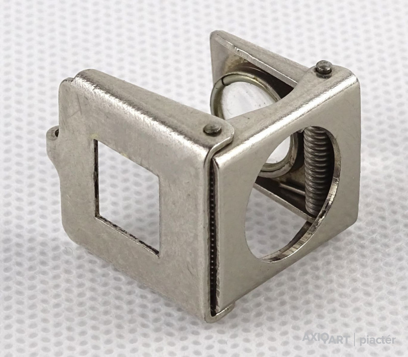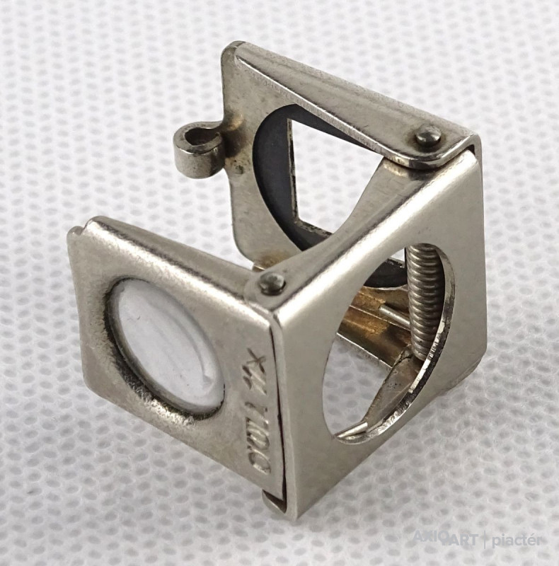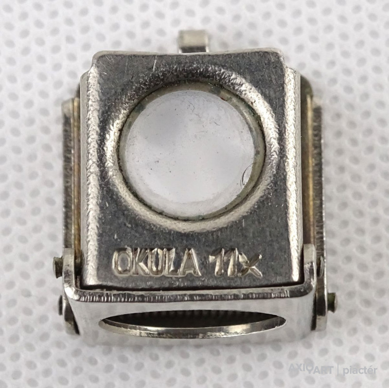 [1N894/X024/8] Régi, szép állapotú, összecsukható, akasztási lehetőséggel rendelkező nagyító. Talpas nagyító. Talpán egy 1cm x 1 cm-es keret található. Alkalmas szőnyeg szemszámlálásra. Rajta jelzés, felirat: OKULA 11X Magasság: 2.3 cm Szélesség: 2.2 cm Hosszúság: 2.5 cm Súly: 0.015 kg