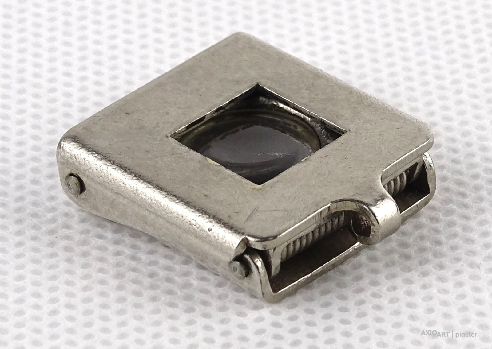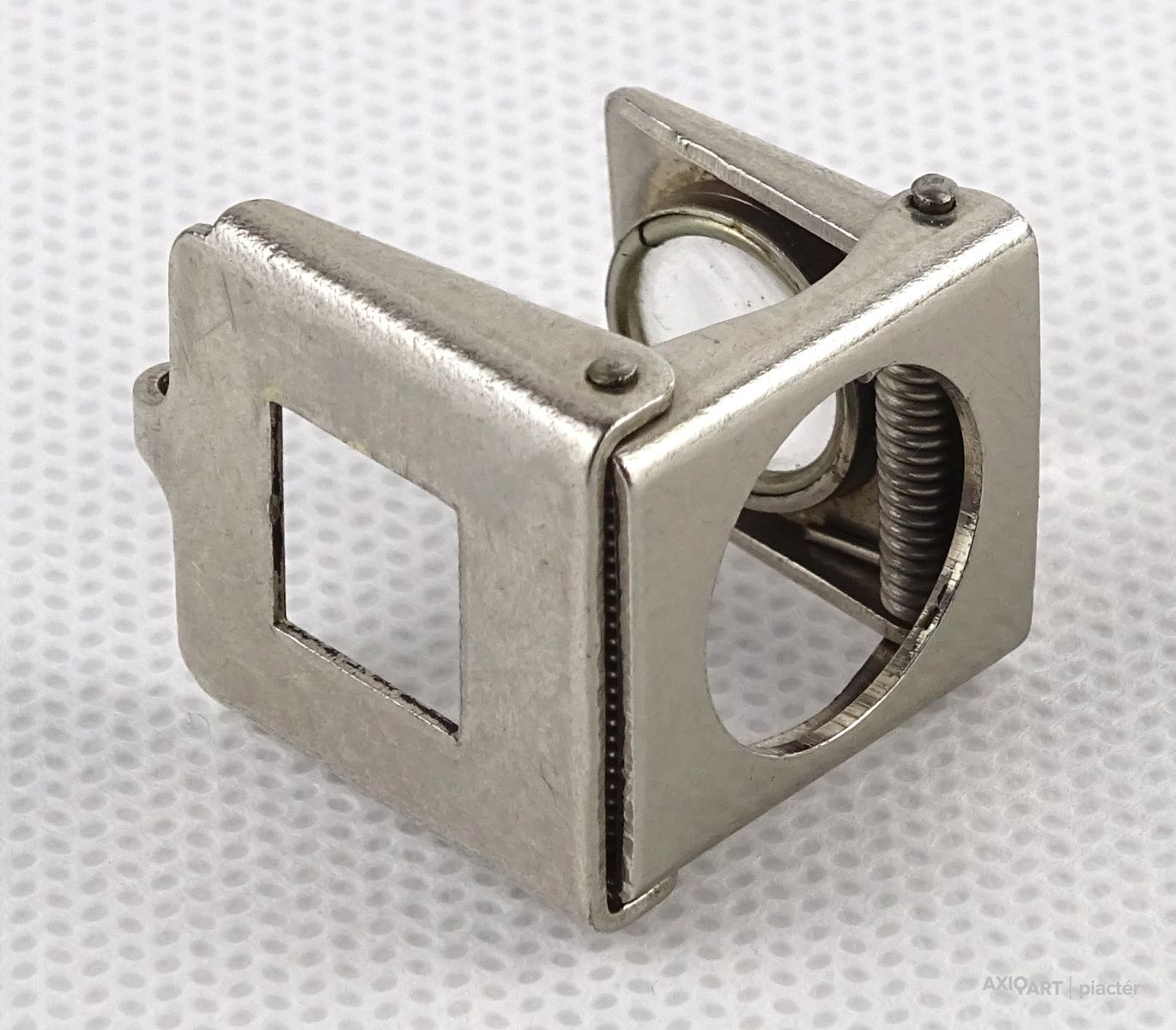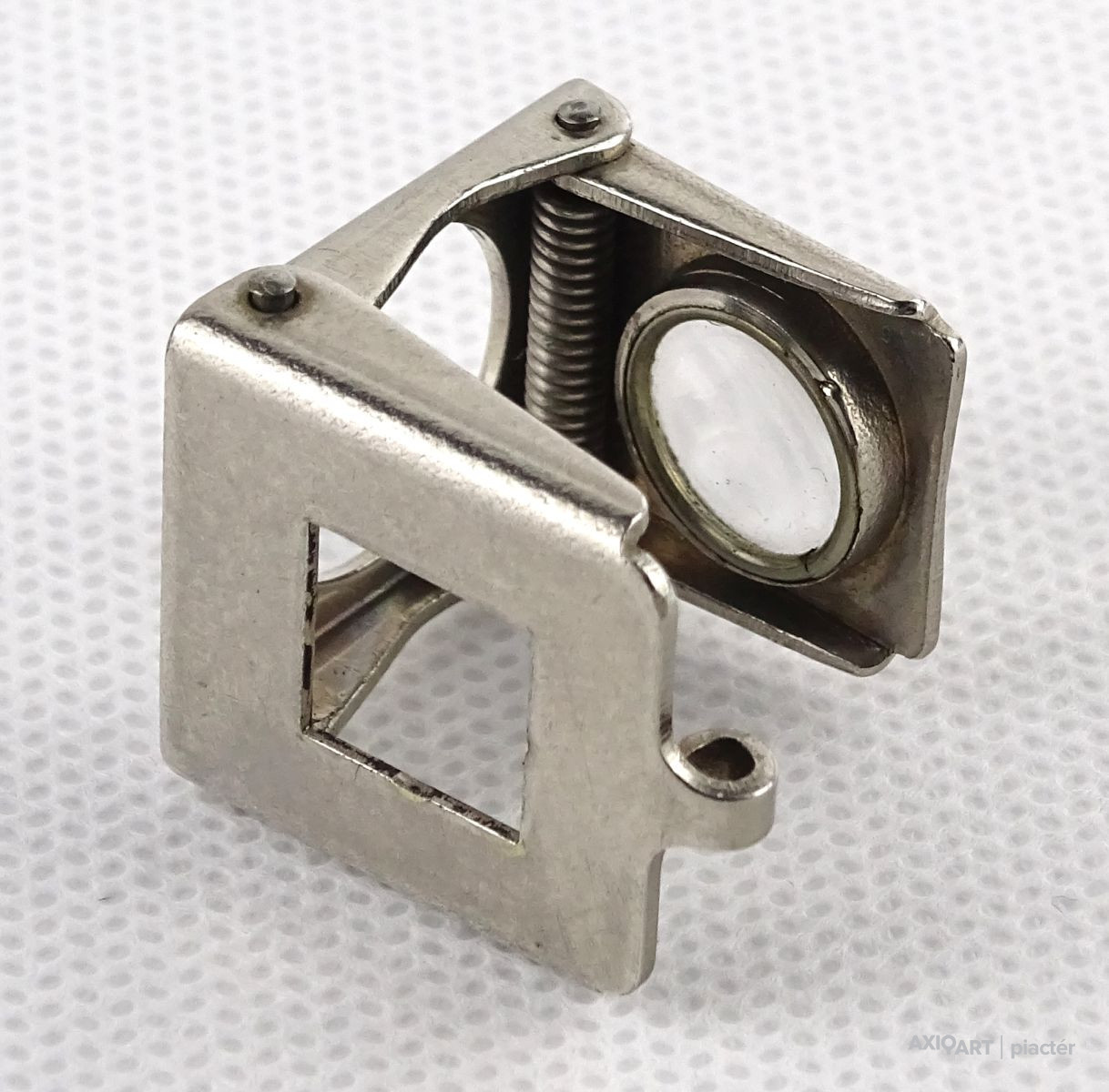 Régi, szép állapotú, összecsukható, akasztási lehetőséggel rendelkező nagyító. Talpas nagyító. Talpán egy 1cm x 1 cm-es keret található. Alkalmas szőnyeg szemszámlálásra.