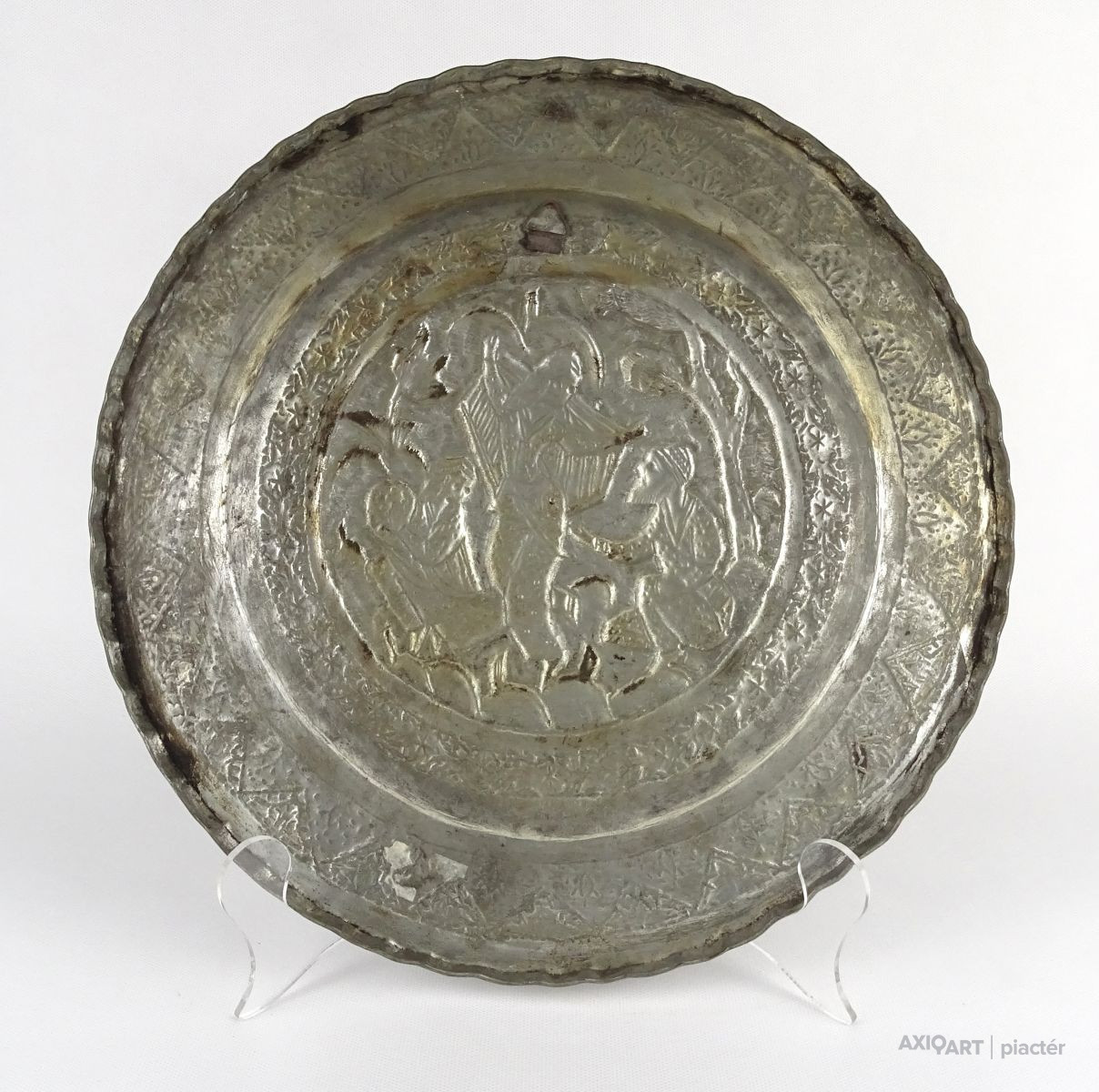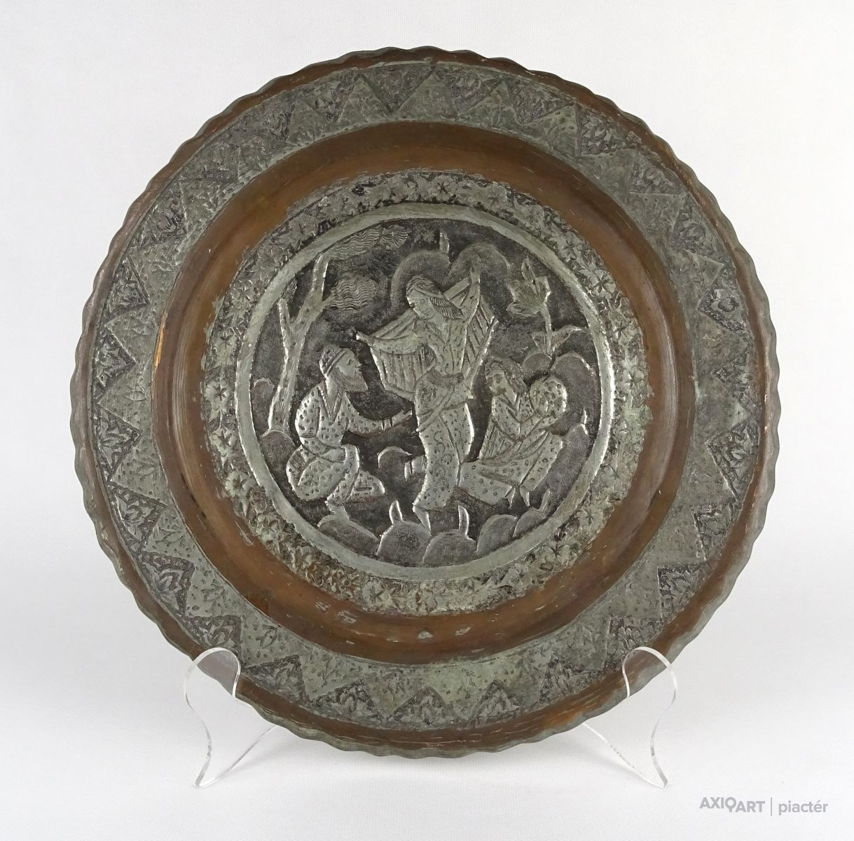 Szép állapotú, kalapált kézimunkával készített díszes, ónozott réz fali dísz tál. Falra akasztási lehetőséggel rendelkezik. Rajta középen háromalakos keleti táncos jelent látható.