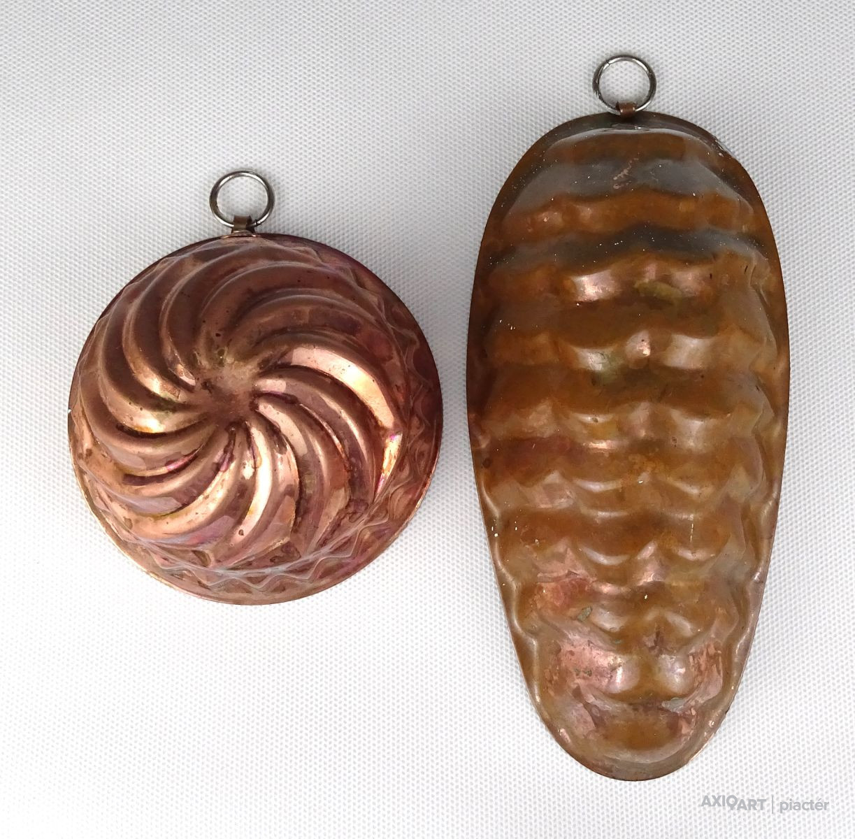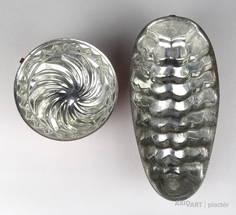 Régi konyhai, cukrászati eszköz pár. Akasztási lehetőséggel rendelkező sütemény sütő formák. Belső felületük ónózott.