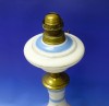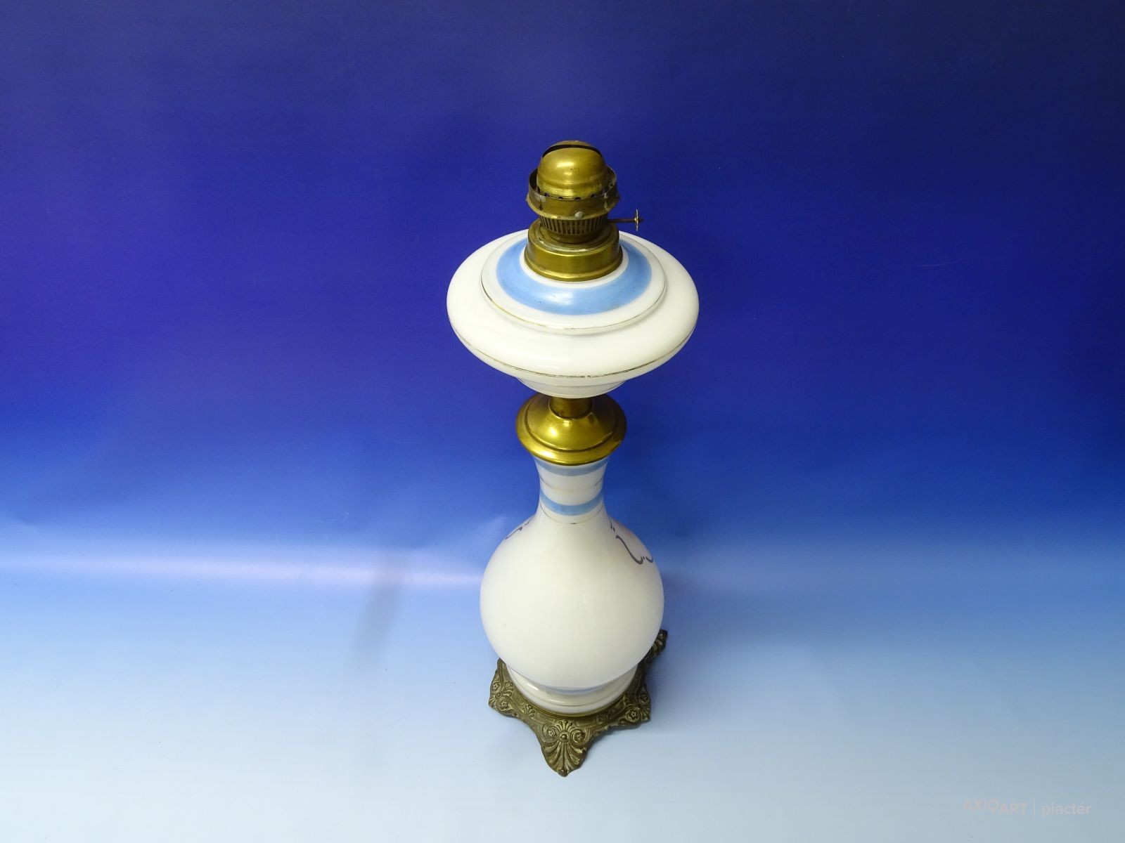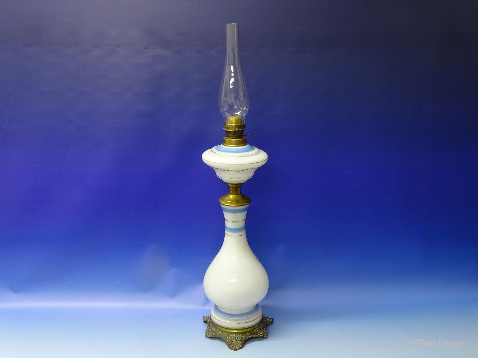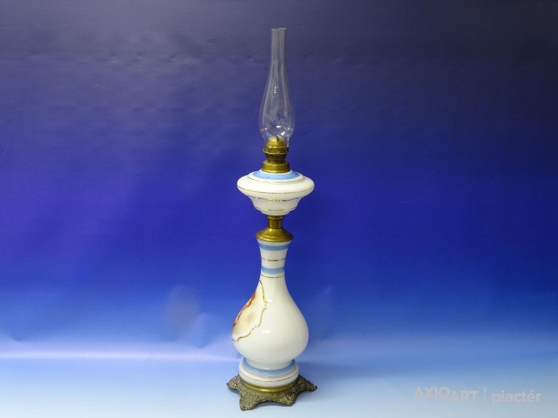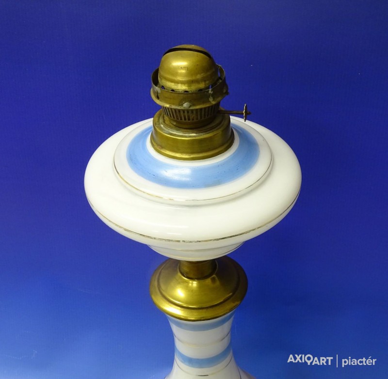 Nagyméretű, fehér üvegtestű petróleumlámpa, hibátlan üveg cilinderrel.