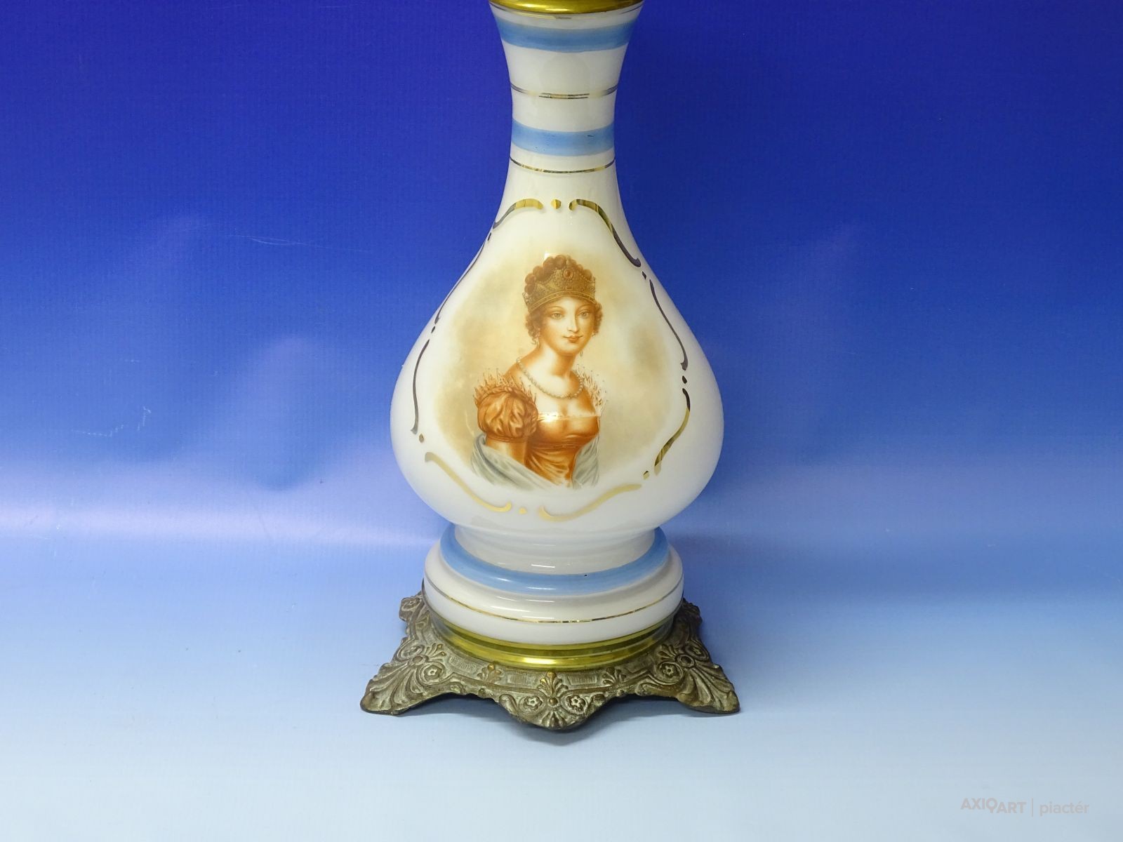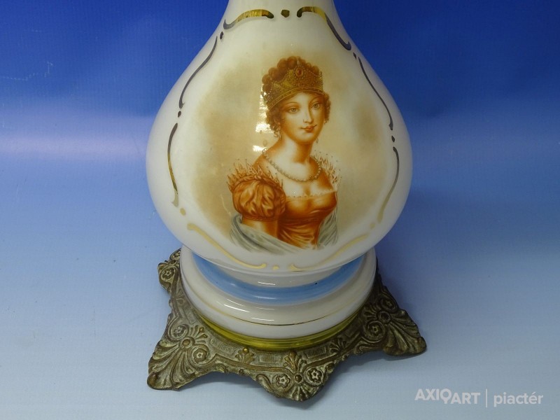 [0N007/UZ-N] 25% ÁRENGEDMÉNY MINDEN TERMÉKÜNKRE Dec. 14-ig Nagyméretű, fehér üvegtestű petróleumlámpa, hibátlan üveg cilinderrel. Az üveg testen Napóleon felesége, Jozefina francia császárné képe látható. Magasság: 57 cm Szélesség: 21 cm Súly: 2.065 kg