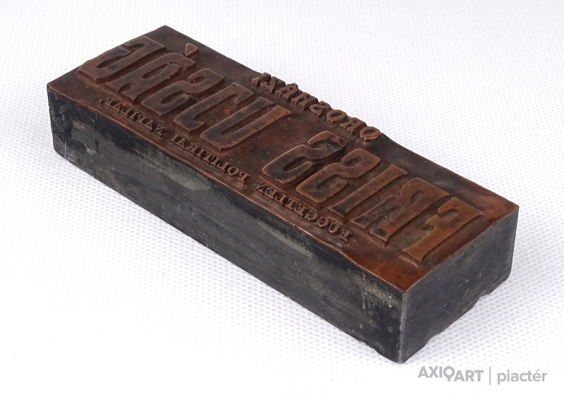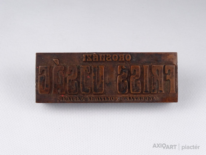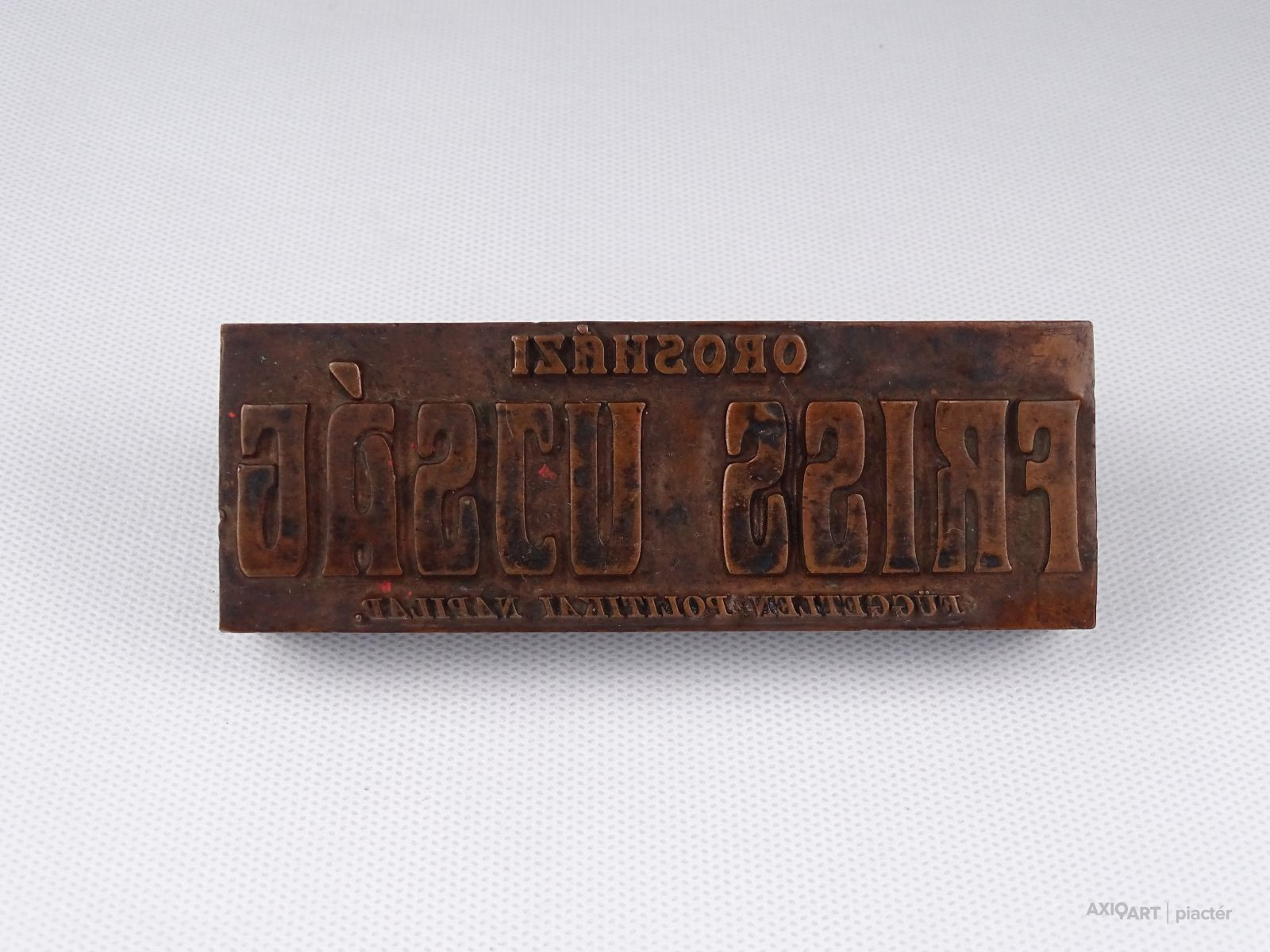 [1R333/FSZ] Régi ólomtömb, bronz nyomófelületű klisé. Az újság címlapja, az újság neve nyomtatódott vele. Feliratok: OROSHÁZI FRISS ÚJSÁG FÜGGETLEN POLITIKAI NAPILAP Magasság: 2.4 cm Szélesség: 4 cm Hosszúság: 11.3 cm Súly: 1.02 kg