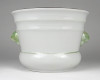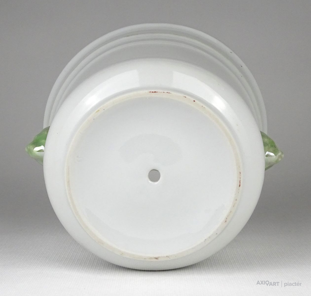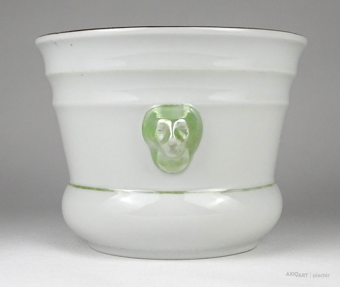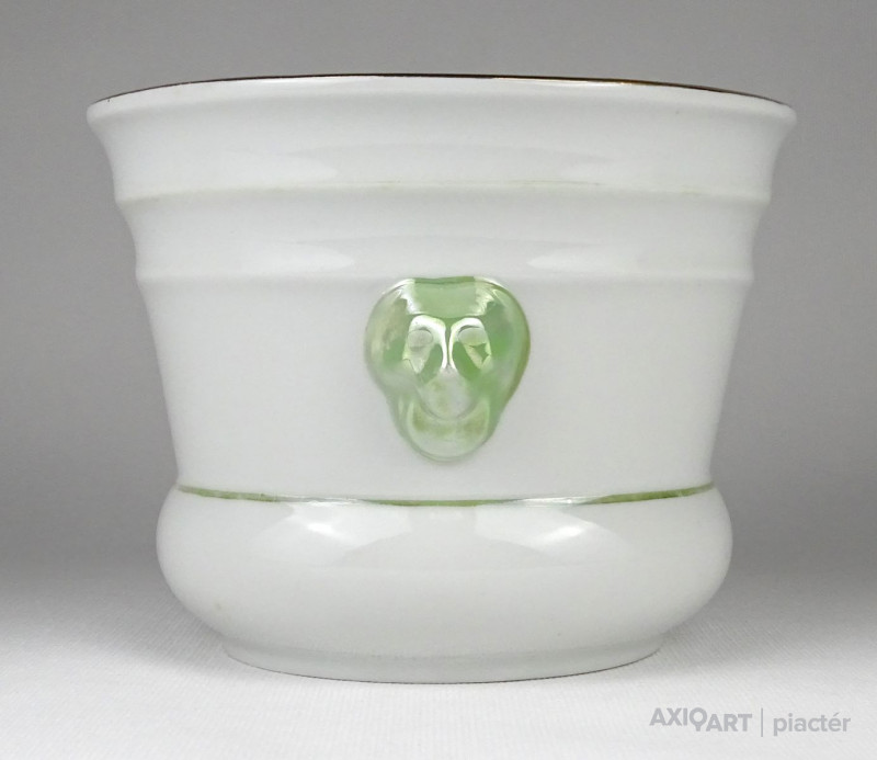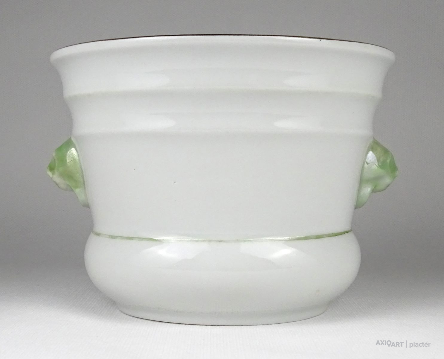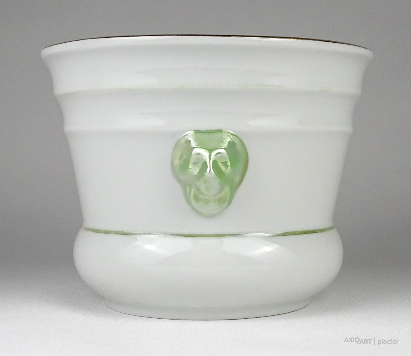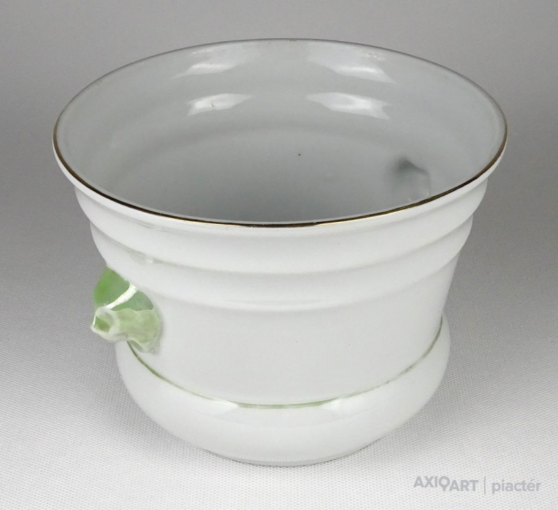 Régi, hibátlan állapotú porcelán kaspó. Szélén arany szegéllyel és két oldalán plasztikus oroszlán fej díszítéssel.