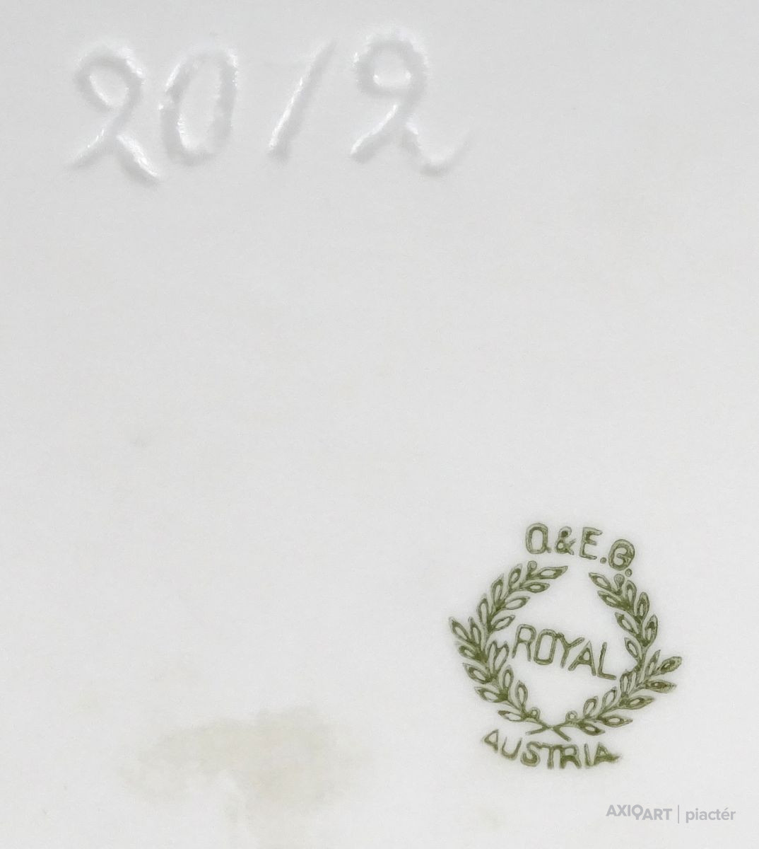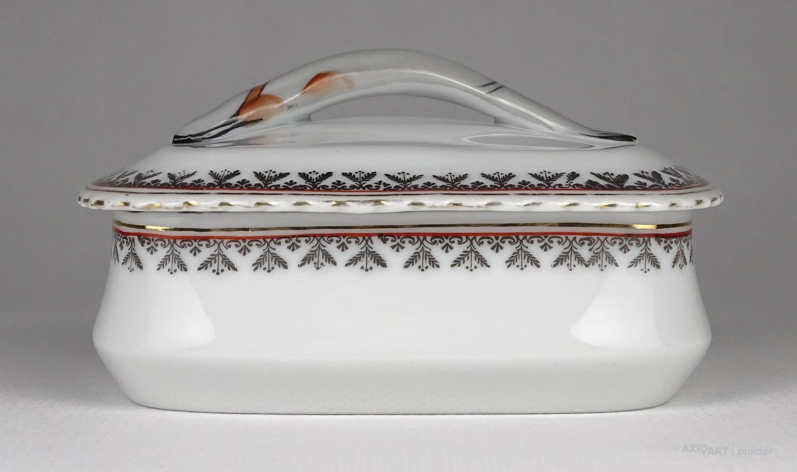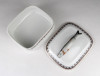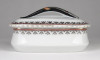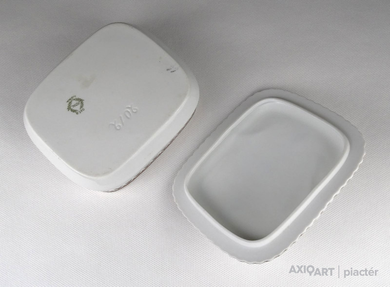 [1P646/UZ-K] Régi jelzett osztrák porcelán tál, fedővel. Kis méretű szardíniás kínáló tál. Alján zöld babérkoszorús jelzés: O. & E.G. (Oscar & Edgar Gutherz) ROYAL AUSTRIA Formaszám: 2012 Magasság: 7 cm Szélesség: 11.5 cm Hosszúság: 13.5 cm Súly: 0.35 kg
