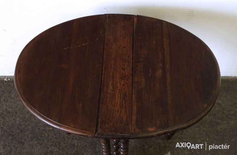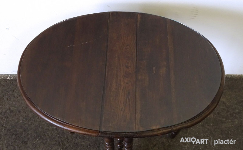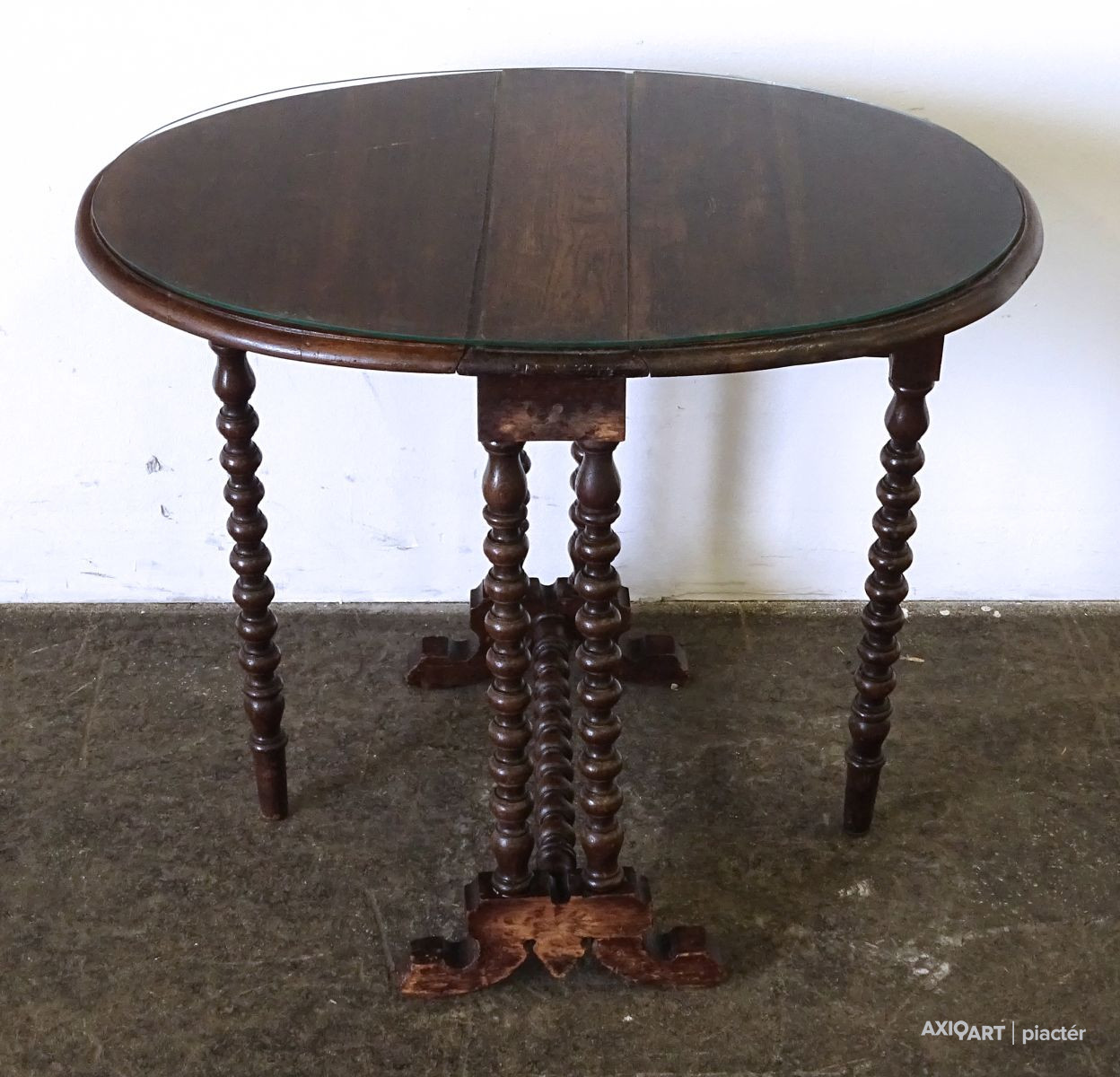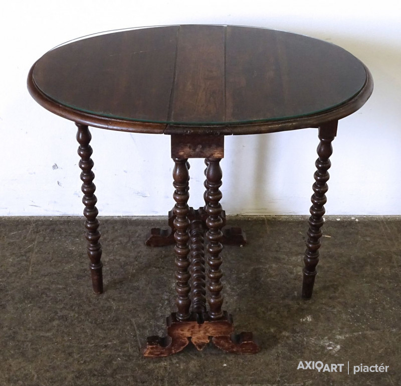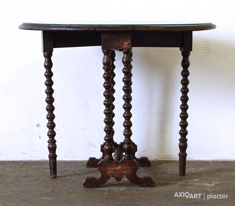Régi, szép állapotban megmaradt, kis méretű, ovális alakú összecsukható asztal, szalonasztal. Behajtható faragott lábakkal rendelkezik.