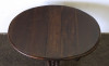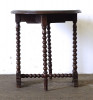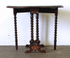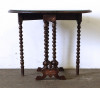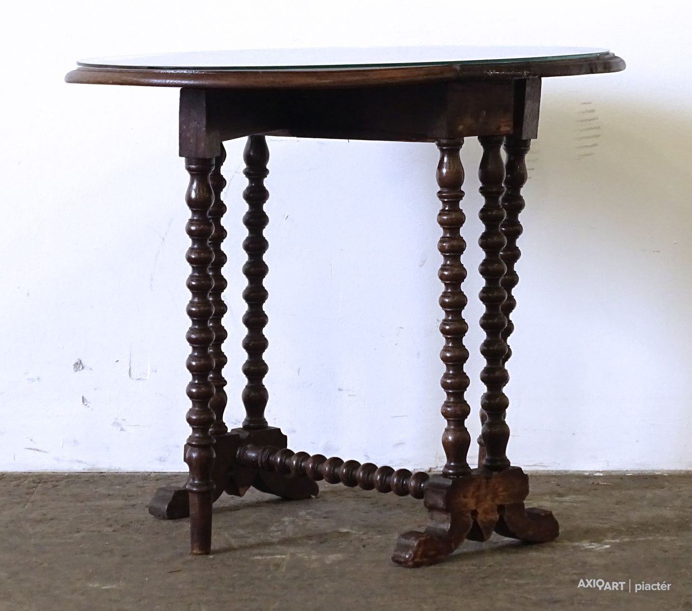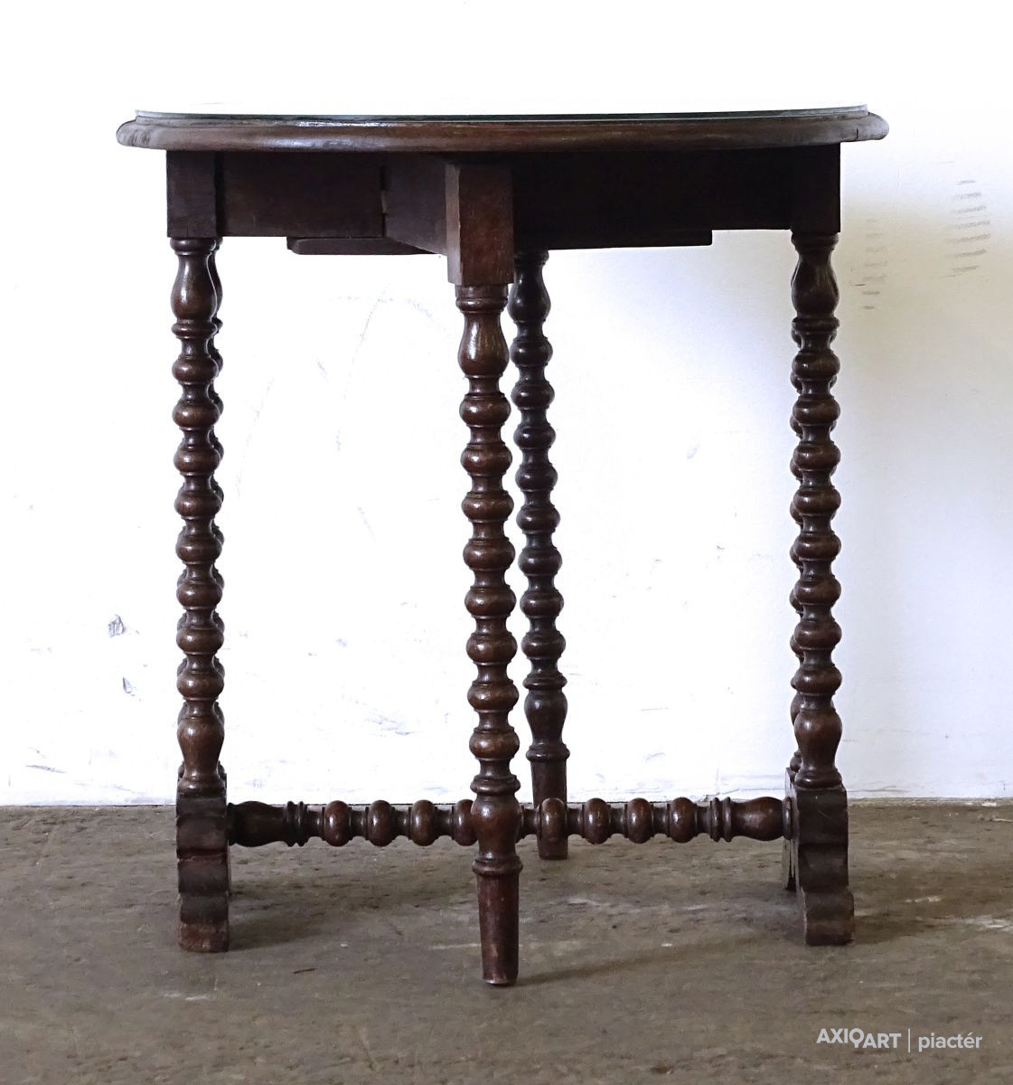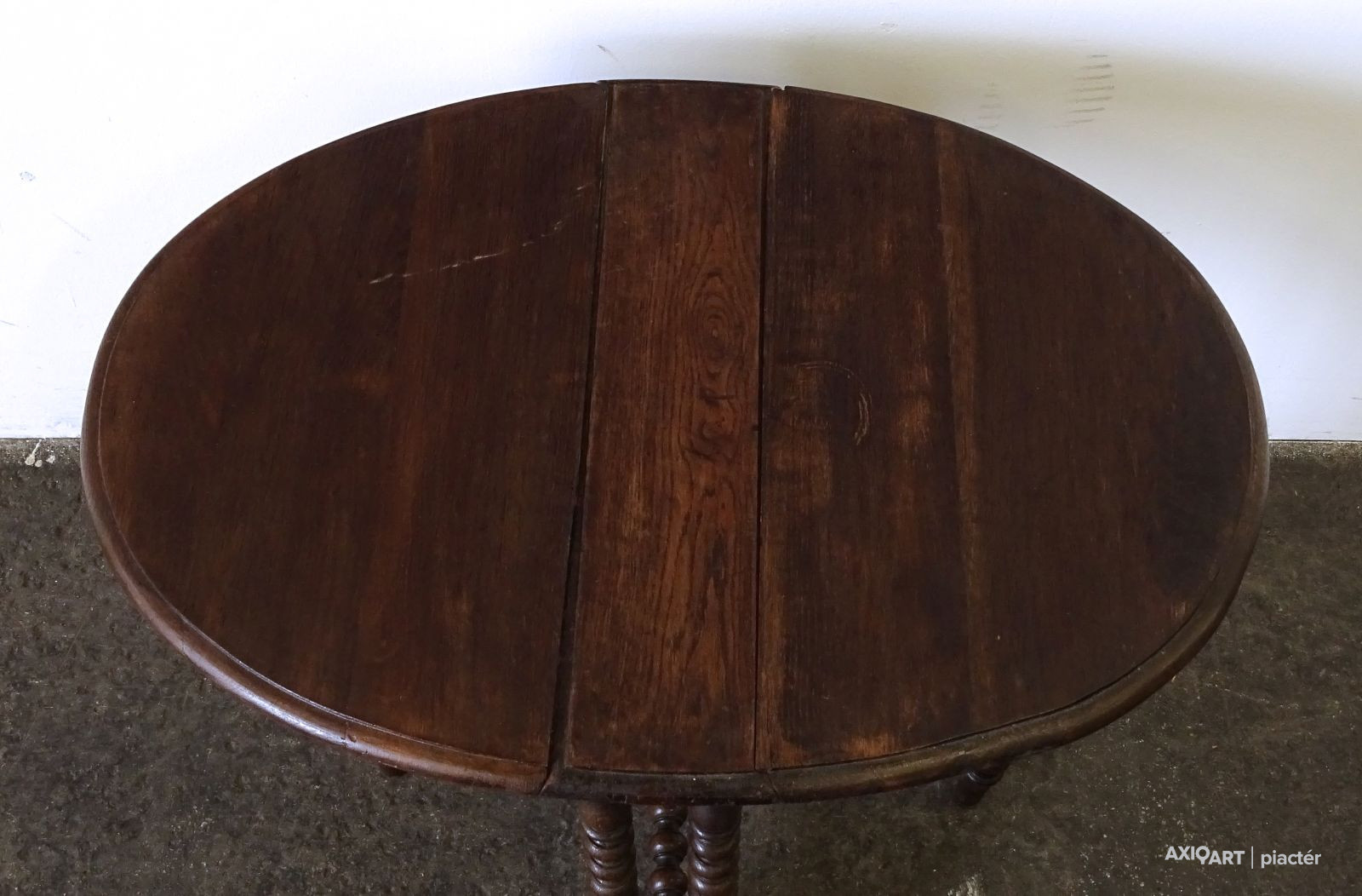 Régi, szép állapotban megmaradt, kis méretű, ovális alakú összecsukható asztal, szalonasztal. Behajtható faragott lábakkal rendelkezik.