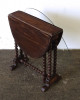 [1O123/KCS] Régi, szép állapotban megmaradt, kis méretű, ovális alakú összecsukható asztal, szalonasztal. Behajtható faragott lábakkal rendelkezik. Magasság: 57 cm Szélesség: 52.5 cm Hosszúság: 71 cm 13 cm keskenyre csukható össze.