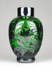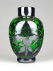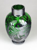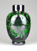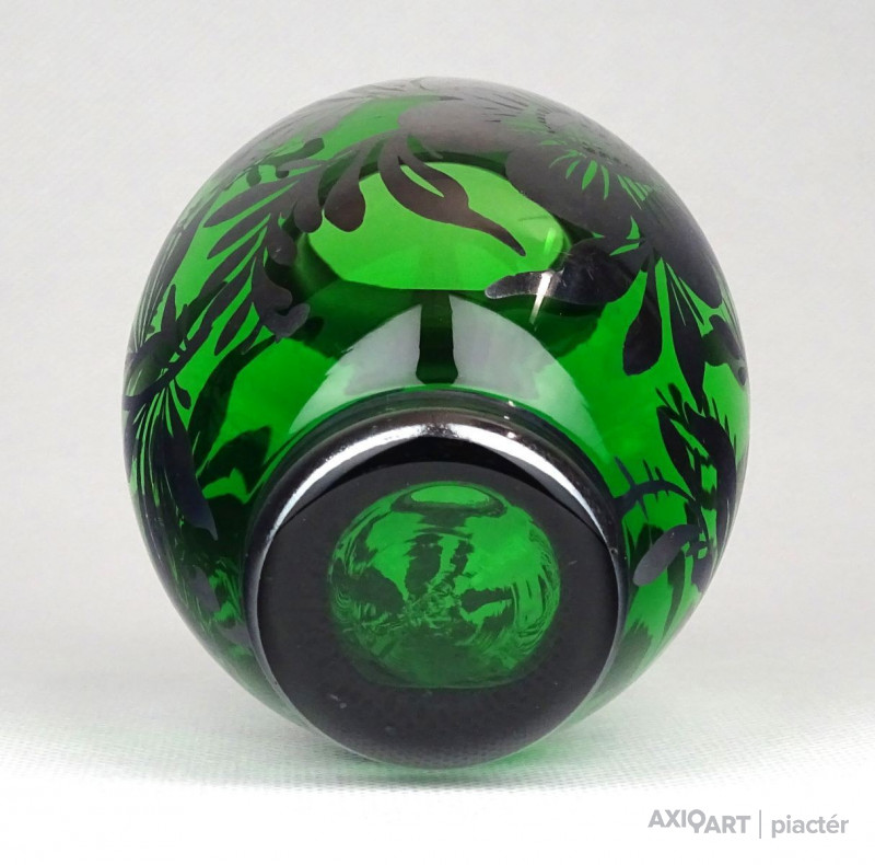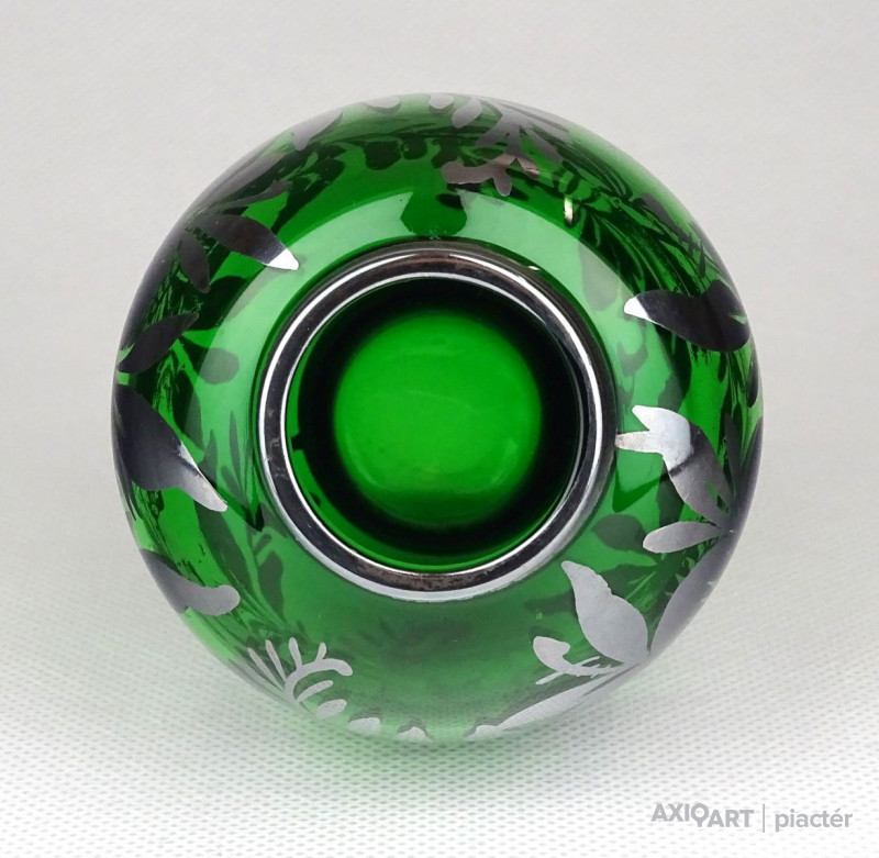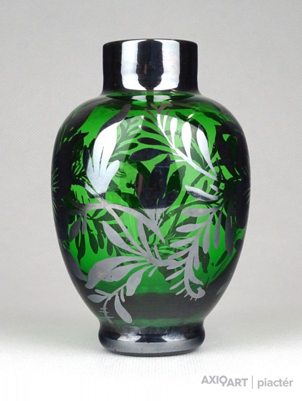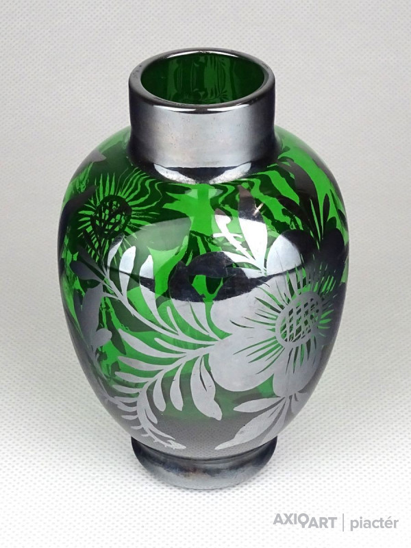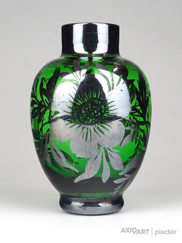 Régi, ezüsttel futtatott, sötétzöld színű üveg váza az 1900-as évek első feléből. Oldalán körben vastagon ezüstözött virágdíszítés látható.