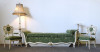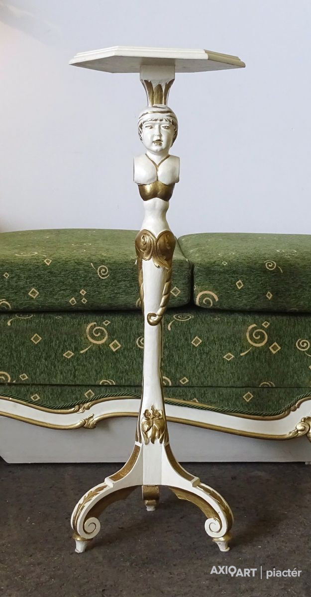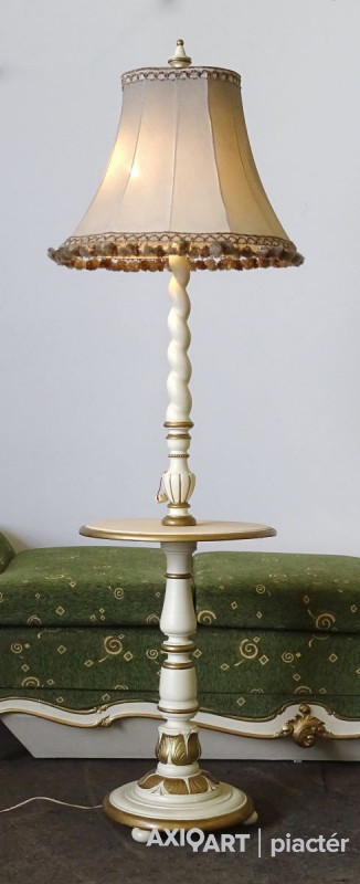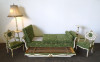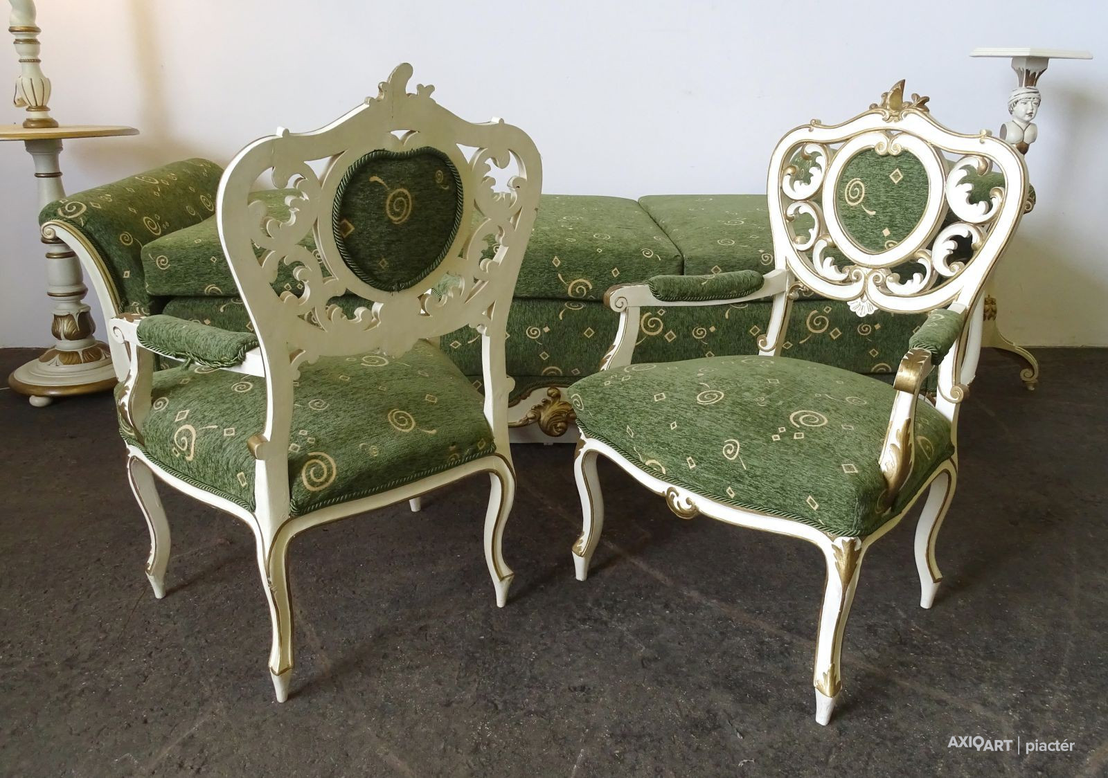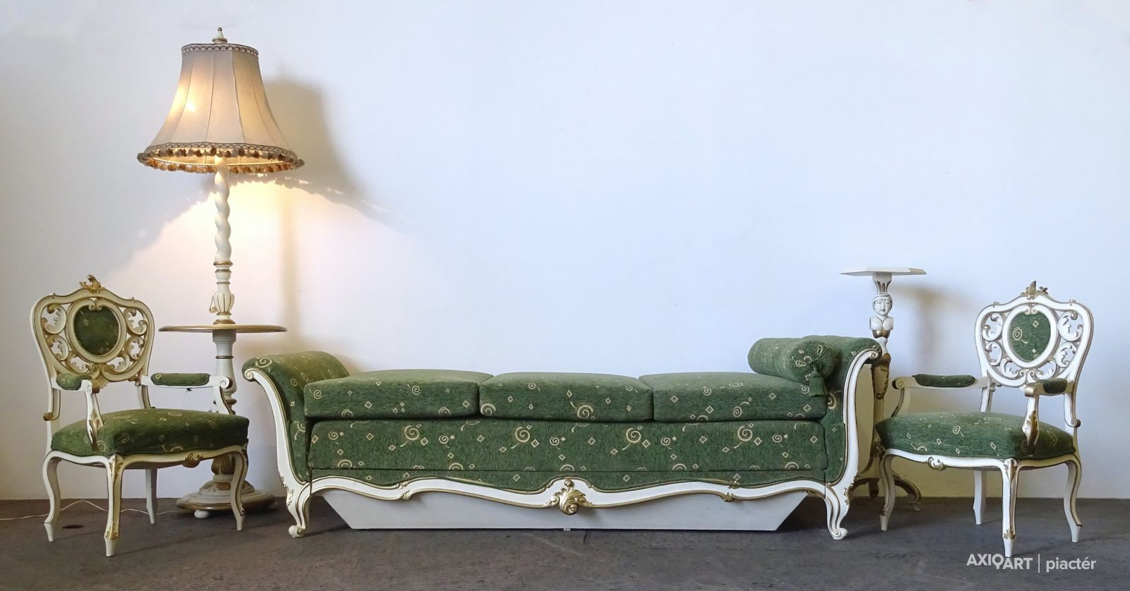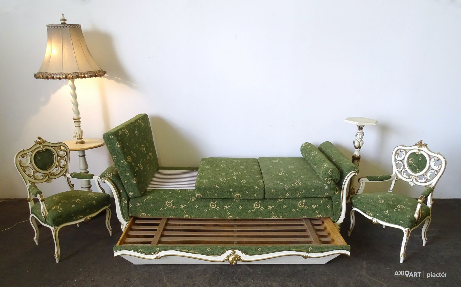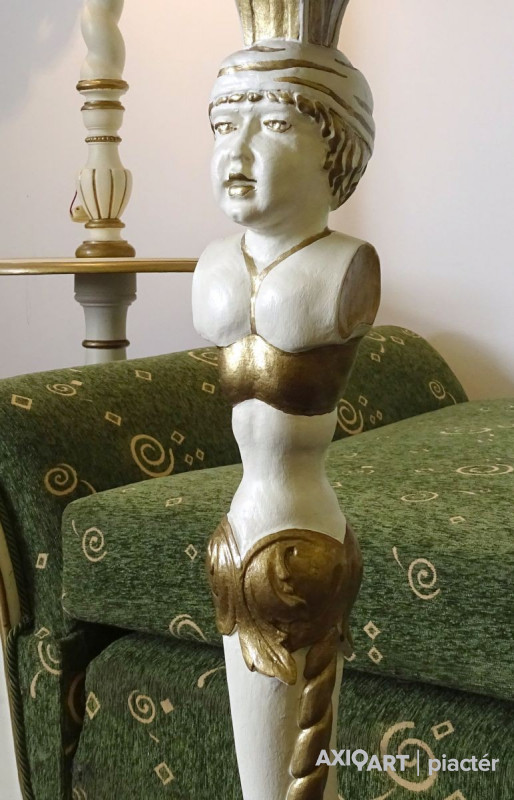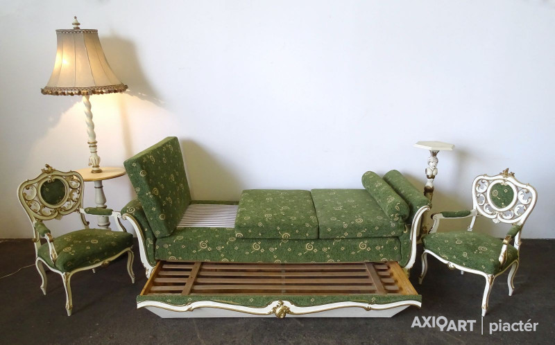 [1G651/KCS] Régi öt darabos, felújított, aranyozott szalongarnitúra. A garnitúra részei: - 2 darab karfás szék (97 x 62 x 50 cm) - 1 darab ágyneműtartós szófa (66 x 102 x 234 cm) - 1 darab emberalakos posztamens (103 x 33 cm) - 1 darab állólámpa (204 x 60 cm)