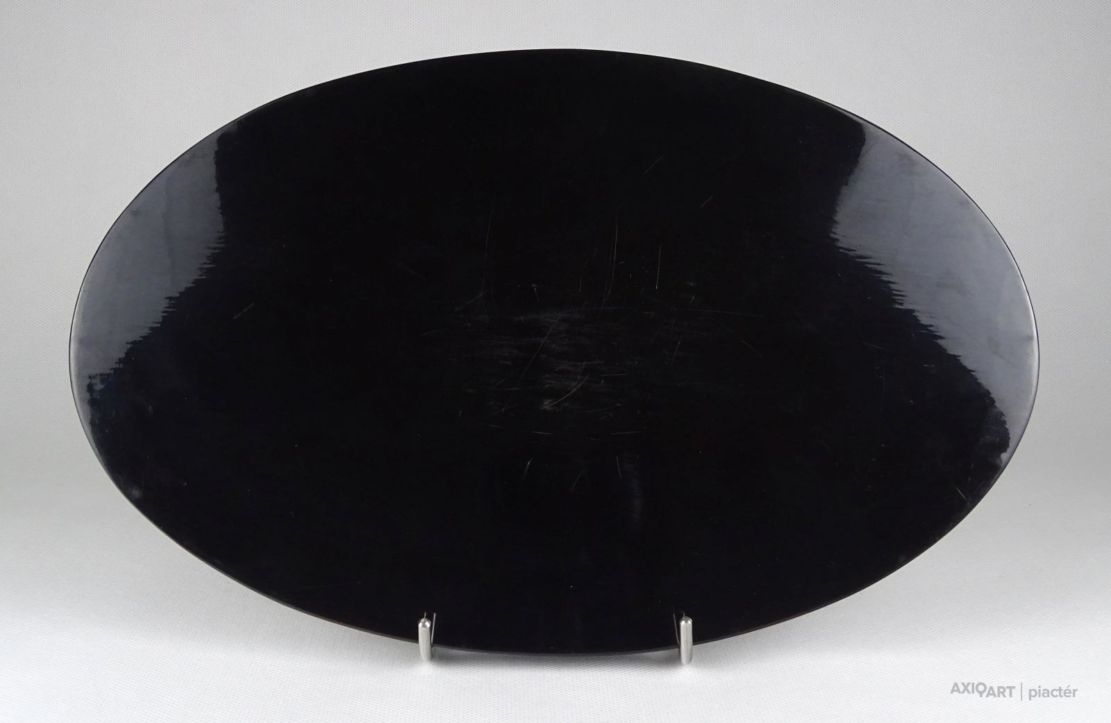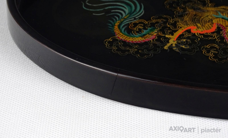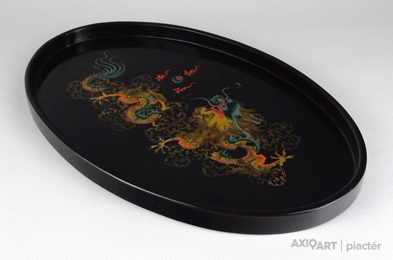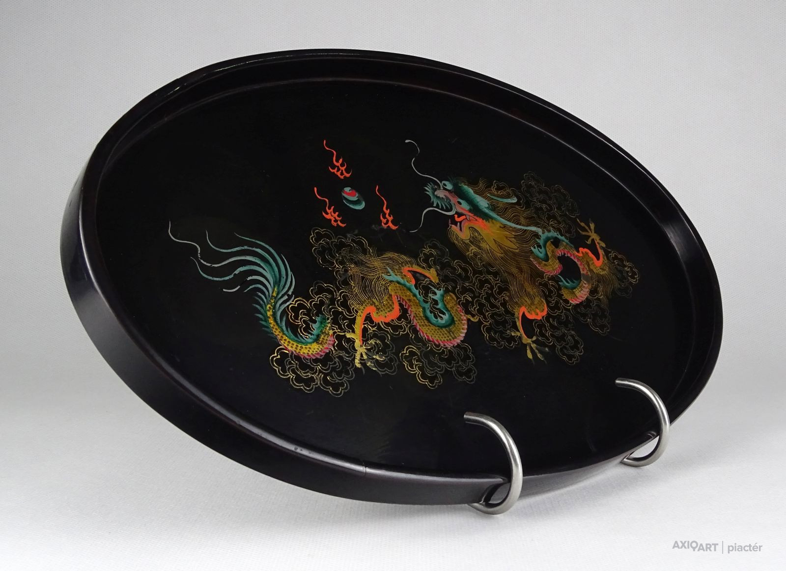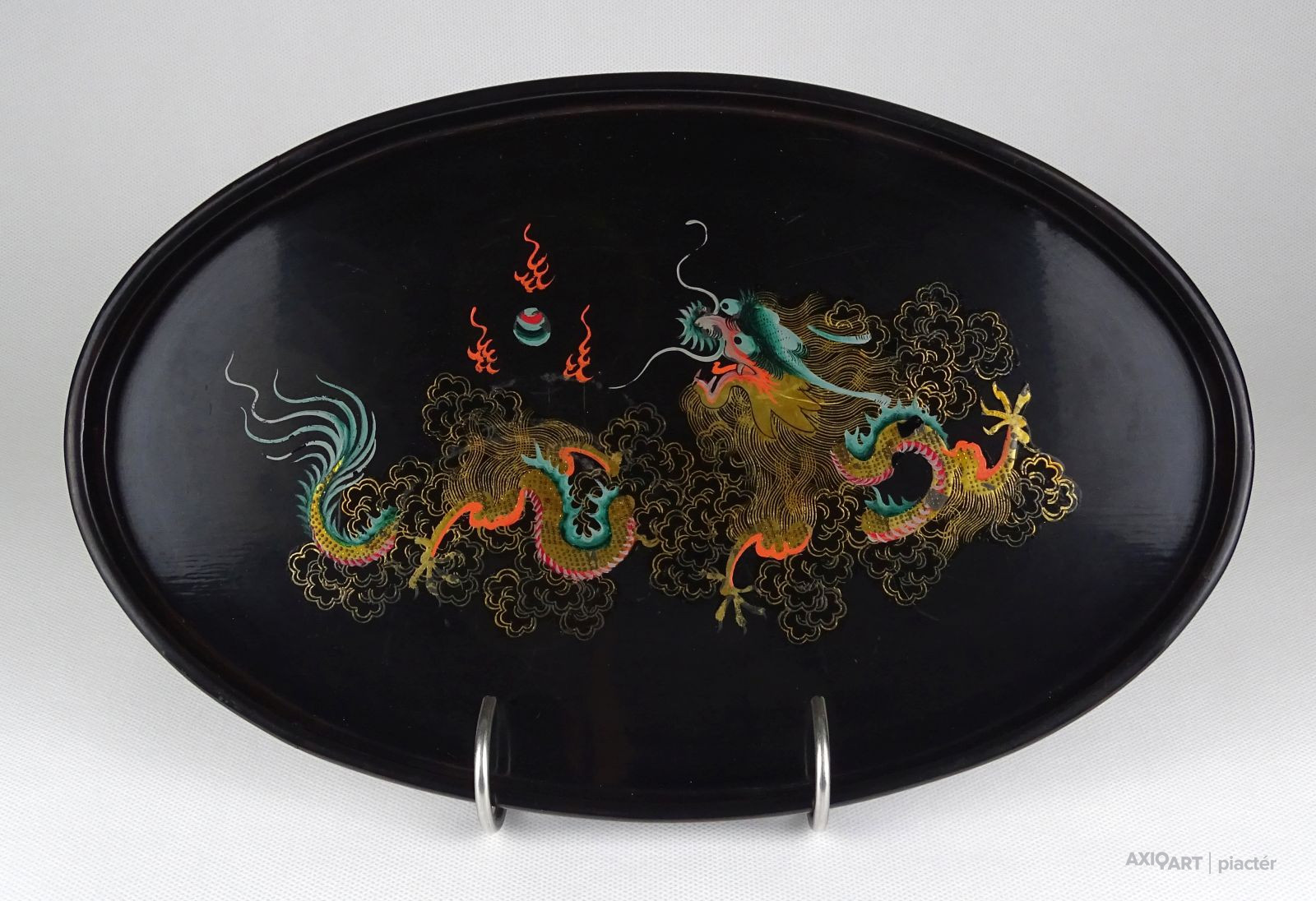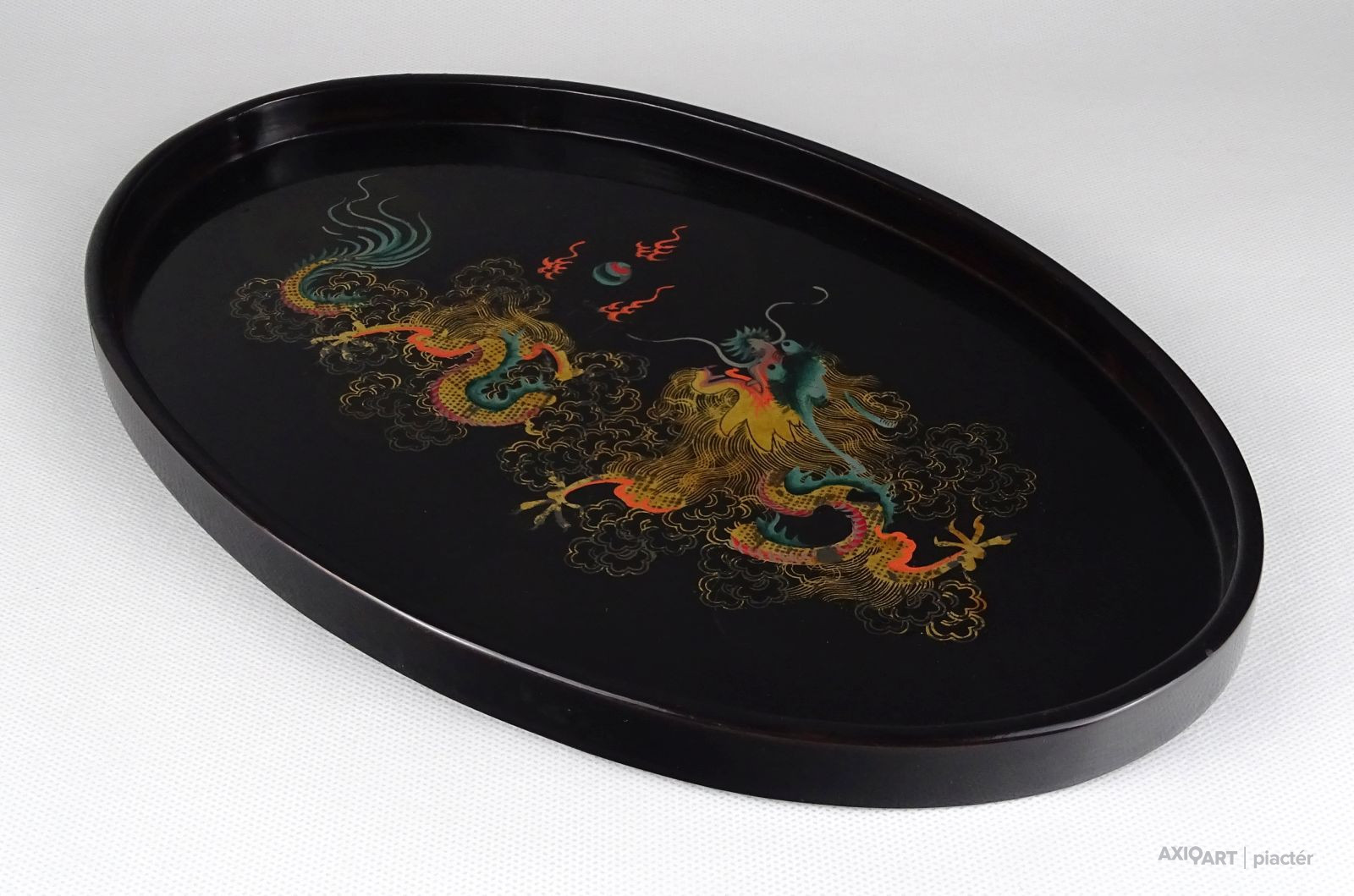 Szép állapotú, ovális alakú, fekete lakktálca, kínáló tál, tálca. Rajta kézzel festett kínai sárkány díszítés látható.