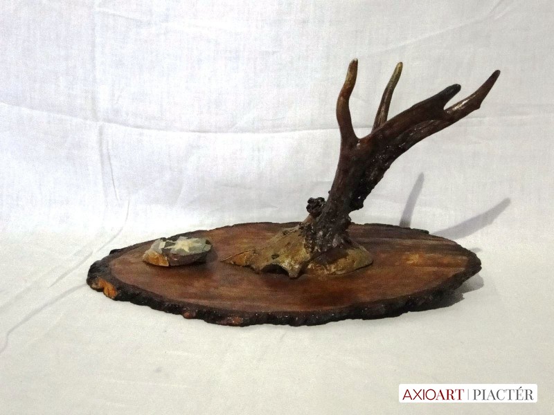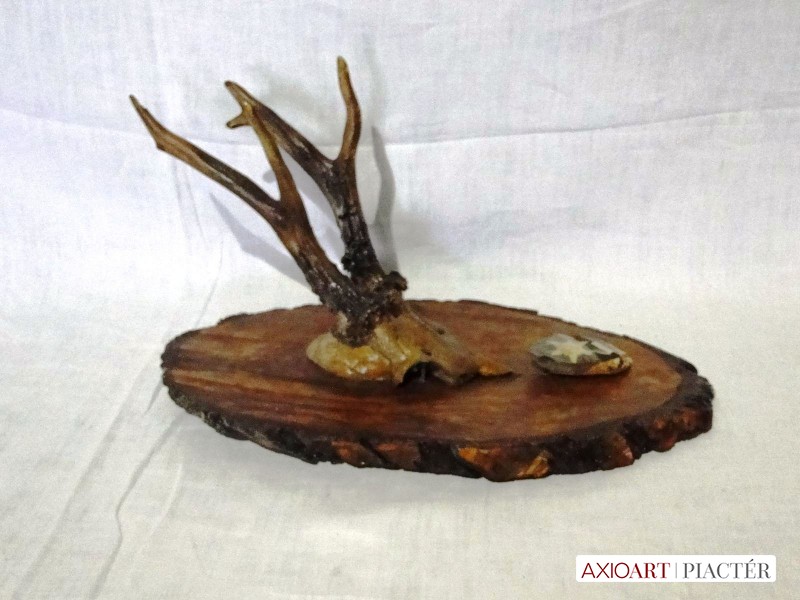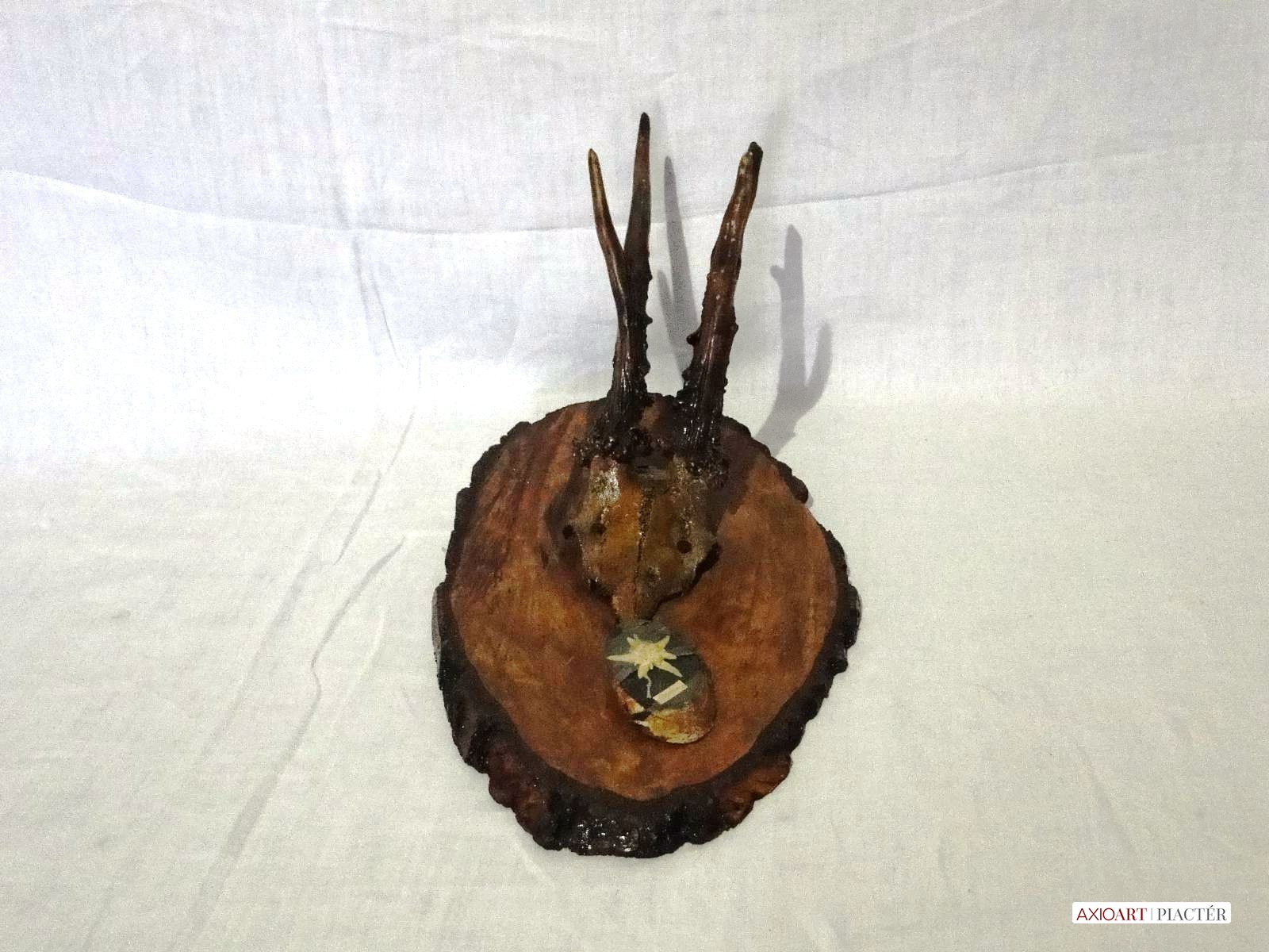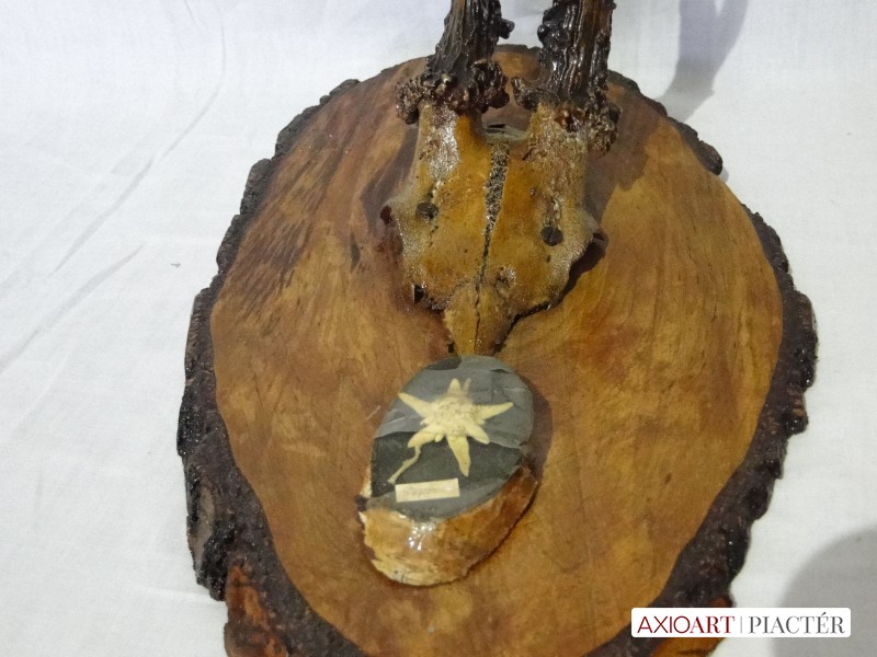 Régi őz lakozott trófea , agancs fotón látható állapotban, hatalmas fa talpon, falra akasztható. A talapzaton egy kisebb fa talpon havasi gyopár látható.