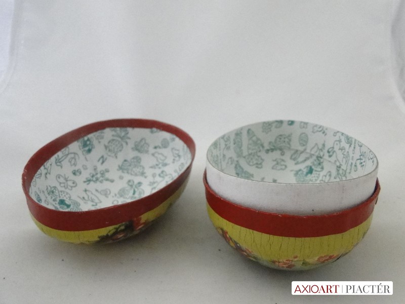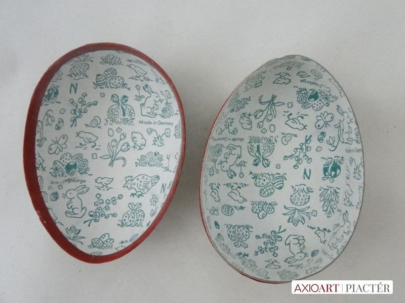 Régi német papírmasé nyuszi és csibe mintás tojás, csokitartó, drazsé tartó kisdoboz.