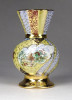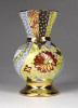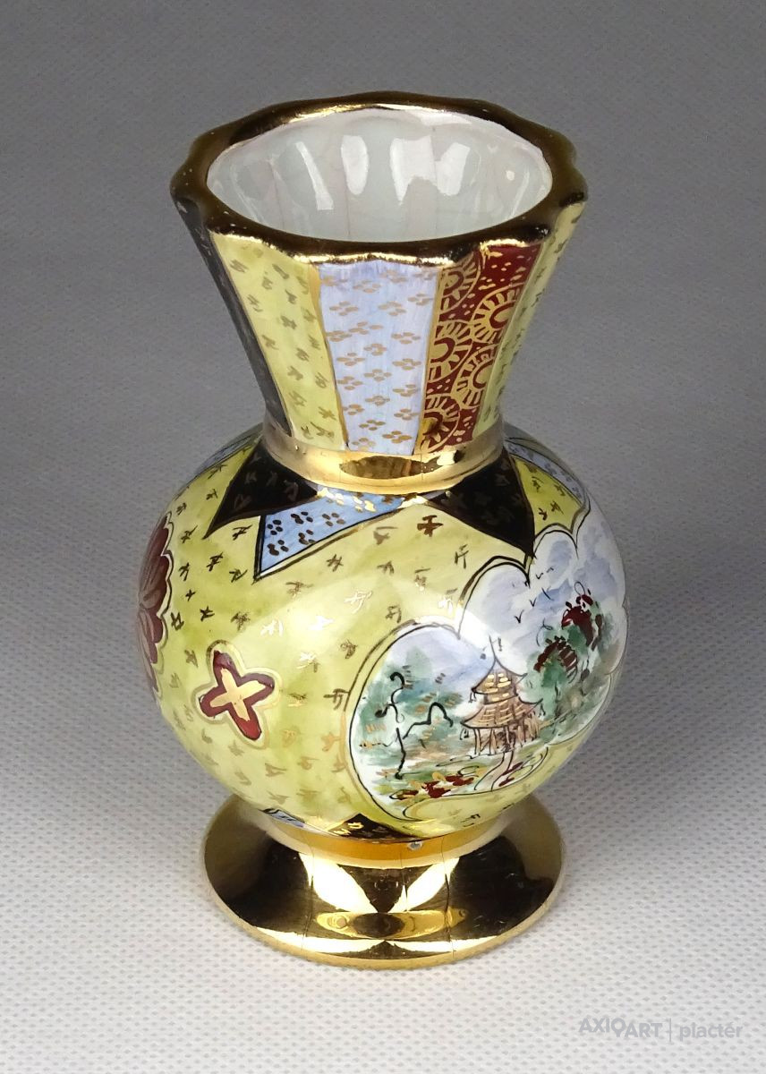 Régi, hibátlan állapotú, kis méretű porcelán váza, ibolya váza. Gazdagon aranyozott, a váza teljes felülete kézi festéssel díszítve, oldalán japán épület, pagoda díszítéssel.