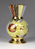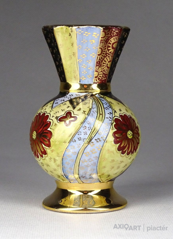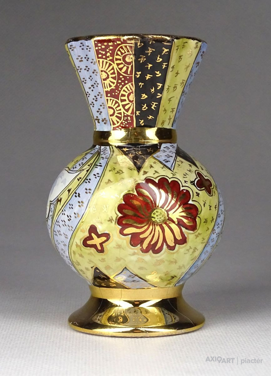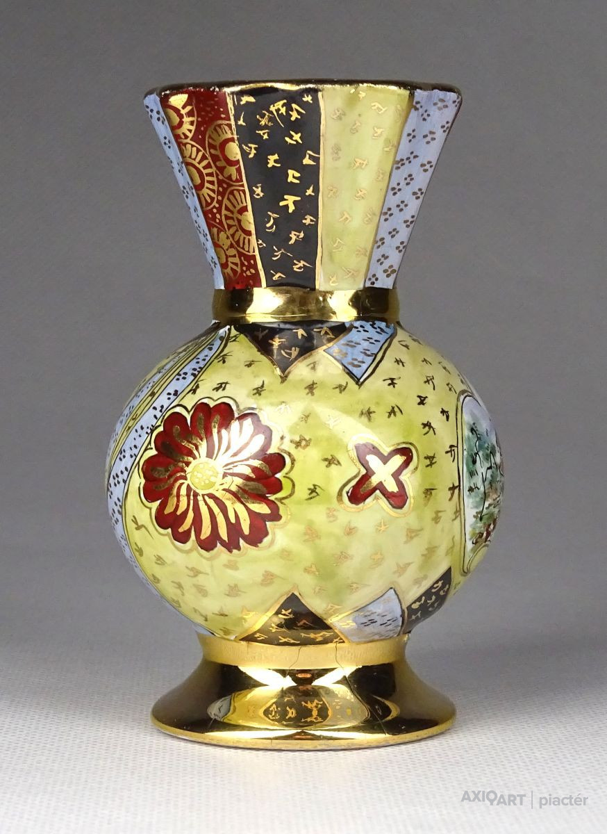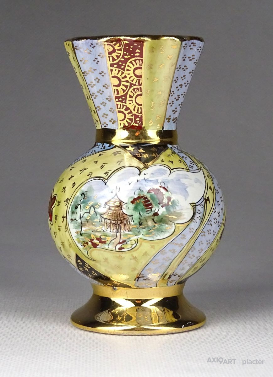 [1G355/X208] Régi, hibátlan állapotú, kis méretű porcelán váza, ibolya váza. Gazdagon aranyozott, a váza teljes felülete kézi festéssel díszítve, oldalán japán épület, pagoda díszítéssel. Alján kézi festő jelzése arannyal: PATAKY PIRI Magasság: 9.5 cm Szélesség: 5.7 cm Súly: 0.1 kg