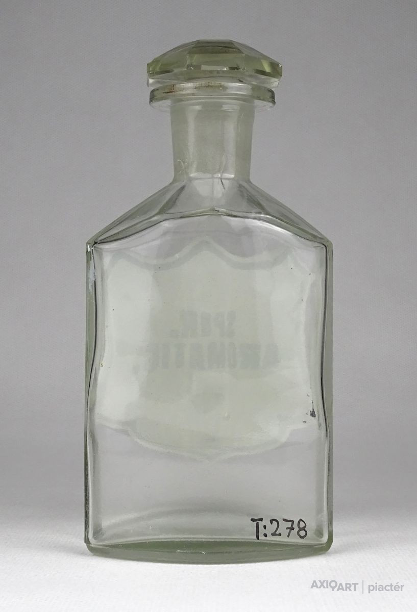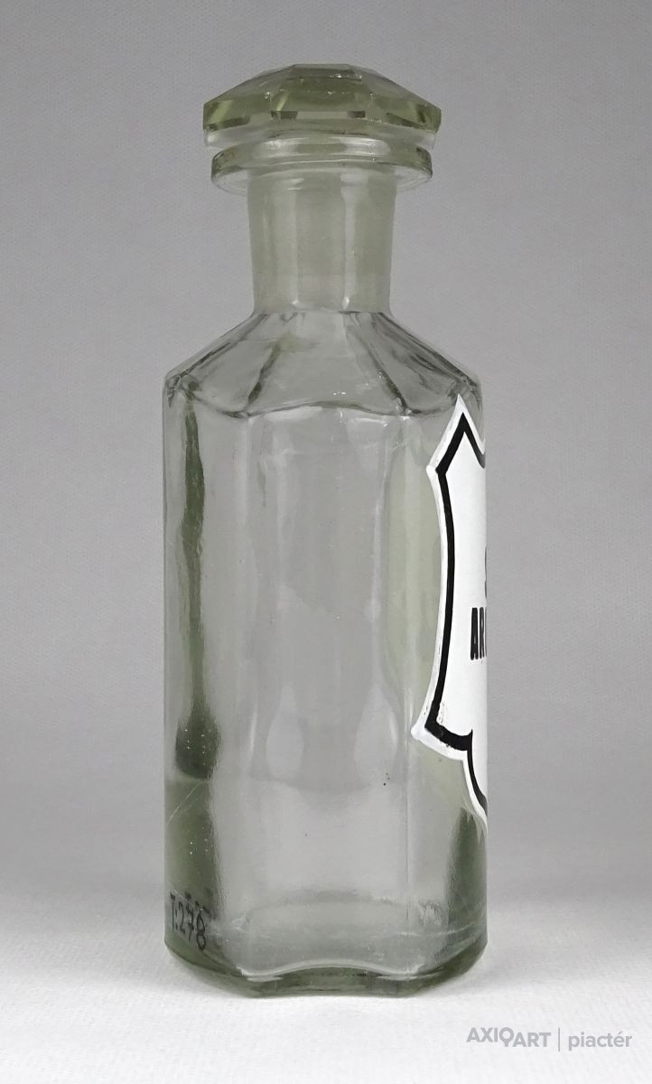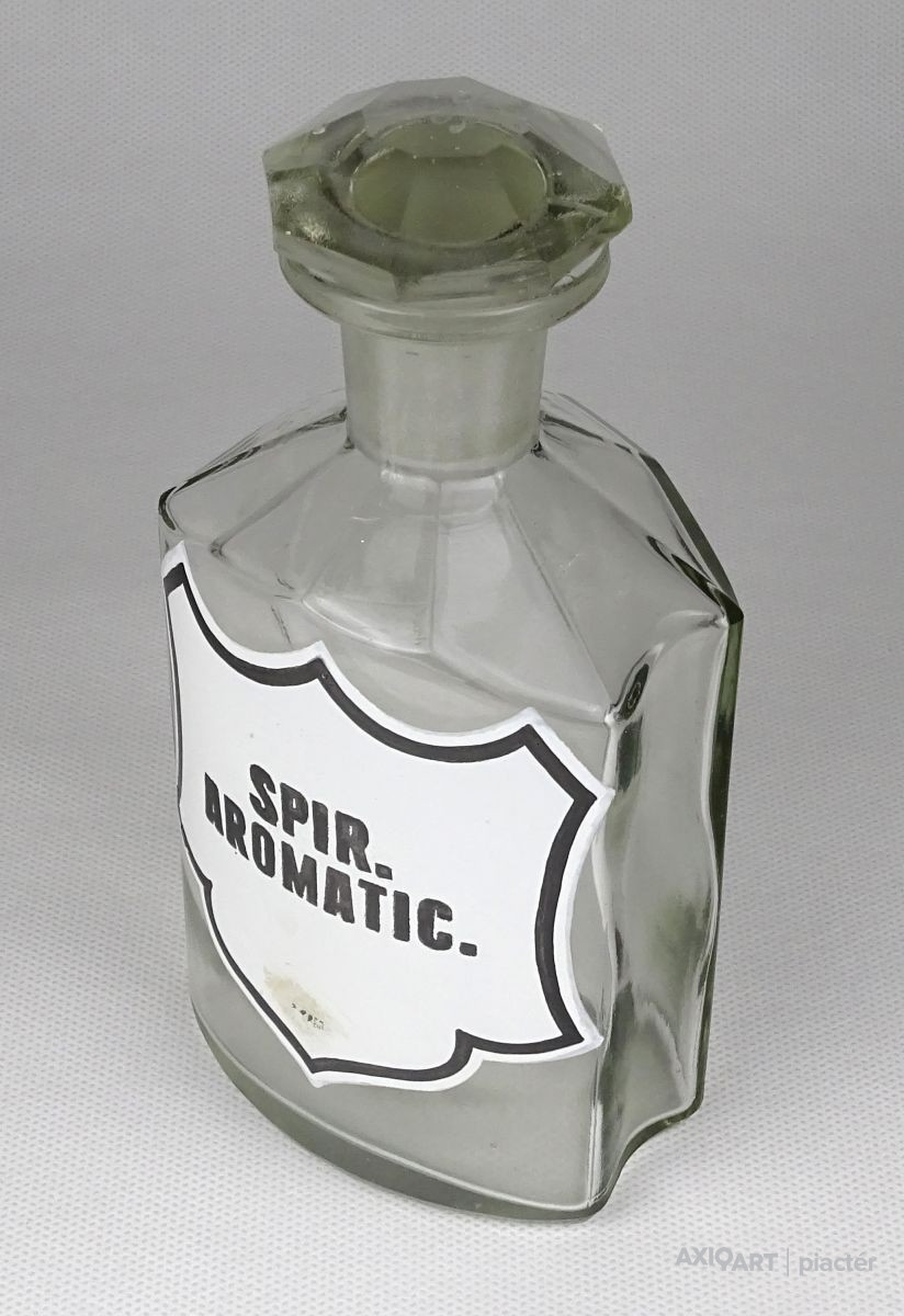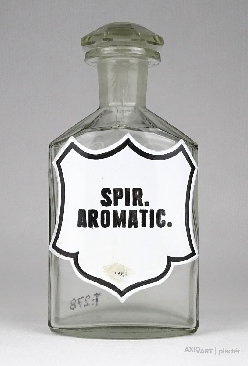 [1L483/X201] Régi, szép állapotú, feliratos gyógyszertári patika üveg, eredeti dugójával. Oldalán felirat: SPIR. AROMATIC. Magasság: 16.5 cm Szélesség: 7.5 cm Súly: 0.34 kg