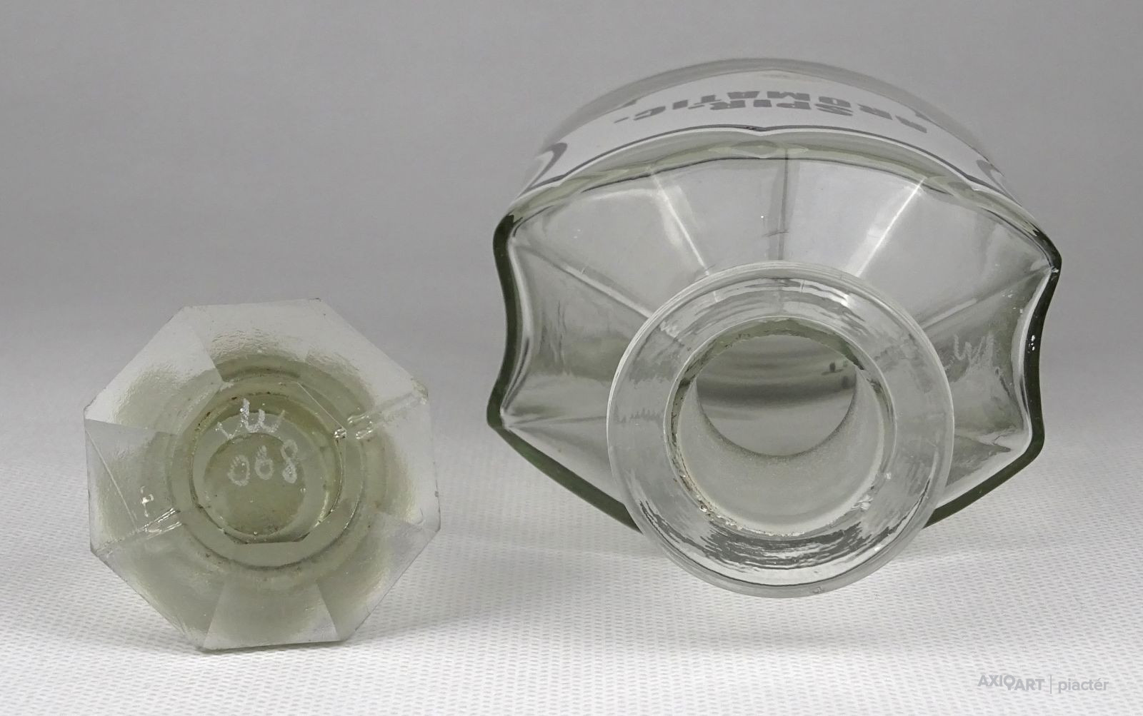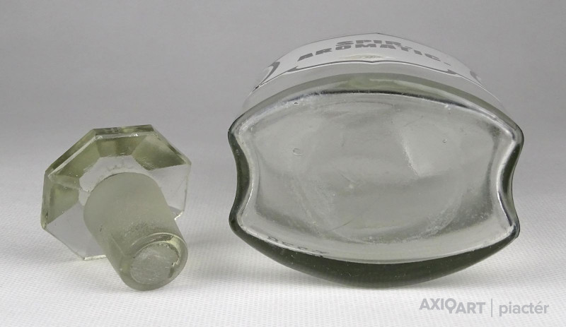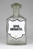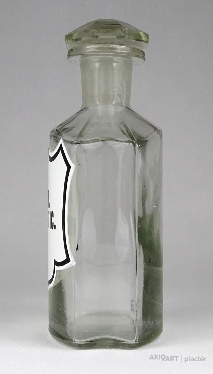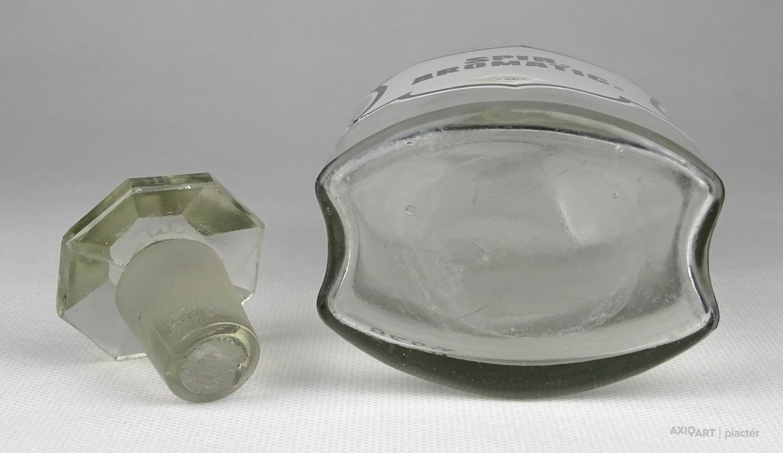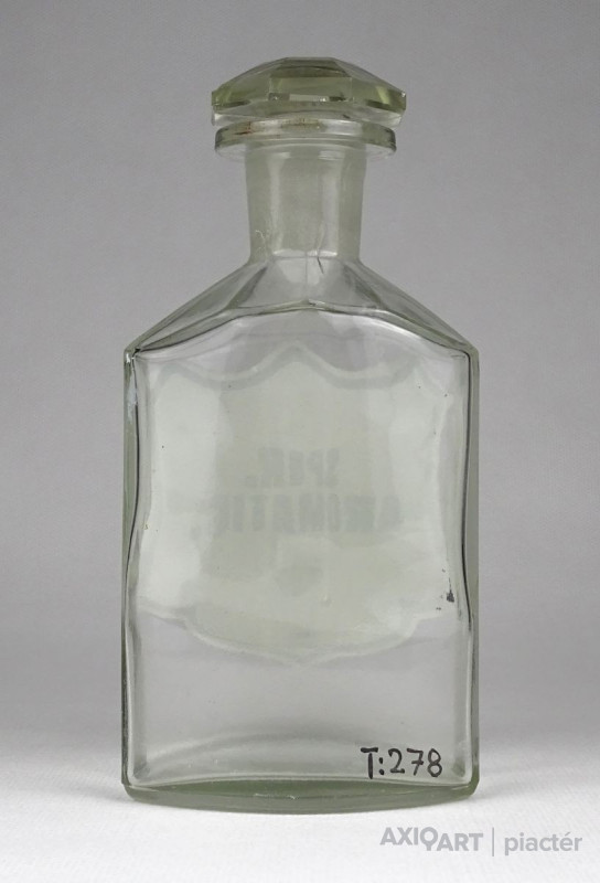 [1L483/X201] Régi, szép állapotú, feliratos gyógyszertári patika üveg, eredeti dugójával. Oldalán felirat: SPIR. AROMATIC. Magasság: 16.5 cm Szélesség: 7.5 cm Súly: 0.34 kg