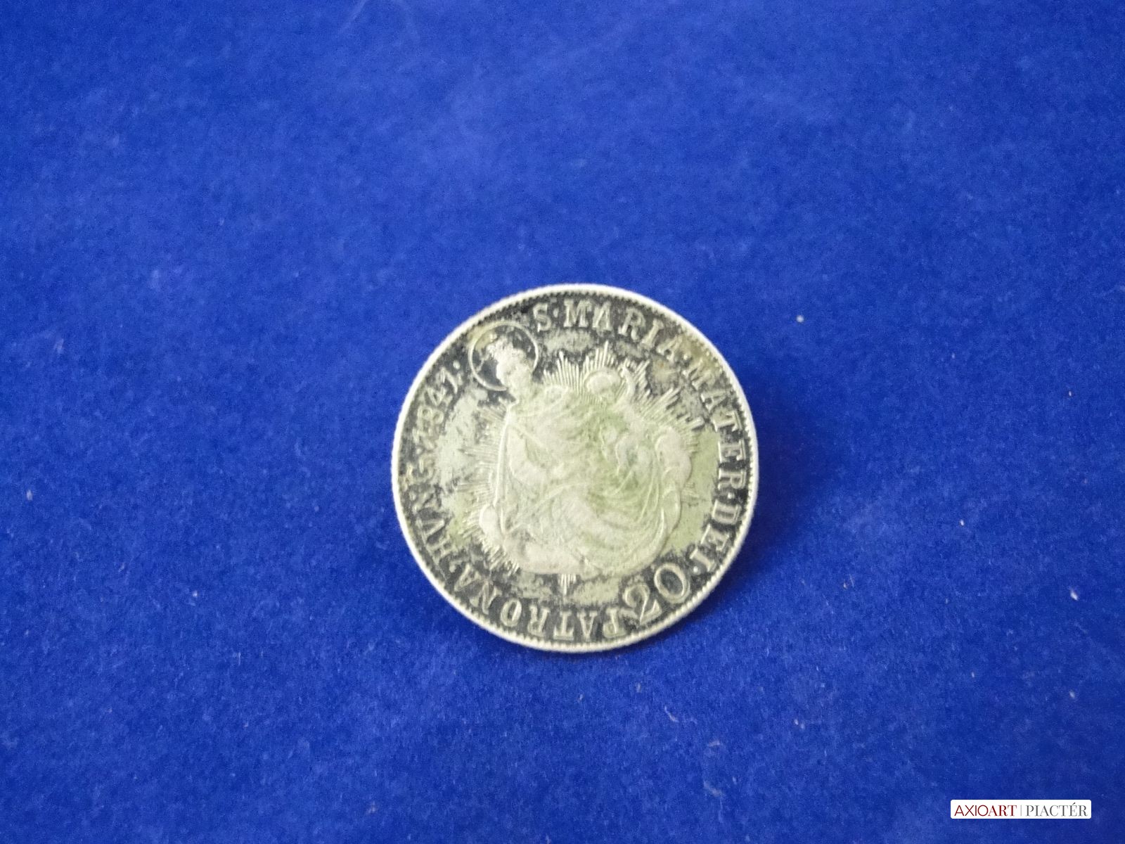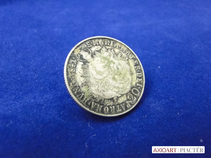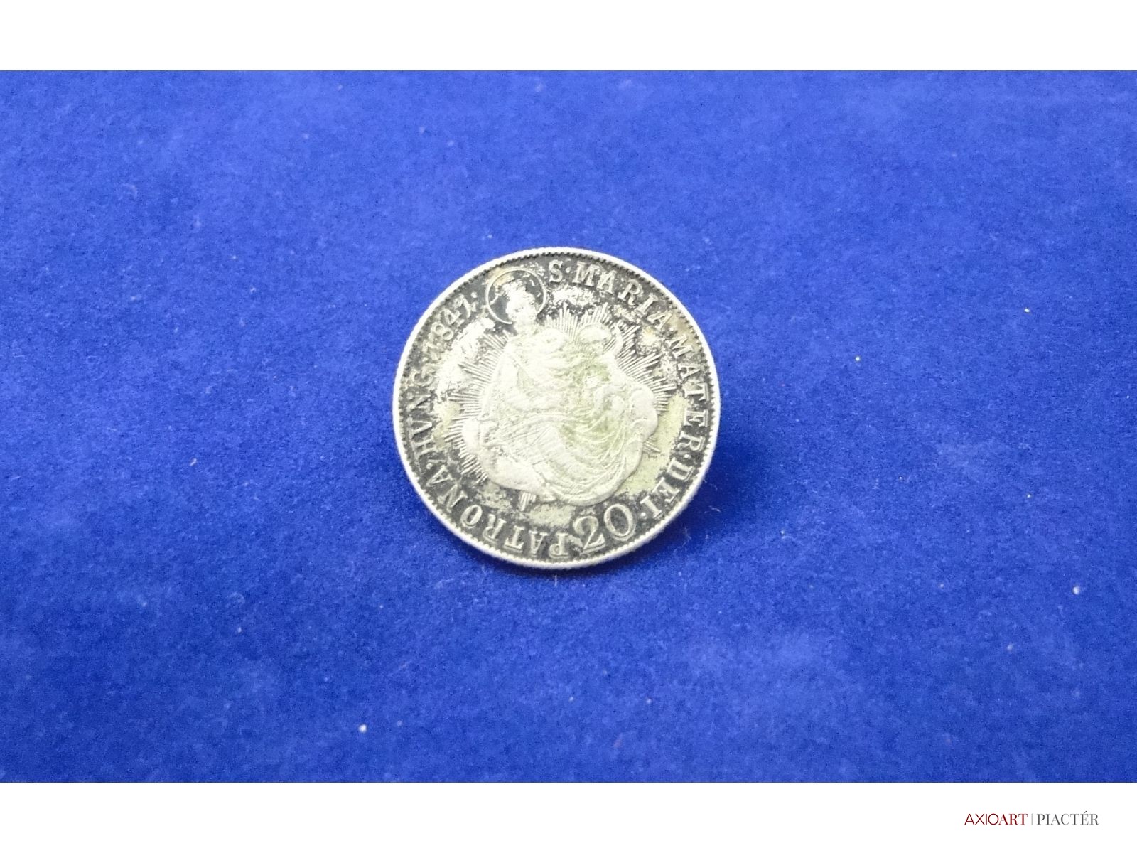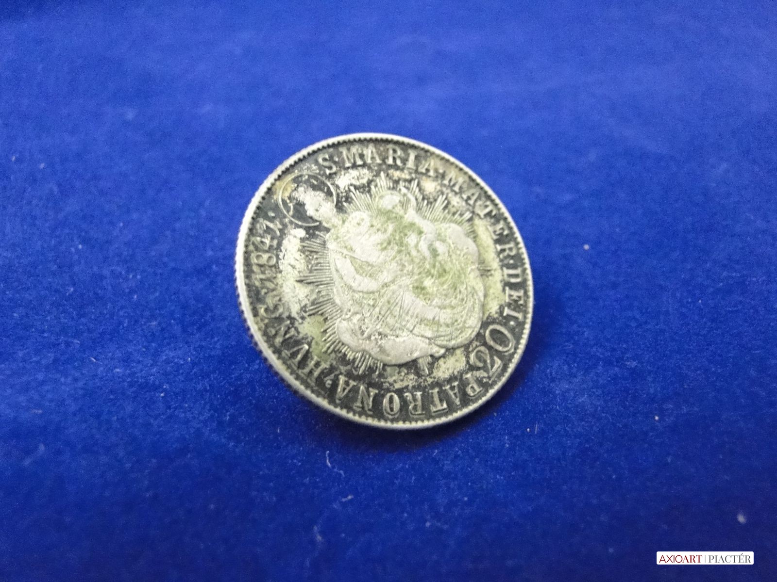 [5725/UZ-K] Nagyon régi magyar pénzérmés ezüst mandzsetta. A mandzsettán antik ezüst 20 krajcáros található 1841-ből. Feliratok: S. MARIA MATER DEI PATRONA HUNG Hátoldalán FERDID G AUST IN HUNG B. REX H. N. V. R. L. V. D. G. L. I. A. A. Az ezüst érme súlya cca 6.5 gramm. Súly: 0.008 kg Fej mérete: 2.5 cm