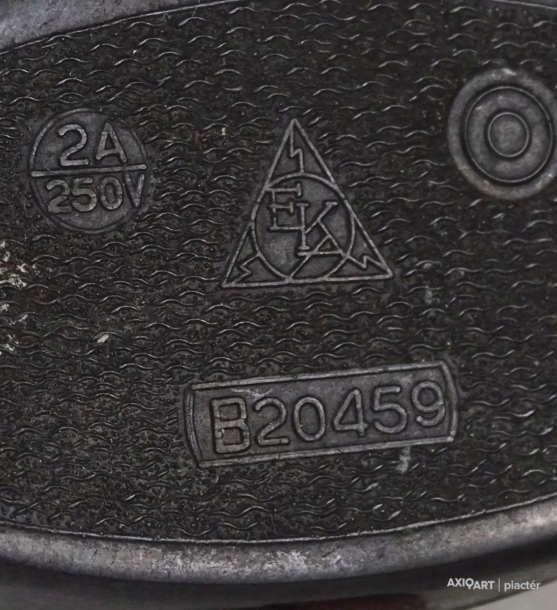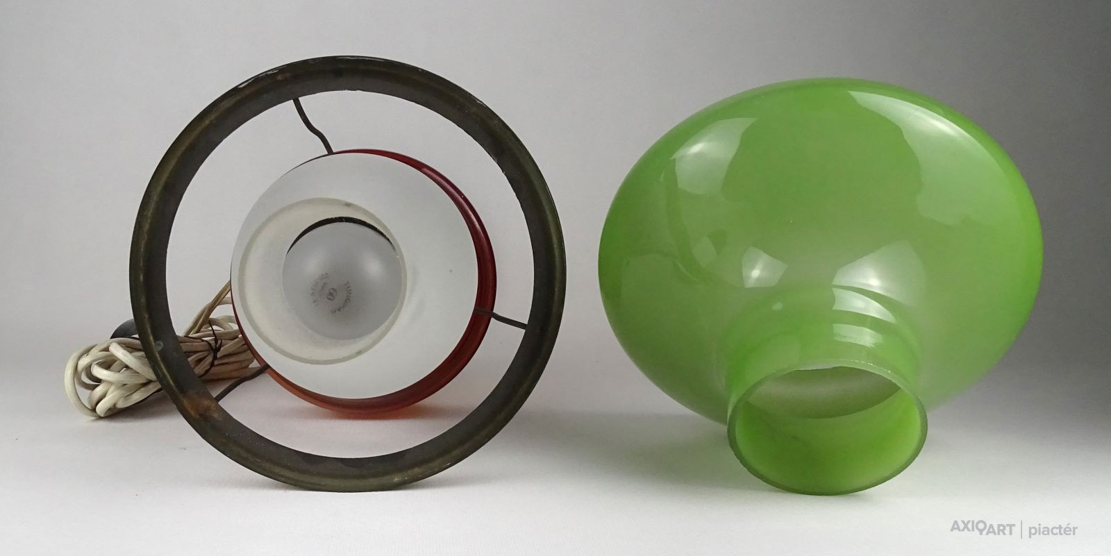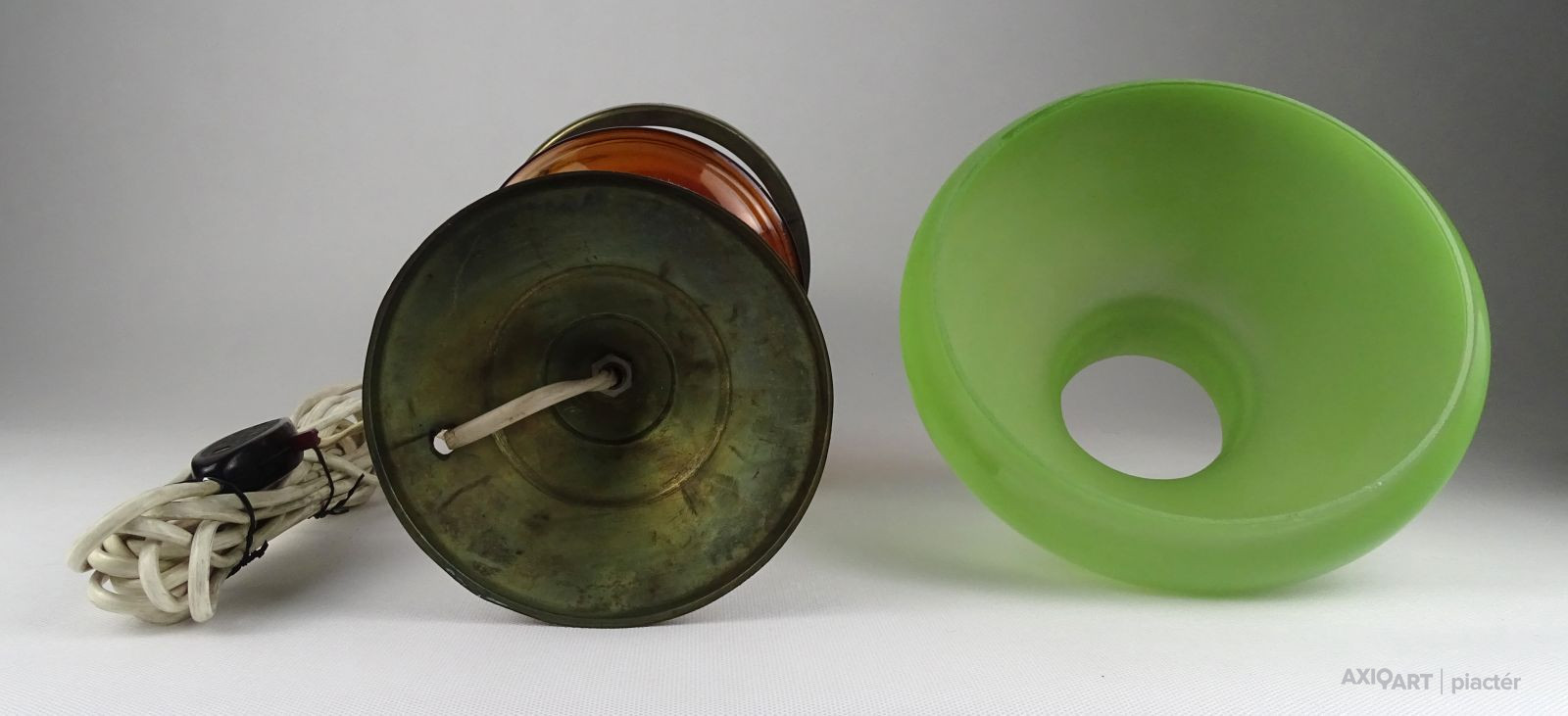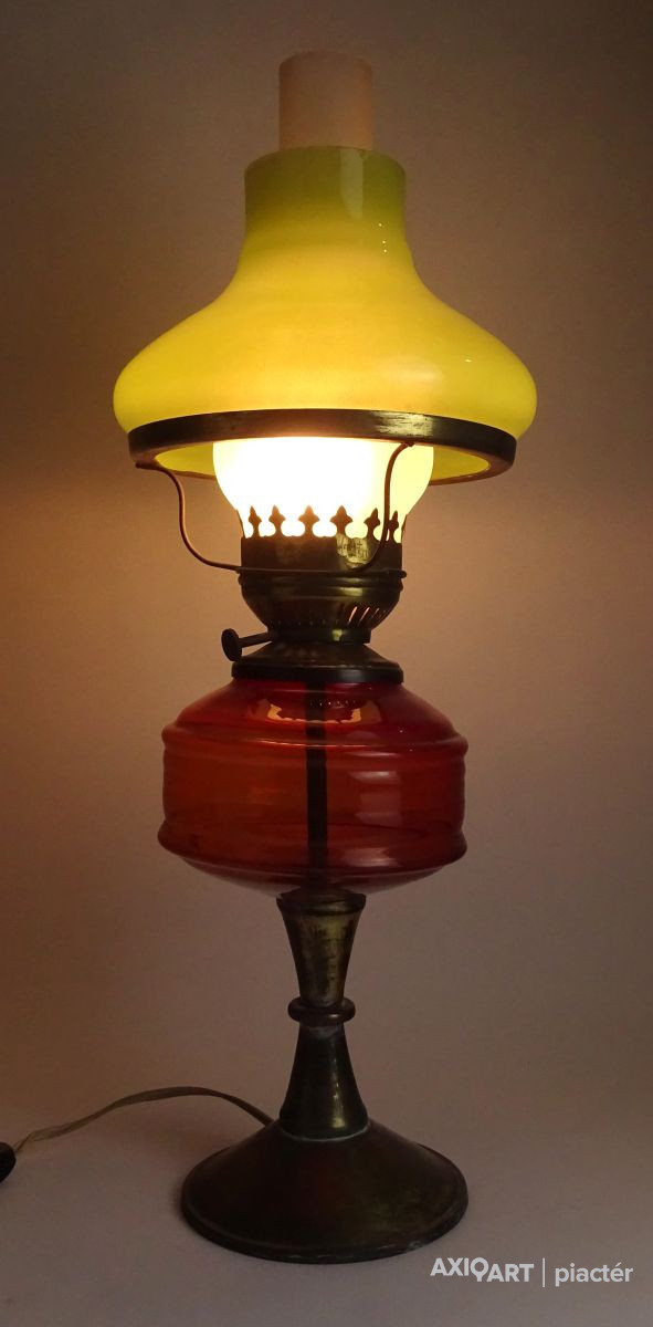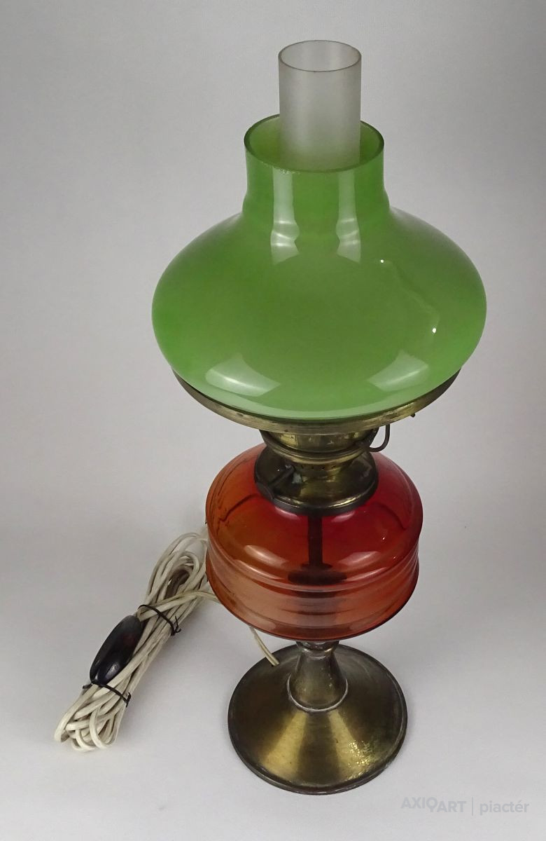 Szép, működő állapotban lévő petróleum lámpa réz talpon, bevezetékelve, elektromossá alakítva. Opálüveg cilinderrel és zöld burával rendelkezik. Nagy méretű (E27) izzó való bele.