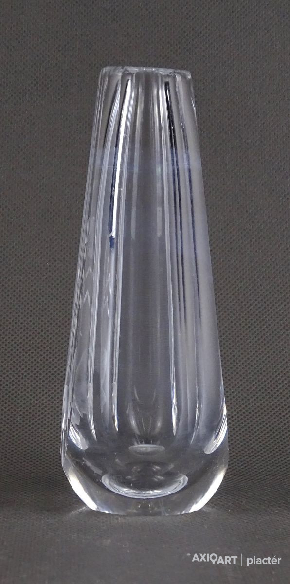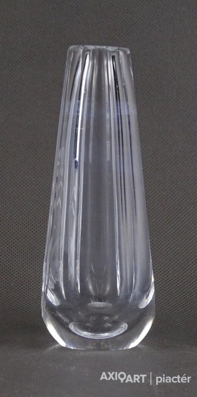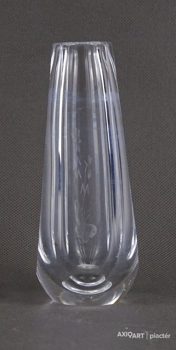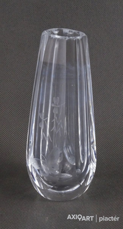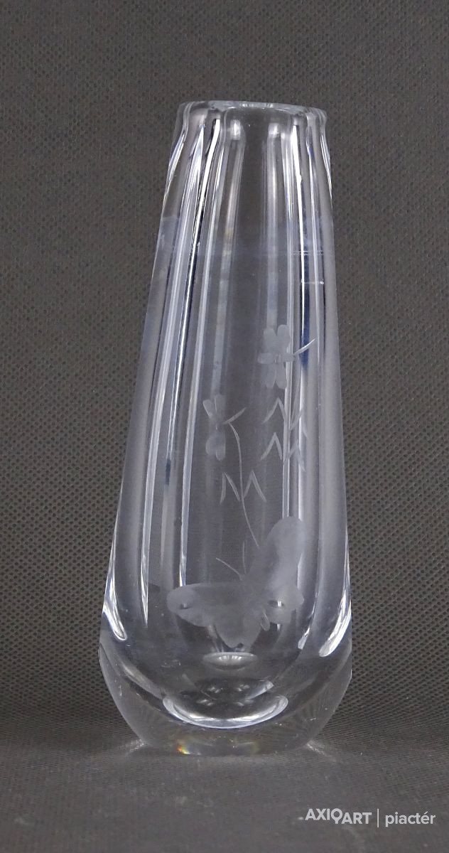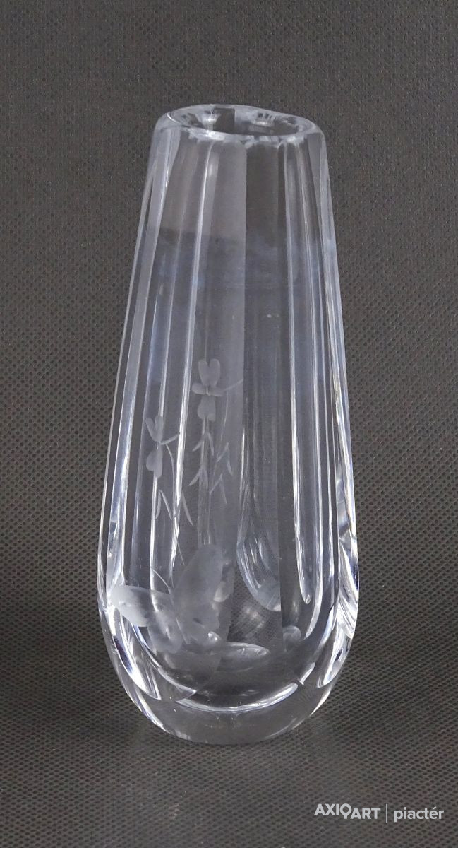 Régi, csiszolt, finom rajzolatú pillangós mintával díszített, kisméretű fújtüveg váza, ibolya váza, díszváza. Alján szignált (lásd fotó).