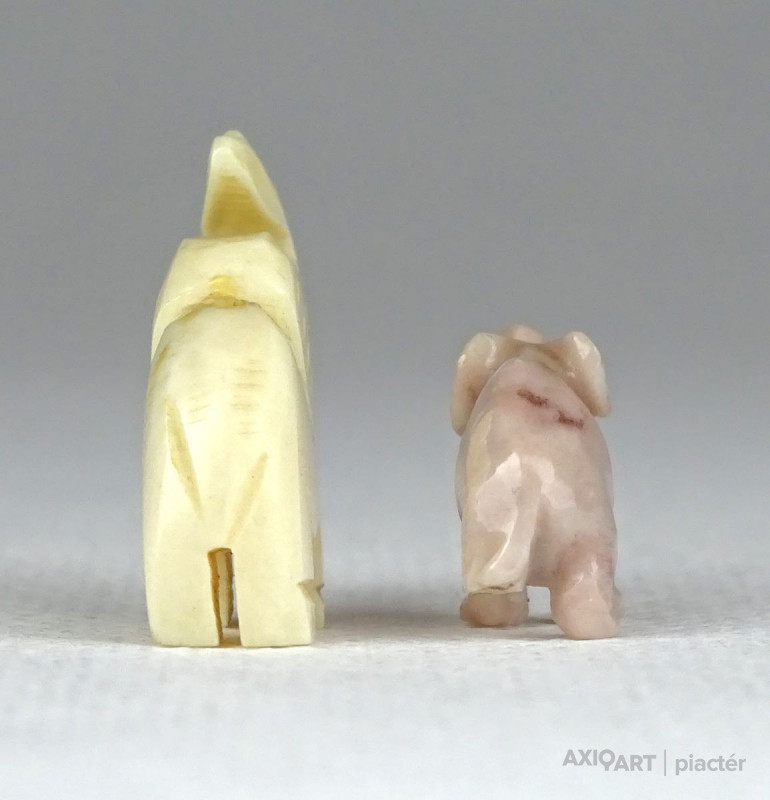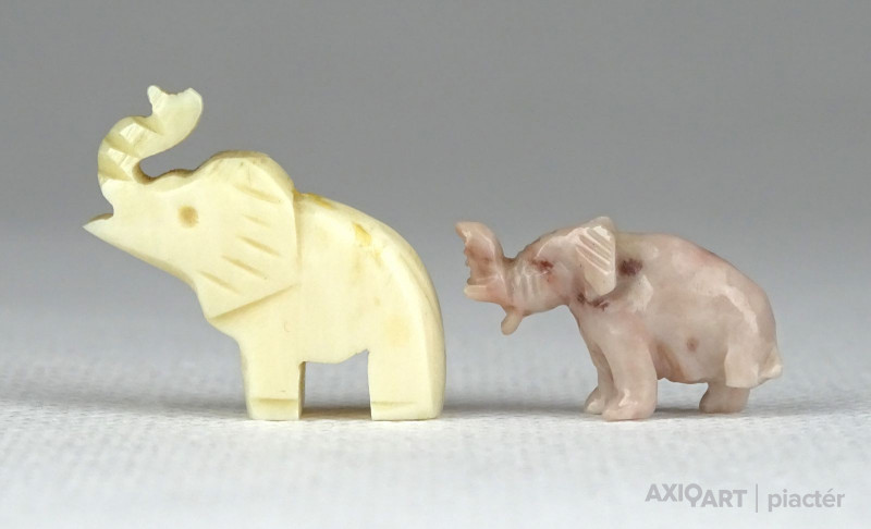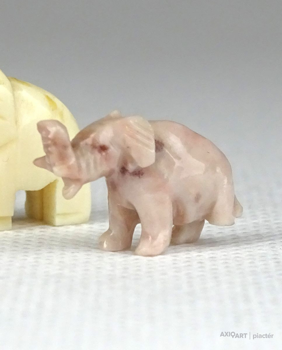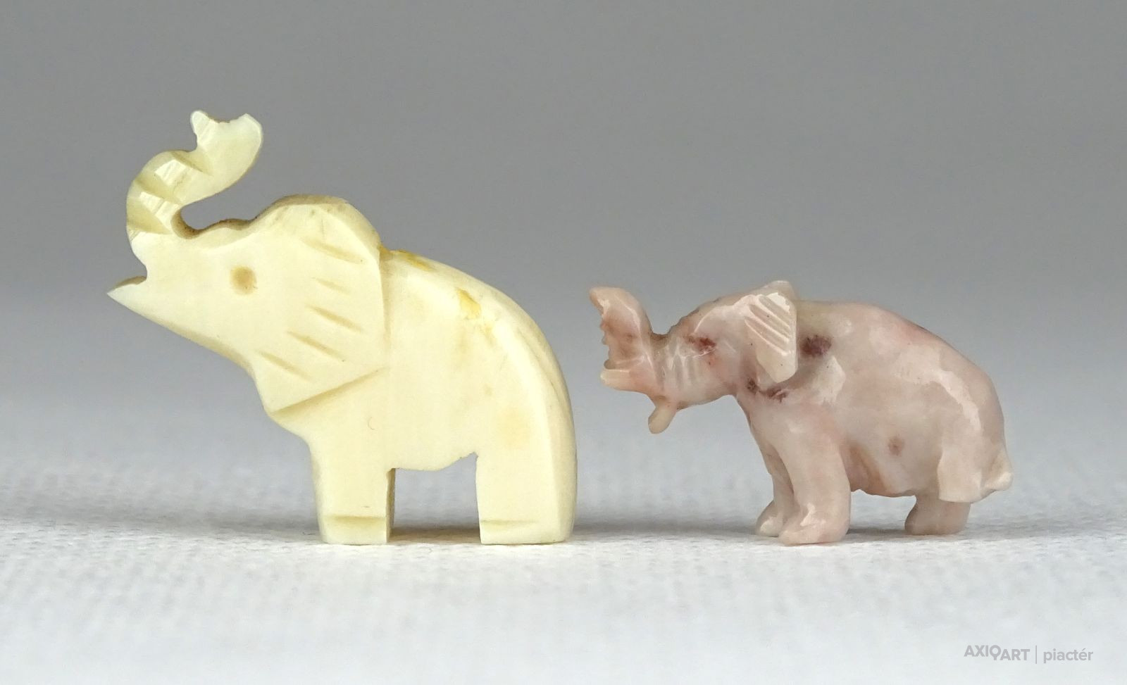 Hibátlan állapotú miniatűr faragott csont elefánt (20 x 6 x 23 mm) és még ennél is kisebb faragott halvány rózsaszín kő elefánt szobrocska (12 x 6 x 18 mm). A kő elefánt bal hátsó lába rövidebb.
