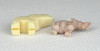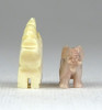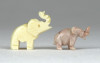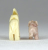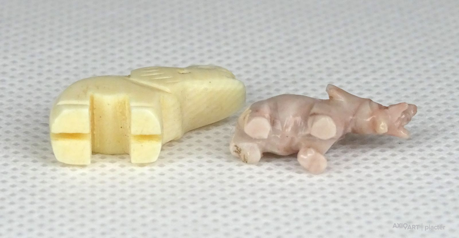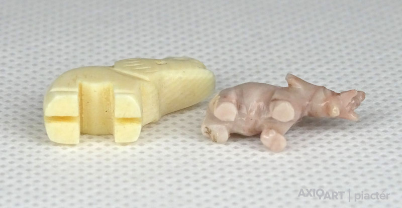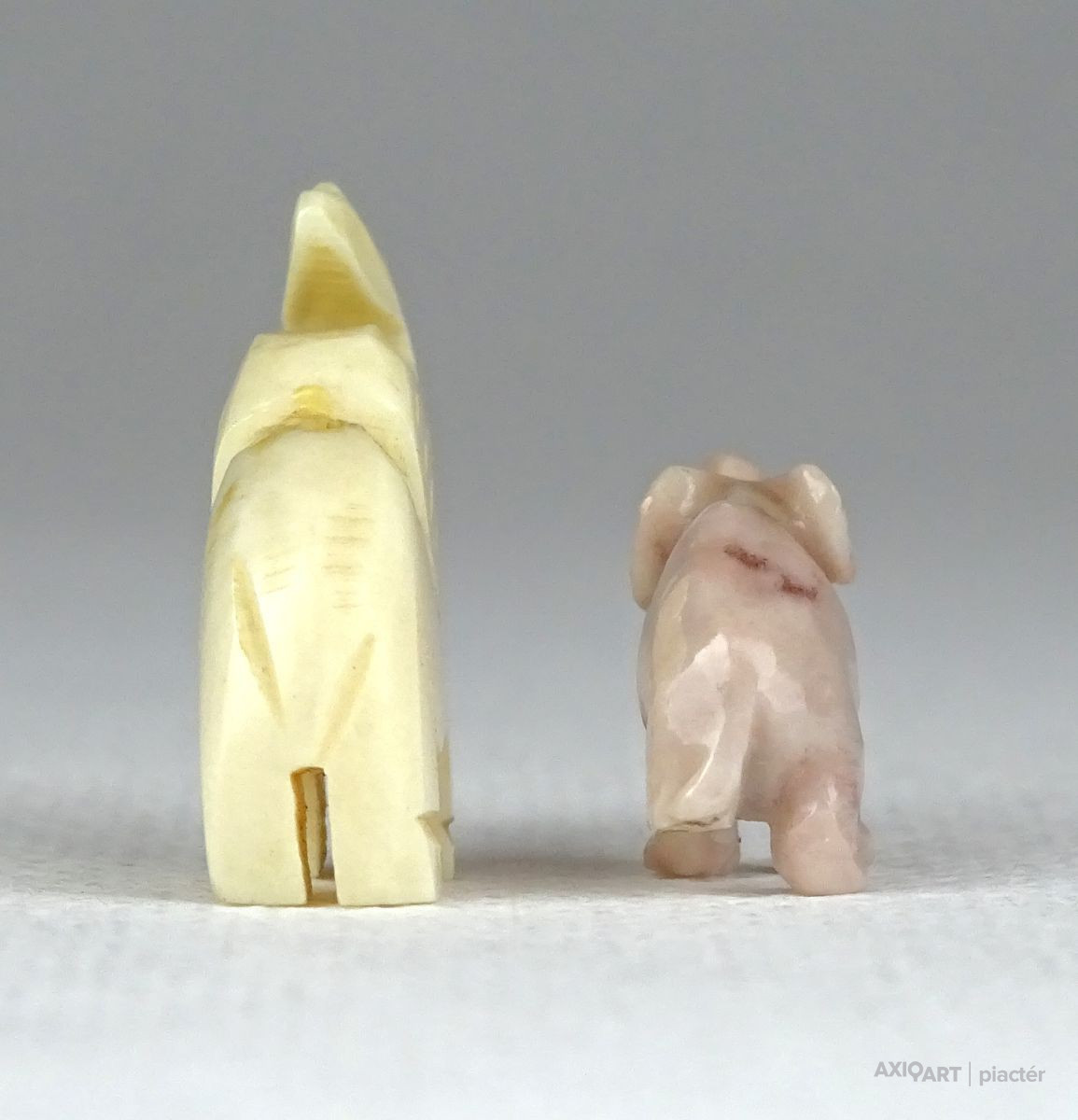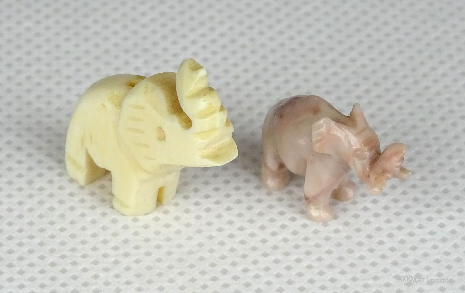 Hibátlan állapotú miniatűr faragott csont elefánt (20 x 6 x 23 mm) és még ennél is kisebb faragott halvány rózsaszín kő elefánt szobrocska (12 x 6 x 18 mm). A kő elefánt bal hátsó lába rövidebb.