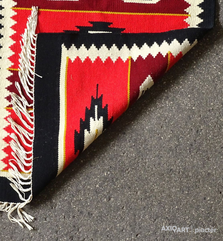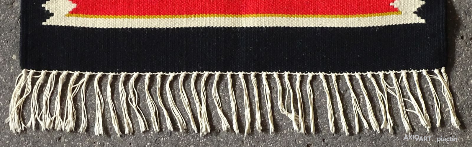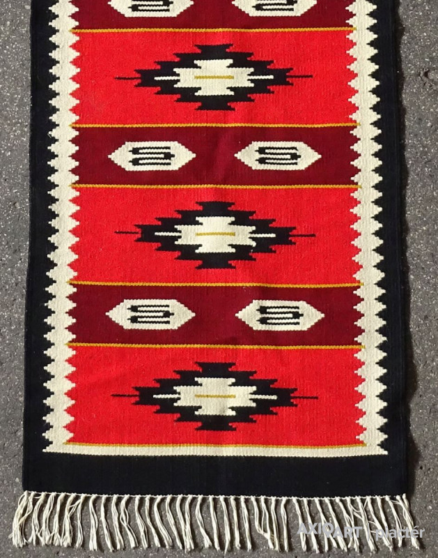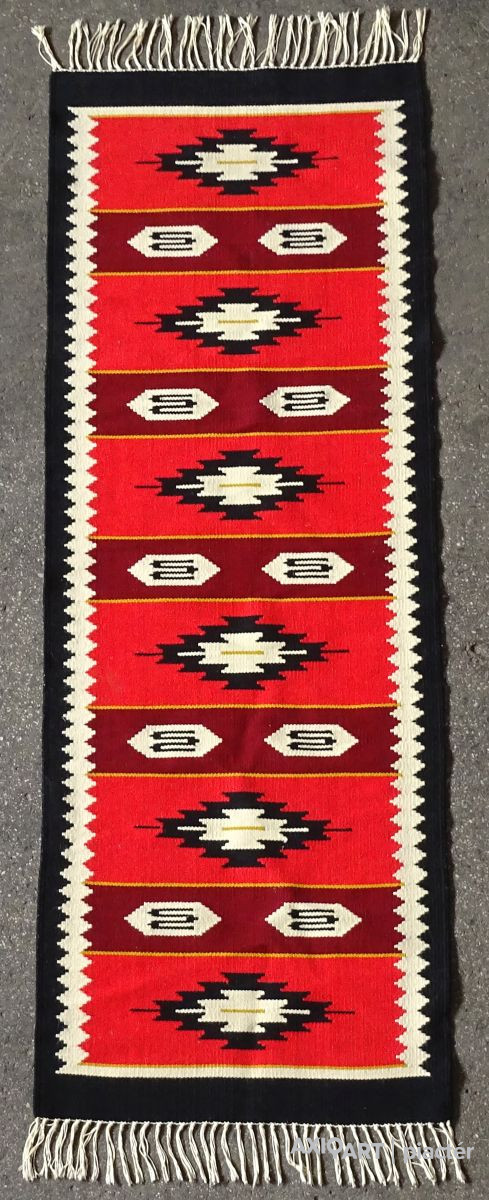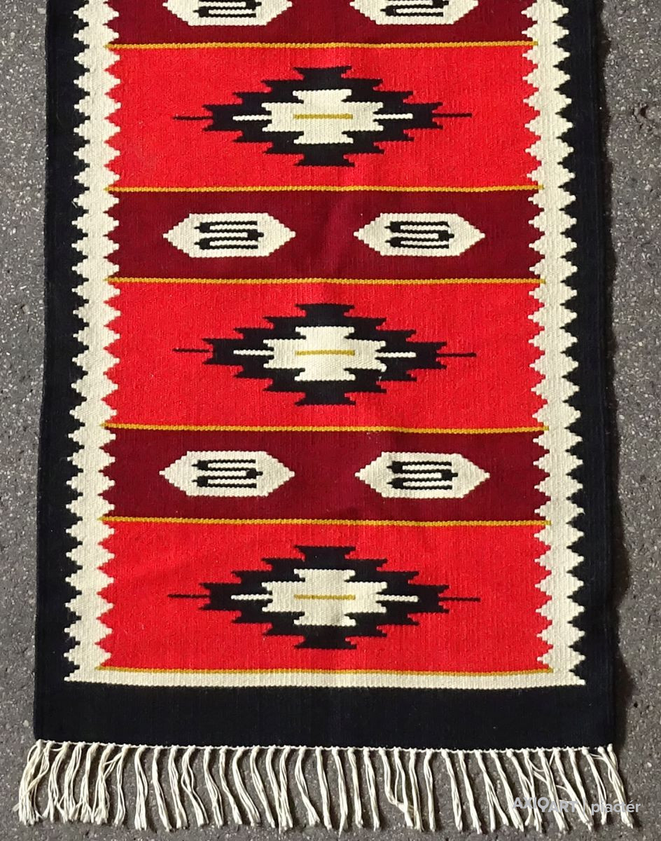 Erdélyi torontáli összekötő szőnyeg, előszoba szőnyeg, futó szőnyeg. Szép állapotú darab, hosszú rojtokkal. Főbb színei: fekete, piros, bordó, bézs.