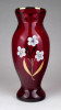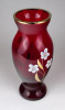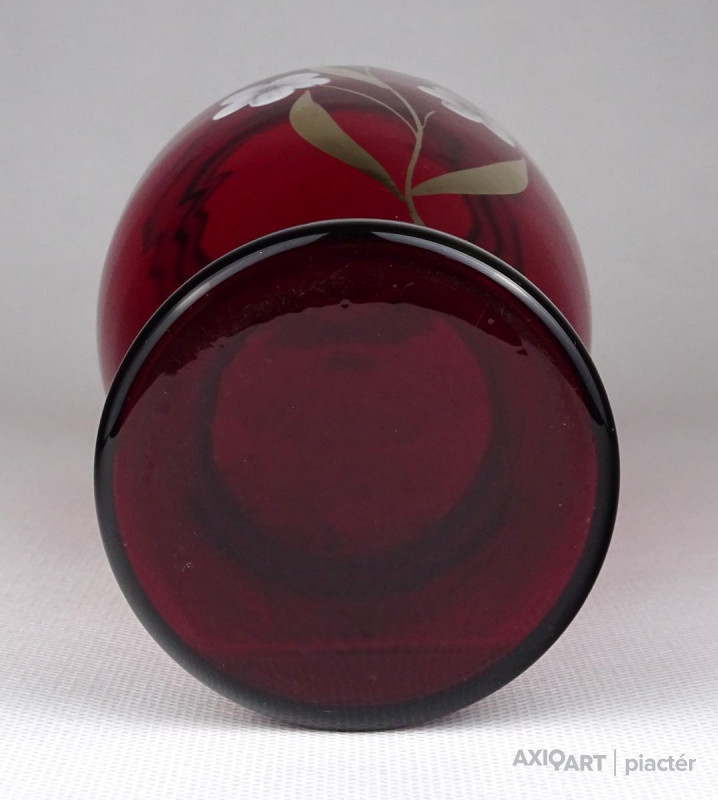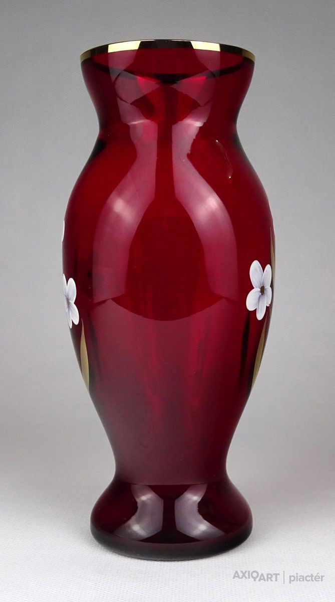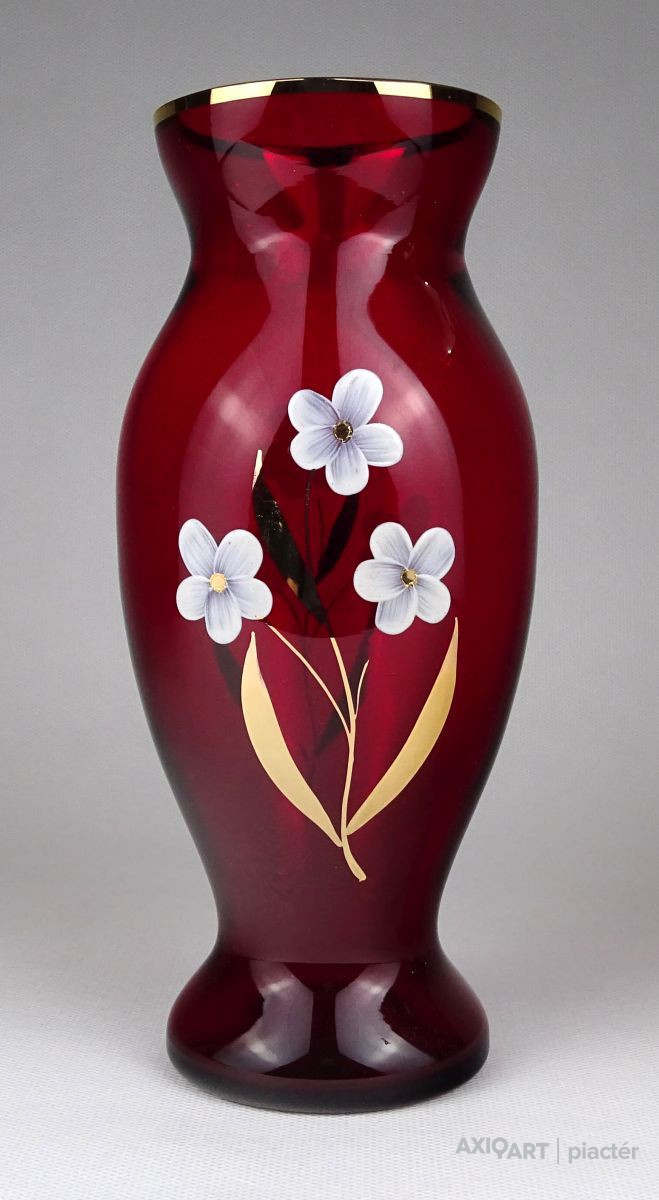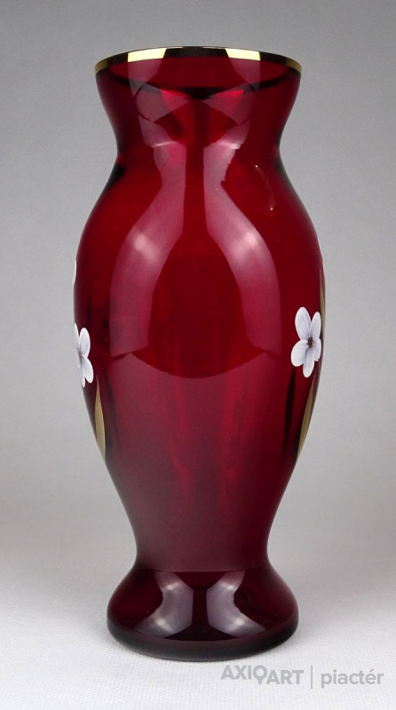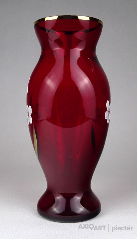 Régi pirosra színezett hibátlan üveg váza, díszváza. A váza szája aranyozott, oldalán kézzel festett virág díszítés látható.