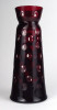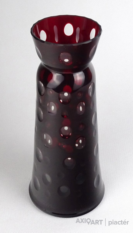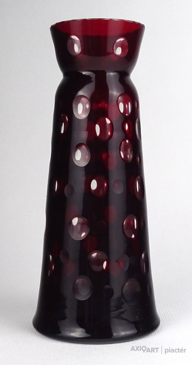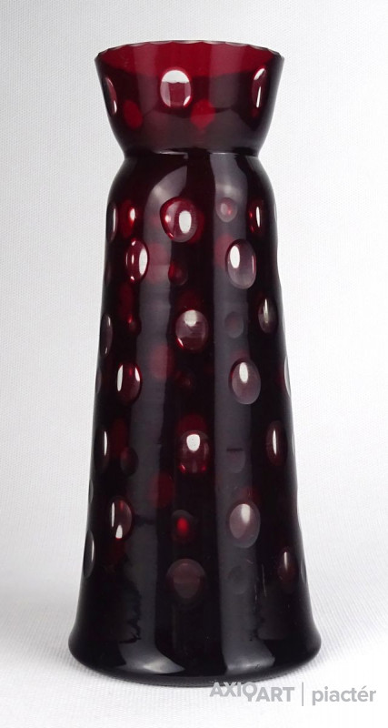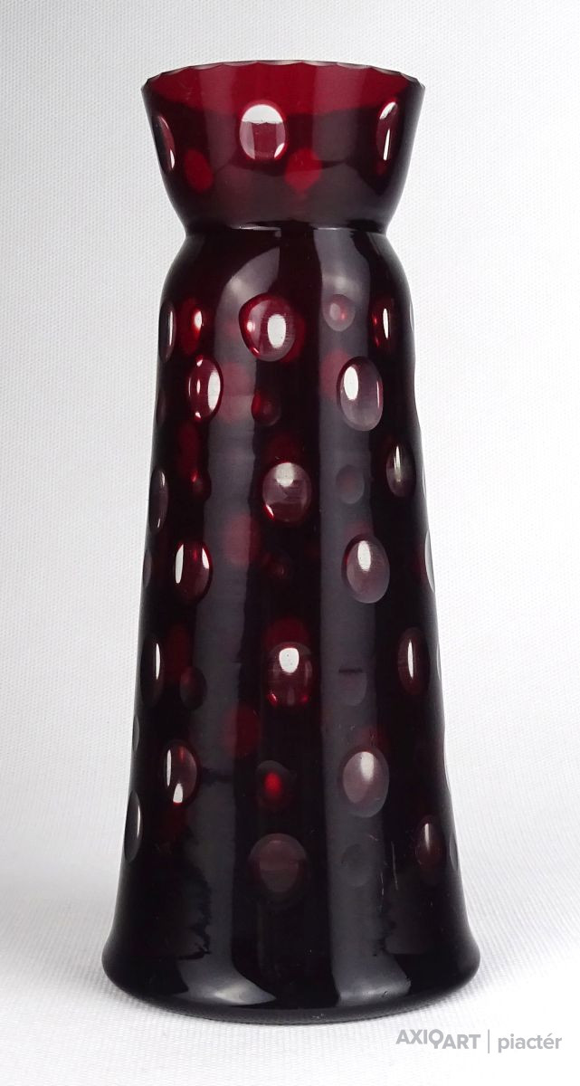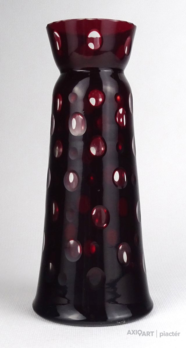 Régi, hibátlan állapotú fújt rétegelt üveg váza. Piros színű, csiszolt pöttyös üveg váza, virágváza, díszváza.