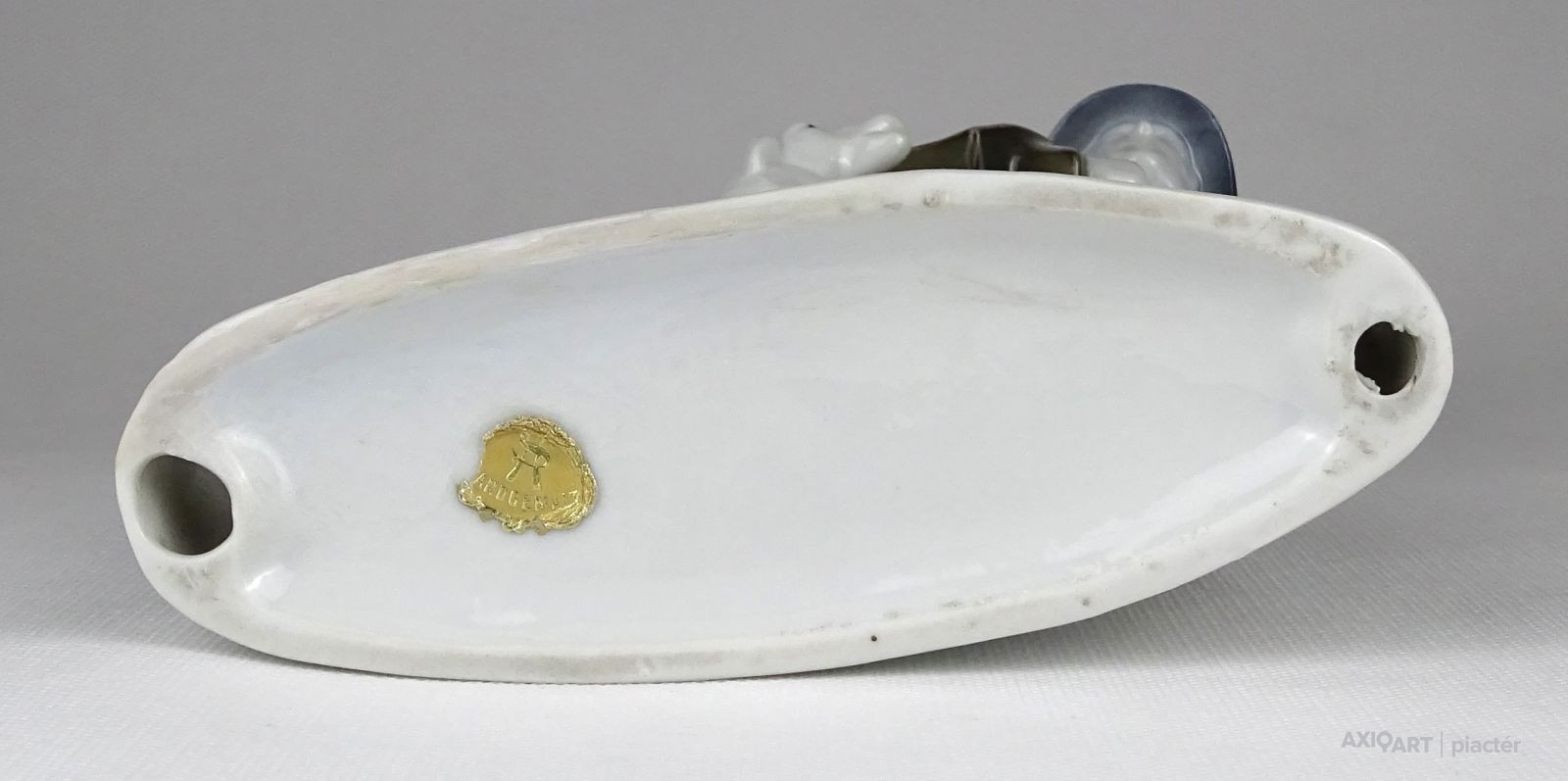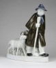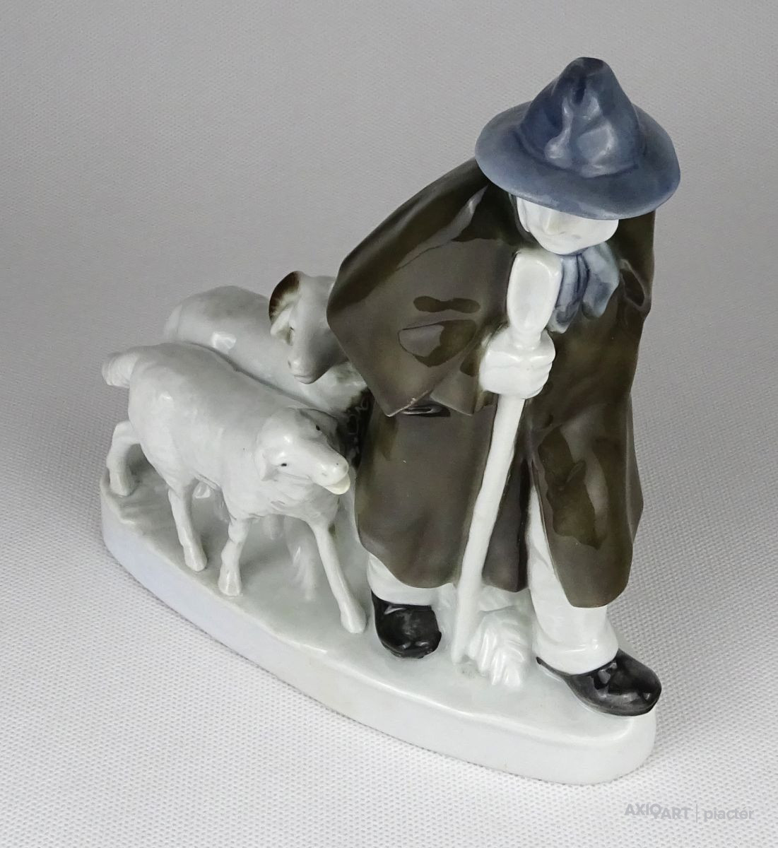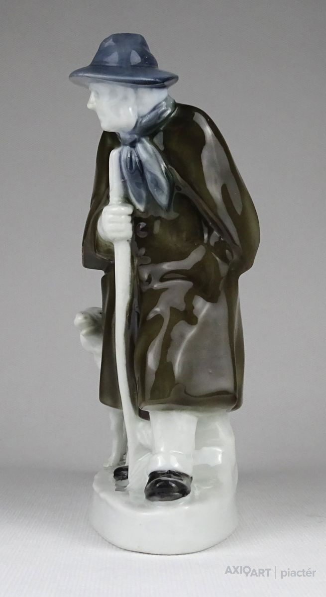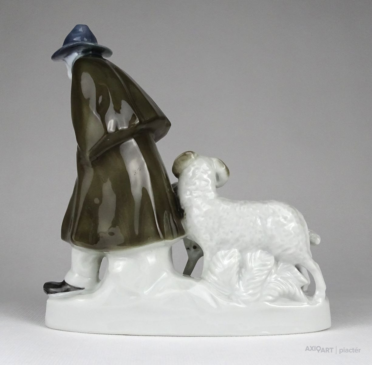 Hibátlan állapotú talapzaton álló porcelán figura. Kalapos juhász, mögötte kos és bárány. Talapzata restaurált.