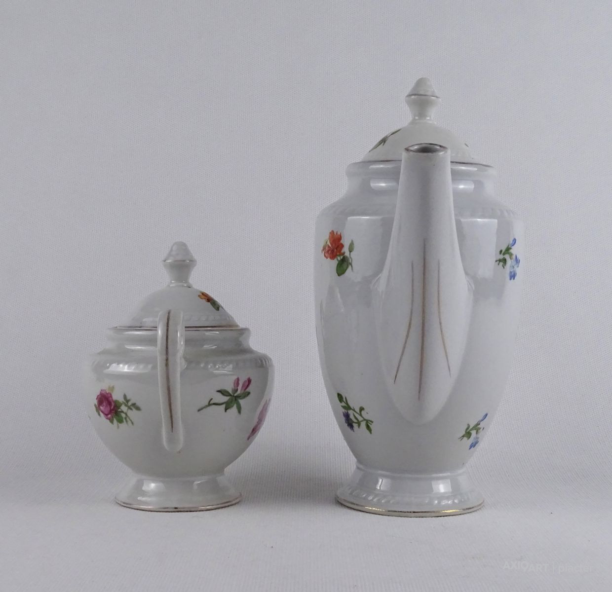 Régi, hibátlan állapotú porcelán kávéskészlet. Virágdíszes, finoman aranyozott kávéskészlet fő darabjai: