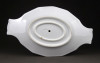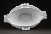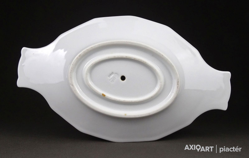 [1I323/X057] Régi, hibátlan hófehér porcelán mártásos, szószos kínáló tál, oldalán fülekkel. Alján formaszám mélynyomással: 6S67 1800 Magasság: 8.5 cm Szélesség: 15 cm Hosszúság: 25.5 cm Súly: 0.69 kg