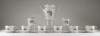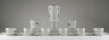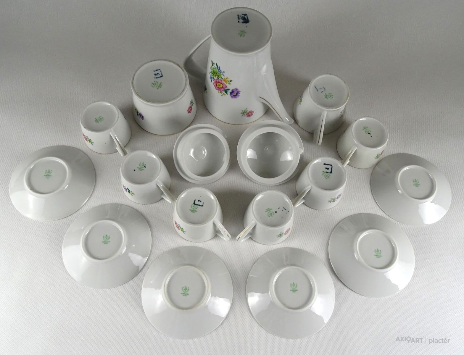 [1S413/Z022] Régi, jelzett Hollóházi porcelán 6 személyes 15 darabos kávéskészlet. Alján zöld színű márkajelzés: HOLLÓHÁZA A készlet darabjai: - 1 darab nagy méretű kávés kanna, kancsó, kiöntő (16.3 x 9.5 x 18 cm) A tetőn apró sérülés található, lásd fotó. - 1 darab tejszínes kiöntő (6.5 x 7.3 x 10.2 cm ) - 1 darab cukor kínáló bonbonier (9.3 x 8.8 cm) - 6 darab kávéscsésze (4.3 x 6 x 7.8 cm) - 6 darab alátét tányér (10.5 cm) Súly: 1.46 kg