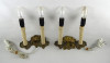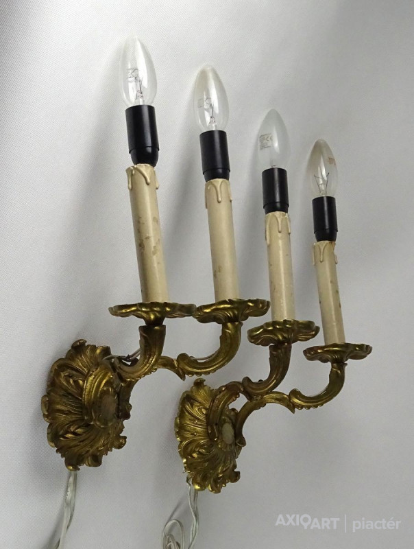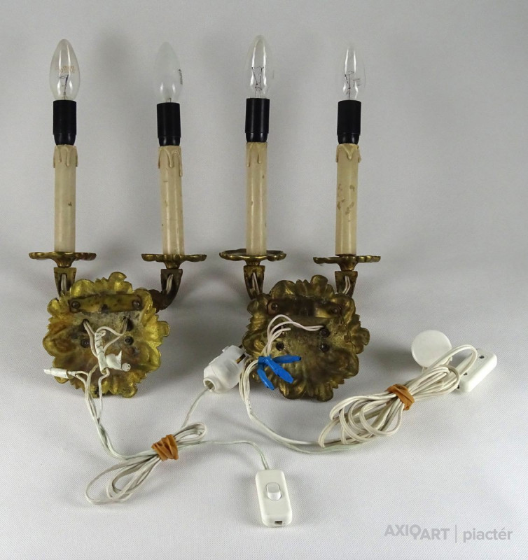 [1G929/X072] Két darab, régi, réz falikar világítás, lámpa, vezetékelt azonnal felszerelhető állapotban. A karok végén papírmasé gyertya és kis méretű foglalat található. Kis méretű E14-es izzó való bele. Magasság: 39 cm Szélesség: 18.5 cm Súly: 2.54 kg