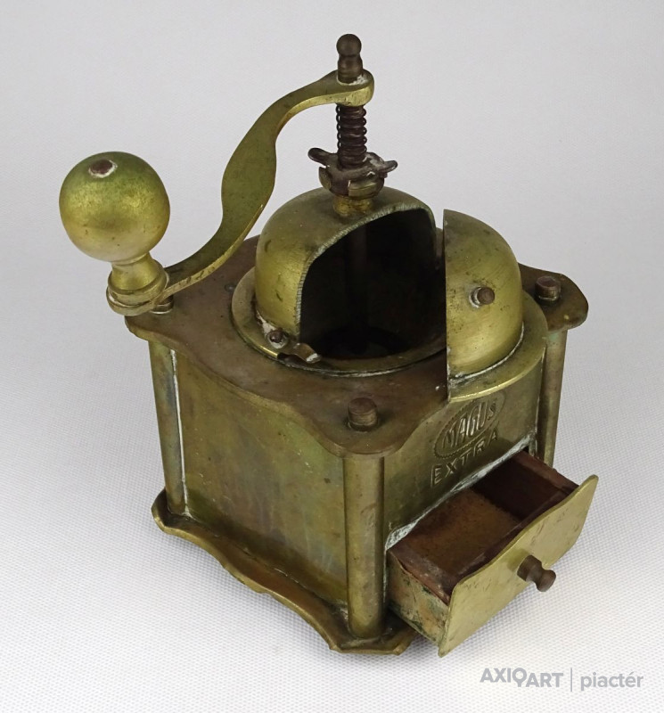 [1O134/X020] Antik, szép állapotú réz konyhai vagy kávéházi daráló, dísztárgy. Jelzés, felirat: MAGUS EXTRA Magasság: 18 cm Szélesség: 11 cm Hosszúság: 11 cm Súly: 0.7 kg