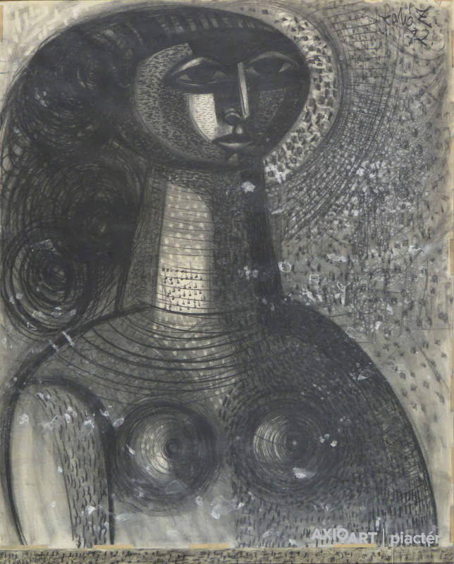 [FKD030/Bp90/35] A kép mérete: 126 x 100 cm keret nélkül. Készült: Szén, tempera, Papír A kép Szabó Zoltán Angyalföldi (Budapest, 1929) alkotása. Jelezve jobbra fent "Szabó Z 72" A festmény jó állapotban van. Keret: Ép A festmény hátoldalán kiállítási címke: Műcsarnoki törzslap 1973. X. Magyar festők és grafikusok életrajzi lexikona I-II. Festő. Rajkai György beszélte rá, hogy jelentkezzék felvételre a Képzőművészeti Főiskolára. 1948-49-ben a Dési Huber-szakkörben rajzolt, festett Gráber Margit vezetésével. 1950-ben jelentkezett a Képzőművészeti Főiskolára, ahol 1951-ben kezdte meg tanulmányait Fónyi Géza, Barcsay Jenő és Domanovszky Endre keze alatt. 1953-54-ben a főiskola megvált tőle, lekerült Tatabányára, ahol a művésznövendékek számára művésztelepet létesítettek. Számos műve kapcsolódik a tatabányai periódushoz, amelynek élményéből még évek múlva is bőven merít. 1955-ben visszakerült a főiskolára, ahol 1958-ban fejezete be tanulmányait. Ezt követően két évig - a Fiatal Művészek Stúdiójának tagjaként - a stúdió műtermében dolgozott. 1960-63 között Derkovits-ösztöndíjban részesült. Kiállító művészként első ízben 1958-ban a VII. Magyar Képzőművészeti Tárlaton szerepelt jelentősebb anyaggal. Ettől kezdve minden nemzeti tárlaton, a Fiatal Képzőművészek Stúdiójának bemutatóin, jelentősebb hazai és külföldön rendezett magyar seregszemléken részt vett alkotásaival (Ernst Múzeum, Műcsarnok, Tiszti Klub Budapest, Veszprém, Szolnok, Tatabánya, Vác, Győr, Kecskemét, Tallin, Berlin, Varsó, Belgrád, Párizs, Moszkva, stb.). Erőteljes formákkal komponált figurális kompozíciókat, portrékat, városképeket, csendéleteket alkotott olajban, pasztellben, szénnel és temperával. A Nyolcak, Nemes Lampért József és a korai Uitz Béla alkotások formai örökségének legrangosabb mai folytatója. A külföldiek közül Siqueiros és D. Rivera gyakoroltak rá nagy hatást, akik leginkább lehetnek expresszív stílusának mintaképei. Szabó végtelen humanizmusa, őszinte hite az alkotásban, a tiszta emberi kapcsolatokban és a szeretetben, az emberi lét himnuszává fokozódik vásznain. Monumentális, óriási lendület jellemzi alakjait, akár táblaképről, szénrajzról, akár monumentális munkáról van szó. Díjak: a Stúdió pályázatának I. díja; Munkácsy-díj; a Szolnoki Festészeti Triennále II. díja; Érdemes Művész. Sok murális alkotást is készített (Sátoraljaújhely, Csongrád, Baja, Bácsalmás, stb.). Alkotásai helyet kaptak a Magyar Nemzeti Galériában, a Legújabbkori Történeti Múzeumban és több vidéki képtárban. (Egri Mária: Szabó Zoltán, MÉ, H.J.: Műv. 1970/8, Műv. 1976/5, A.J.: Műv. 1985/2) Magyar festők és grafikusok életrajzi lexikona I-II. Műgyűjtők és kereskedők kézikönyve Festő. Művészeti tanulmányait a Dési Huber István szakkörben kezdte, ahol Gráber Margit korrigálta. 1950-ben jelentkezett Budapesten, a Képzőművészeti Főiskolára. Fónyi Géza, Barcsay Jenő és Domanovszky Endre voltak a mesterei. Siqueiros és Diego Rivera is nagy hatást gyakoroltak rá, akik leginkább lehetnek expresszív stílusának mintaképei. 1958 óta szerepel hazai és külhoni tárlatokon (Műcsarnok, Ernst Múzeum, stb.). 1960-63 k. Derkovits-ösztöndíjas volt. 1969-ben Munkácsy-díjjal tüntették ki. 1977-ben érdemes művész címet kapott. Végtelen humanizmusa, őszinte hite a munkában, a tiszta emberi kapcsolatokban, a szeretetben, az emberi lét himnuszává fokozódik vásznain. Monumentális, hatalmas lendület jellemzi figuráit, akár táblaképről, szénrajzról akár monumentális műről van szó. Sok murális munkát is készített (Sátoraljaújhely, Csongrád, Baja, Bácsalmás, stb.). A NYOLCAK, Nemes Lampért és a korai Uitz munkák formai örökösének legrangosabb mai folytatója. (MÉ, H.J.: Műv.-1970/8, Műv.-1976/5, A.J.: Műv.-1985/2) Magyar festők és grafikusok adattára Művészeti tanulmányait a Dési Huber szakkörben kezdte, majd 1951-1958-ban Fónyi Géza, Barcsay Jenő és Domanovszky Endre növendéke a főiskolán. 1958-tól minden fontosabb hazai és számos külföldi tárlaton részt vett. Kiállított többek között a Szovjetunióban, Bulgáriában, Jugoszláviában, az NDK-ban, Lengyelországban és Franciaországban. Több vidéki bemutató (Dunaújváros, Szeged, Kecskemét, Szolnok, Győr stb.) mellett 1970-ben az Ernst Múzeumban, 1976-ban a Műcsarnokban jelentkezett gyűjteményes anyaggal. 1976-ban önálló kiállítása volt Tallinban. 1978-ban az Ernst Múzeumban. A Kilencek alapító tagja, és valamennyi kiállításuk résztvevője. 1960-1963-ban a Derkovits-ösztöndíjat, 1969-ben Munkácsy-díjat, 1977-ben érdemes művészi címet kapott. - Művészetében központi helyet foglal el az ember. Végtelen humanizmus, őszinte hite a munkában, a tiszta emberi kapcsolatokban, a szeretetben az emberi lét himnuszává fokozódik vásznain. A Nyolcak formai örökségének legrangosabb mai folytatója. - Irod.: P.Sz.T.: Művész életrajzok. Bp. 1985.; Acsay Judit: Legszívesebben az eget festeném be. Beszélgetés Szabó Zoltánnal. Művészet, 1985. 2. Művészeti lexikon I-IV. Festő. 1951-58 között a Képzőművészeti Főiskolán Fónyi Géza, Barcsay Jenő és Domanovszky Endre tanítványa volt. 1958-tól állítja ki erőteljes formákkal komponált figurális kompozícióit (Almahámozók, Kesztyűs női portré stb.). 1965-ben sgraffitót készített egy sátoraljaújhelyi lakóházra. Művész életrajzok kortárs magyar képzőművészek 1958-ban kapott diplomát Fónyi Géza, Barcsay Jenő és Domanovszky Endre tanítványaként. Azóta minden fontosabb hazai rendezvény résztvevője, gyakorta kiállít külföldön is. Számos vidéki bemutató mellett 1970-ben az Ernst Múzeumban, 1976-ban a Mű