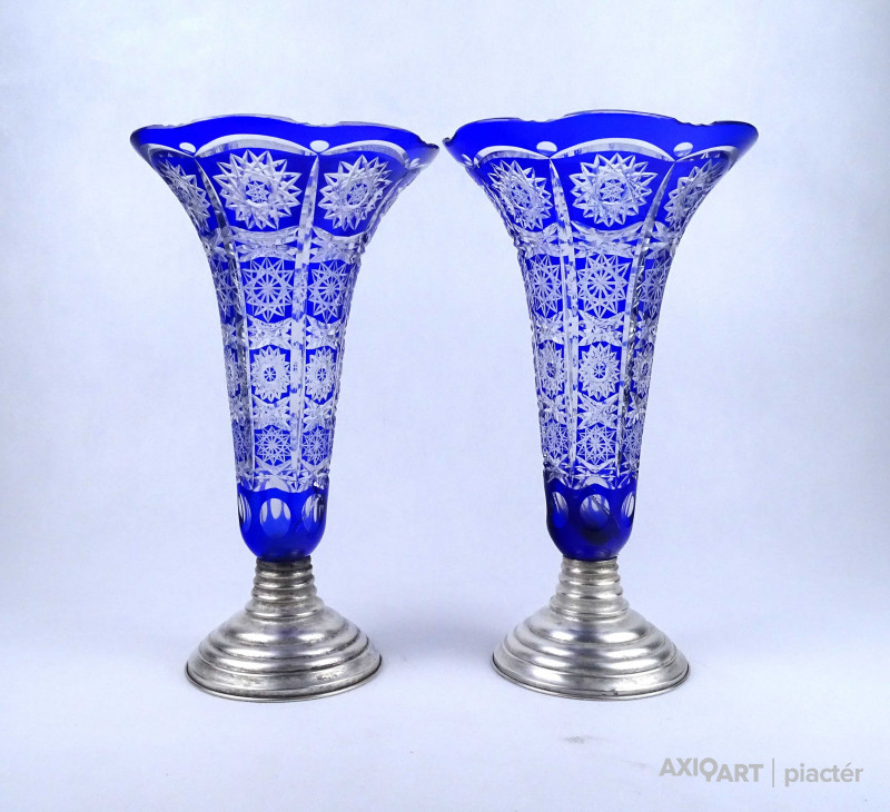[1Z427/Z053] Régi, szép állapotú, ezüst talpú, nagyméretű kehely alakú, csiszolatokkal gazdagon díszített, kék kristály váza pár. A talp peremén beütve 1965. után használt 800-as finomságú Dianna fős jelzés látható. Mellette beütve gyártói jelzés: FŐÉ (Fővárosi Óra- és Ékszeripari Vállalat). Mindkét váza kristály része a talp felett repedt, lásd fotó. Magasság: 33 cm Szélesség: 19 cm Súly: 2.39 kg