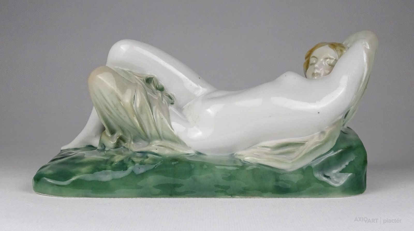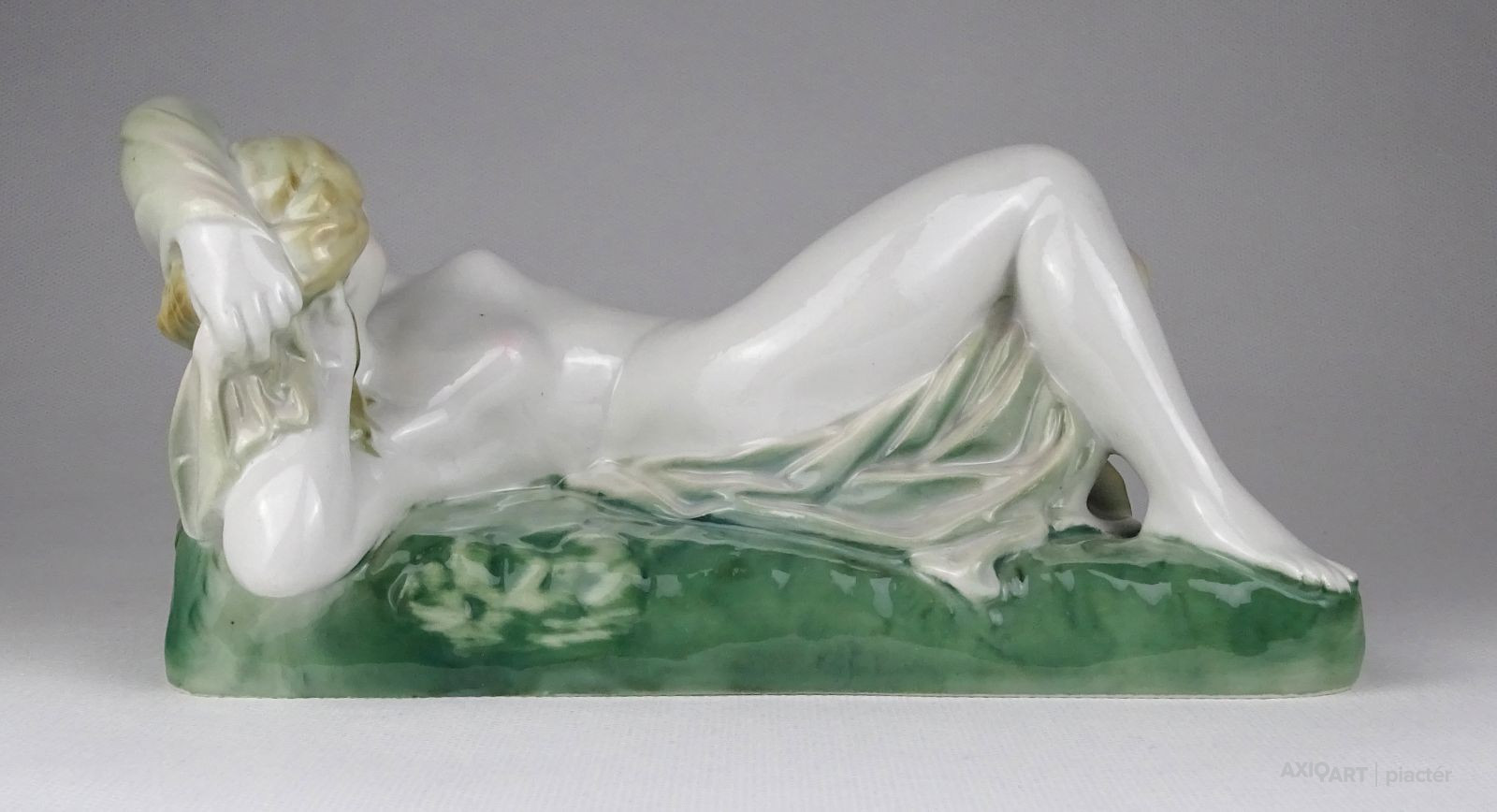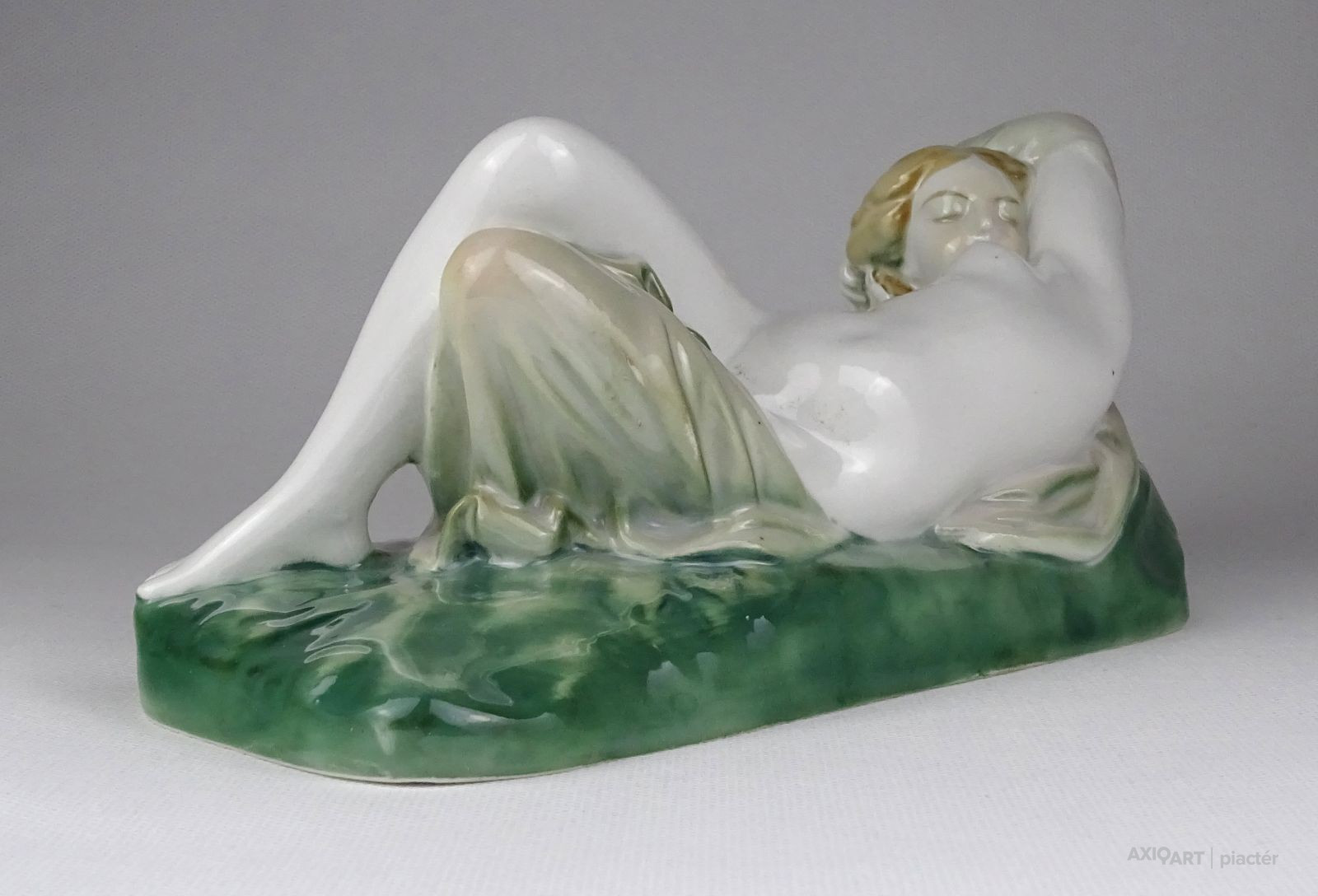 [1L620/X292] Talapzaton fekvő, egész alakos női akt szobor. Régi, ritkán előforduló forma. Alján Zsolnay öttornyú márkajelzés: ZSOLNAY PÉCS MADE IN HUNGARY Formaszám: 8577 Magasság: 10 cm Szélesség: 10 cm Hosszúság: 22 cm Súly: 0.66 kg