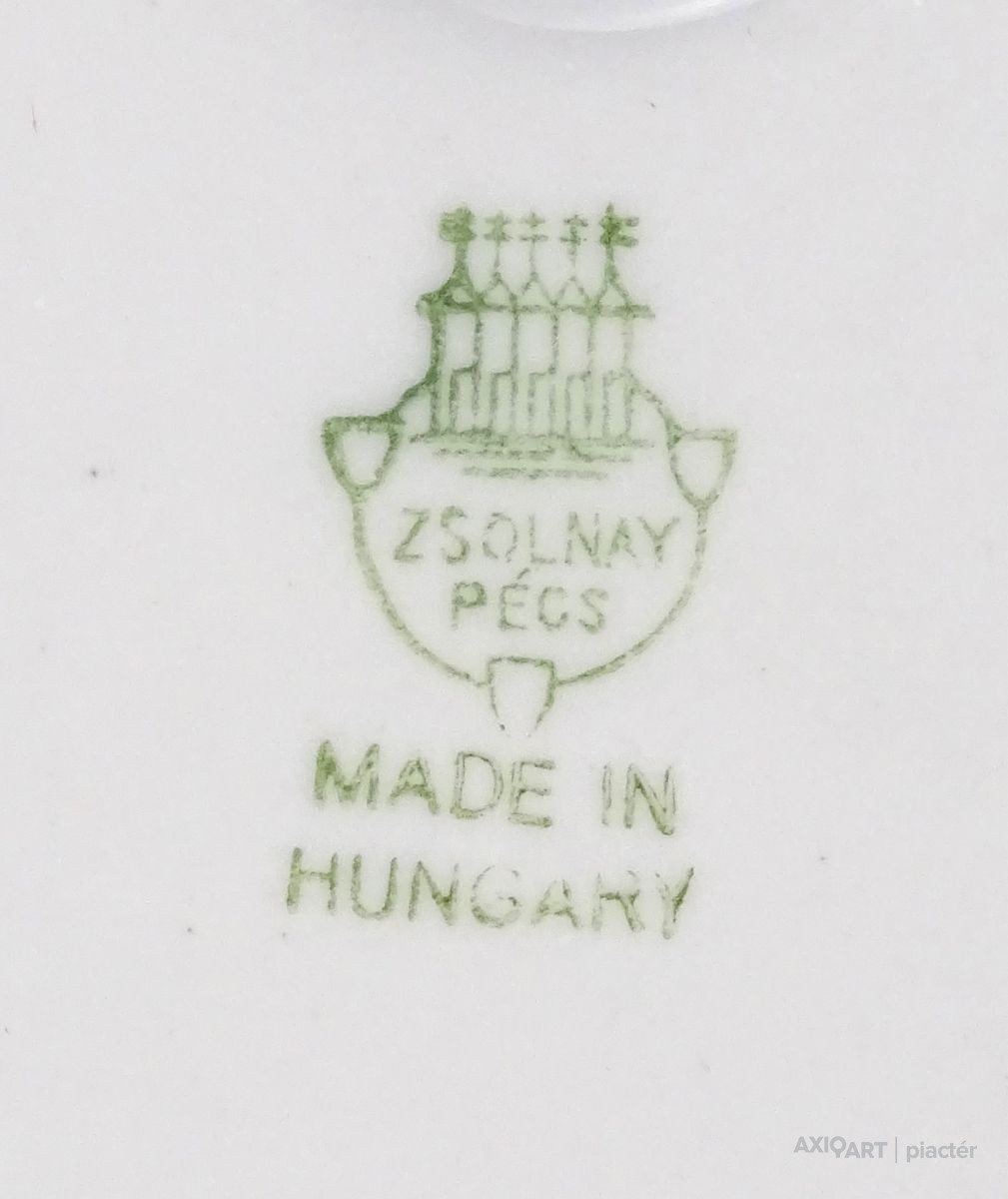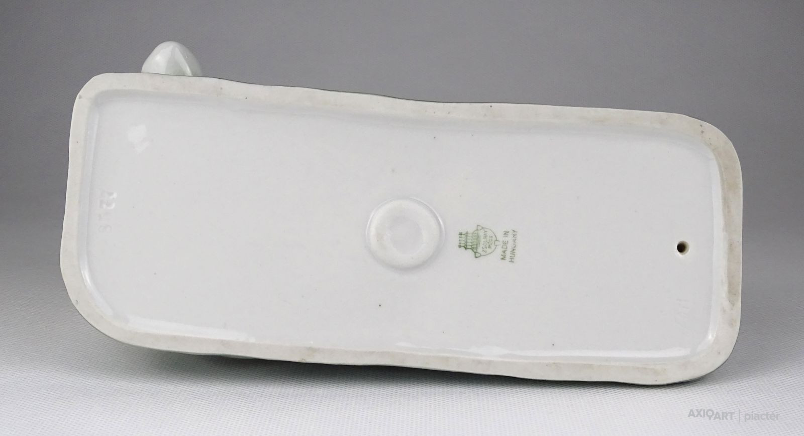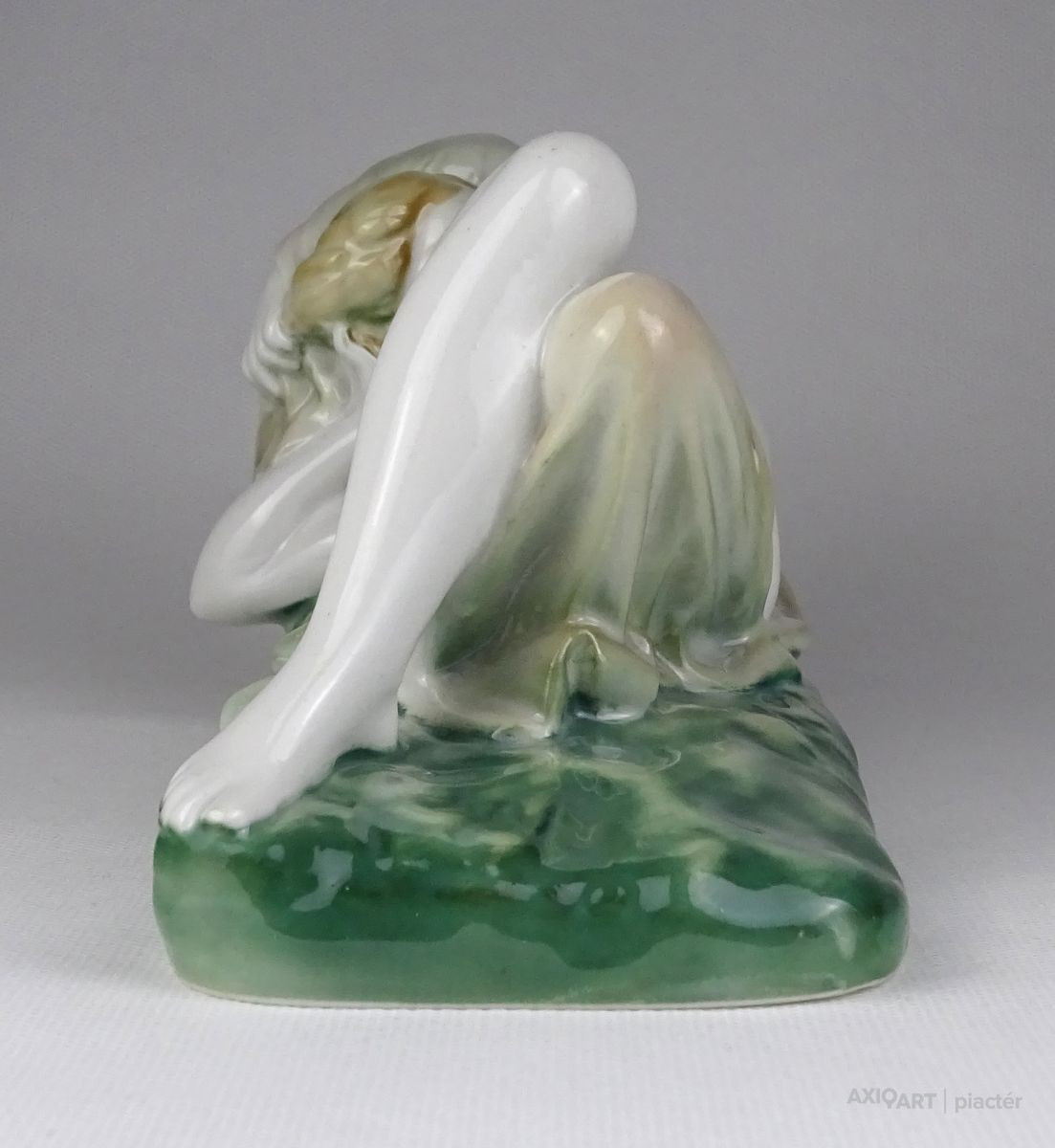 [1L620/X292] Talapzaton fekvő, egész alakos női akt szobor. Régi, ritkán előforduló forma. Alján Zsolnay öttornyú márkajelzés: ZSOLNAY PÉCS MADE IN HUNGARY Formaszám: 8577 Magasság: 10 cm Szélesség: 10 cm Hosszúság: 22 cm Súly: 0.66 kg
