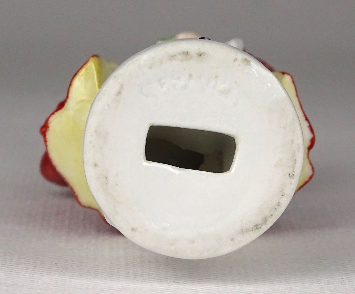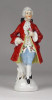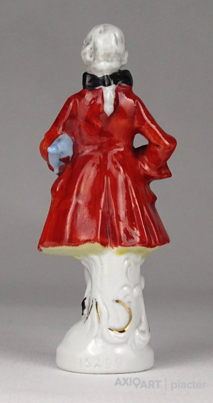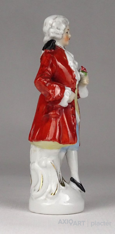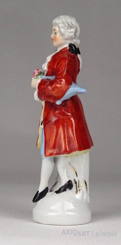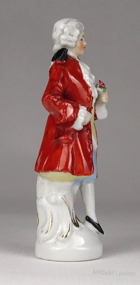 [1Q858/X009] Hibátlan állapotú régi kézzel festett porcelán figura. Piros kabátos, rizsporos parókás rokokó férfi, kezében virággal. Formaszám mélynyomással: 15299 Magasság: 12.5 cm Szélesség: 5 cm Súly: 0.075 kg