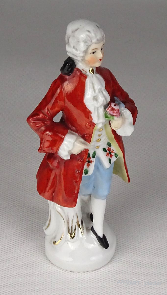 Hibátlan állapotú régi kézzel festett porcelán figura. Piros kabátos, rizsporos parókás rokokó férfi, kezében virággal.