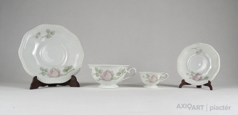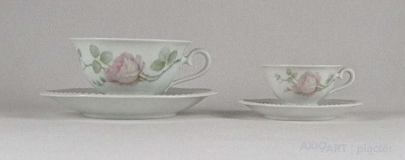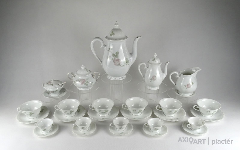 [1L974/X176] Hibátlan állapotú, jelzett rózsadíszes 29 darabos porcelán készlet. Alján zöld márkajelzés: ROSENTHAL A teáskészlet darabjai: - 1 darab nagy méretű teáskanna, teáskancsó (27 x 13.5 x 23 cm) - 1 darab tejszínes kiöntő (13.5 x 10.5 x 15.5 cm) - 1 darab cukortartó bonbonier (12.5 x 11.5 x 16.5 cm) - 6 darab teáscsésze (5.5 x 10.3 x 12 cm) - 6 darab alátét tányér (15 cm) A kávéskészlet darabjai: - 1 darab kis méretű kávéskanna, kávéskancsó (18 x 9 x 15 cm) - 1 darab cukortartó bonbonier (9.5 x 12 cm) - 1 darab porcelán kanál (13.5 cm) - 5 darab kávéscsésze (3.8 x 6.8 x 8 cm) Egyiken apró lepattanás található. - 6 darab alátét tányér (10.5 cm) Súly: 3.865 kg