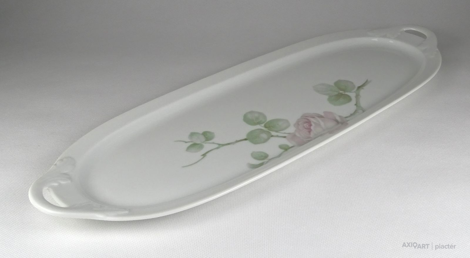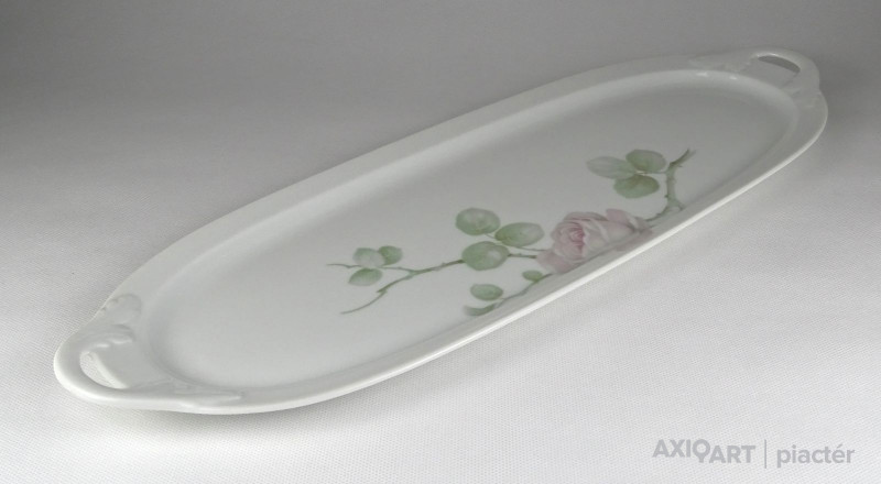 [1L932/Z259] Hibátlan állapotú, jelzett rózsadíszes nagy méretű porcelán kínáló tál, tálca. Alján zöld márkajelzés: ROSENTHAL Szélesség: 16.5 cm Hosszúság: 49 cm Súly: 0.805 kg