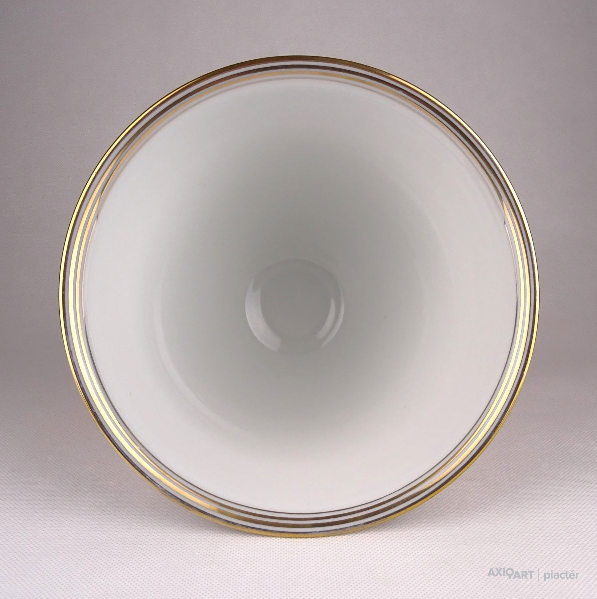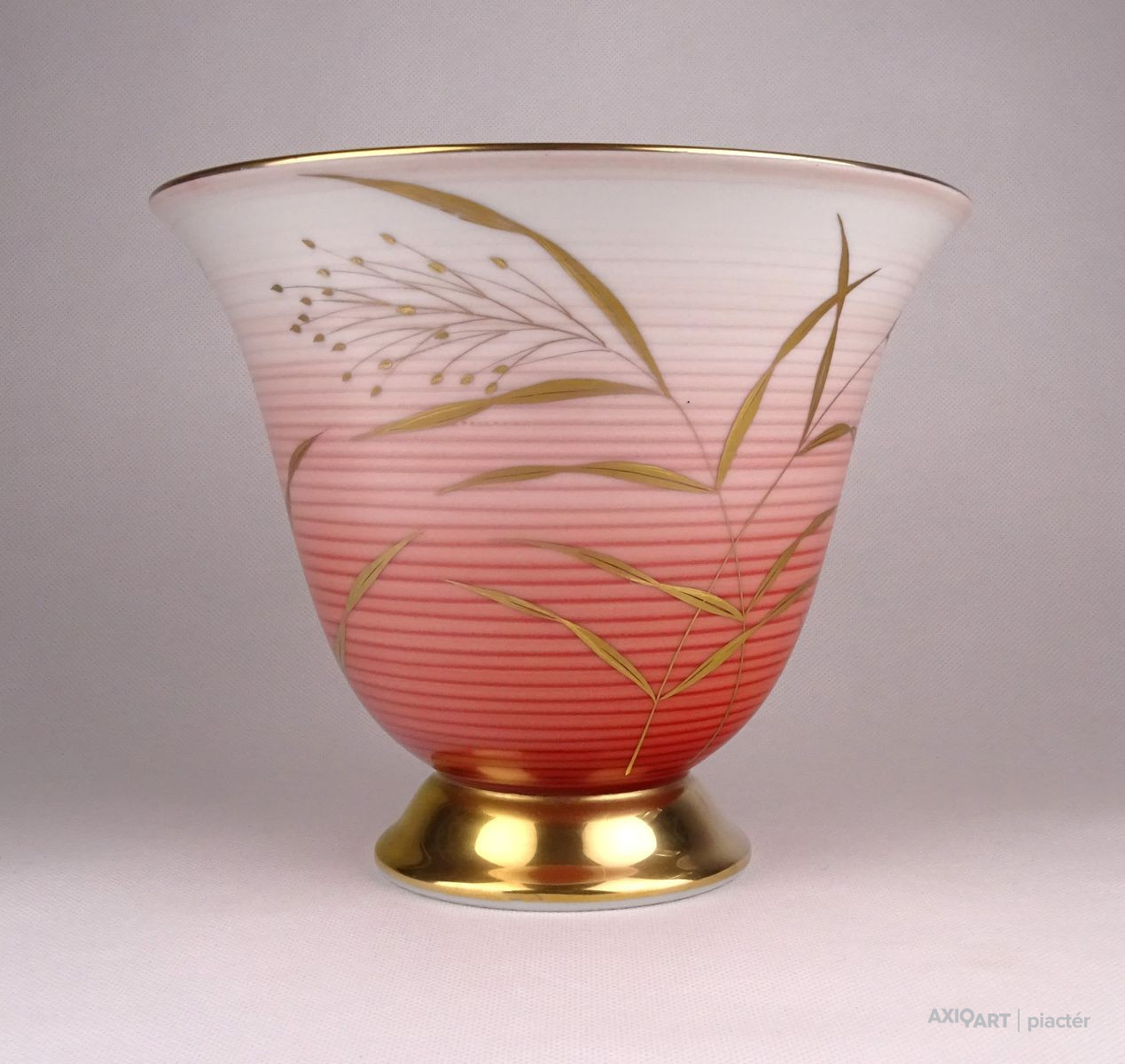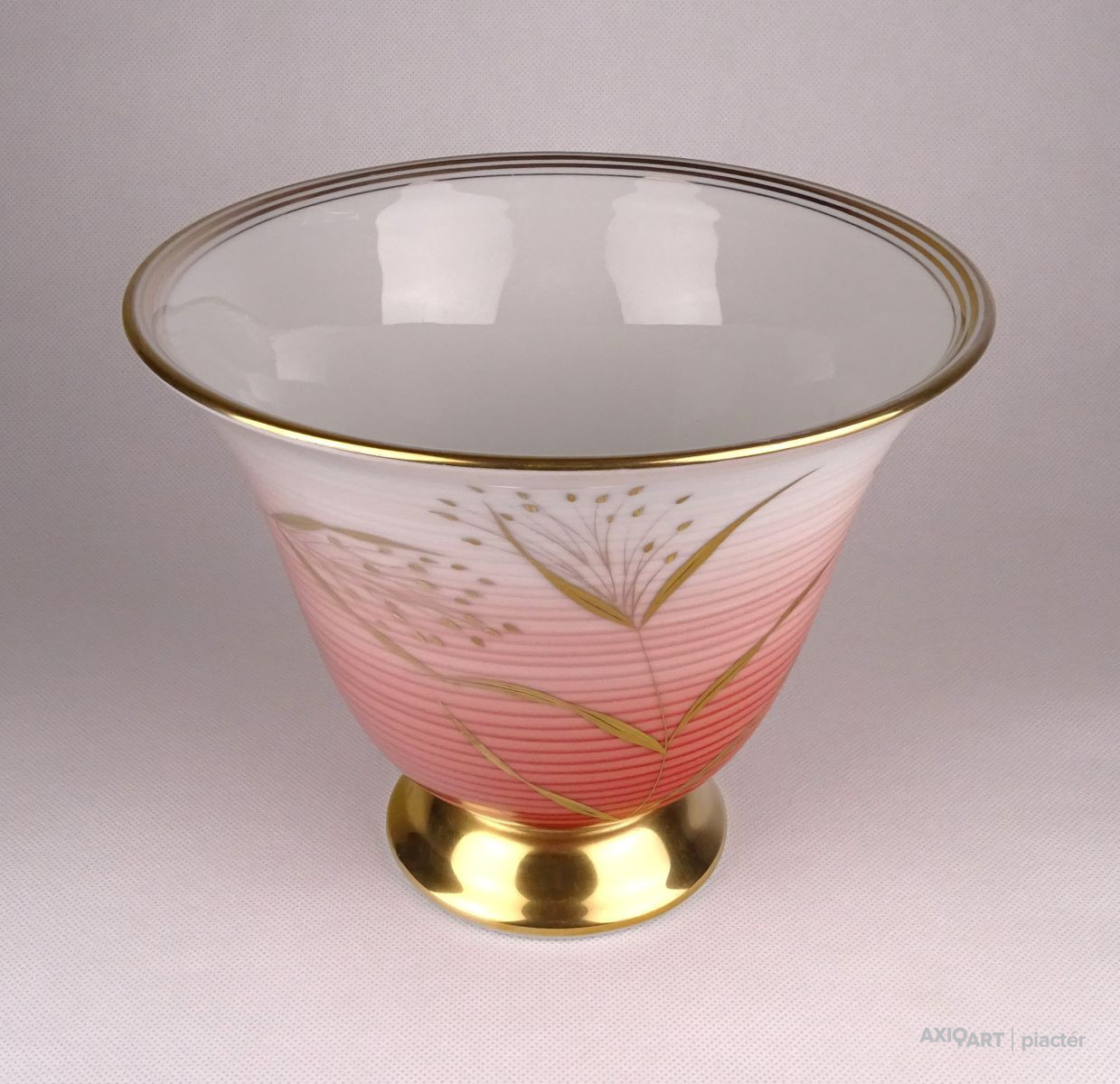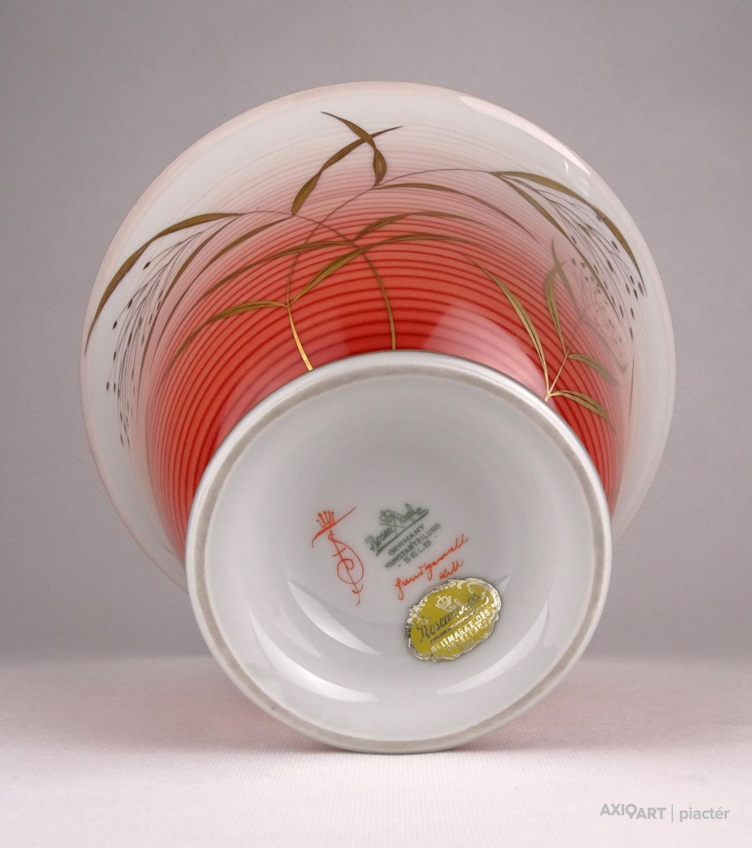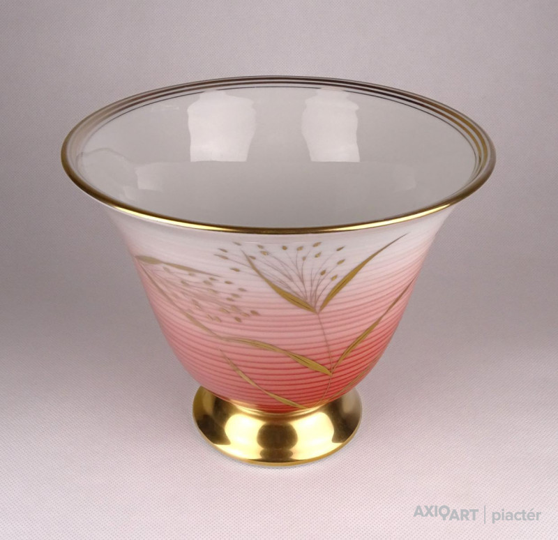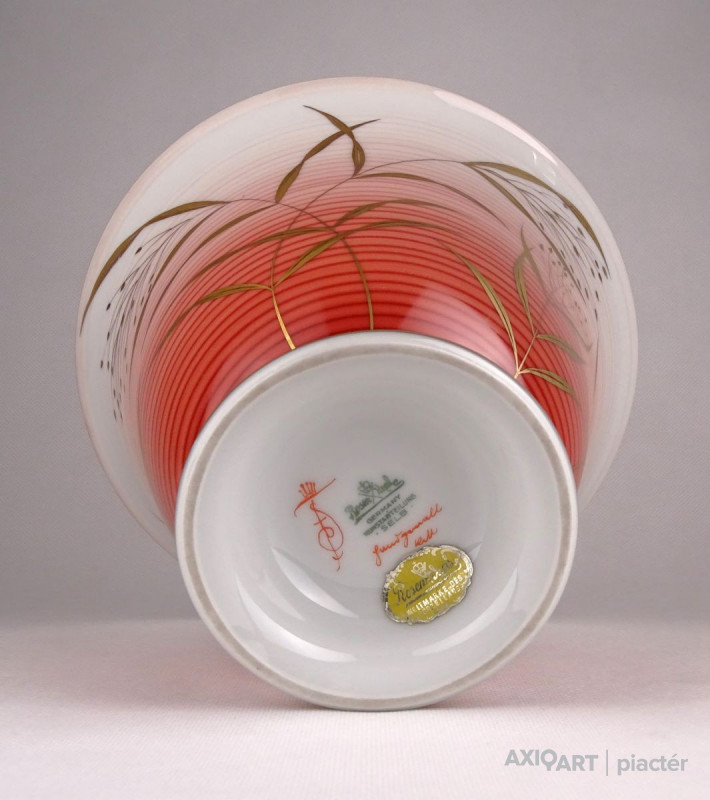 [0X069/UZ-K] Hibátlan állapotú, jelzett régi Rosenthal porcelán váza. Teljes felülete festett, díszített, vastagon aranyozott. Alján zöld koronás jelzés: ROSENTHAL GERMANY KUNSTABTEILUNG SELB ROSENTHAL WELTMARKE DES PORZELLANS A talpon a kézifestő kézjegye, jelzése pirossal. Magasság: 16 cm Szélesség: 19.5 cm Súly: 0.795 kg