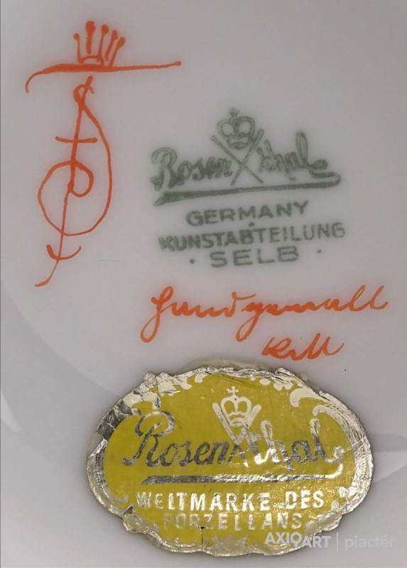 [1T504/Z040] Régi, hibátlan állapotú, talapzaton álló, szépen kidolgozott porcelán bohóc figura. Ritkán előforduló darab. Alján zöld koronás márkajelzés: ROSENTHAL SELB - BAVARIA Talapzaton formatervező neve: FRED. LIEBERMANN (Ferdinand Liebermann - Sculptor - szobrász, a Rosenthal legfontosabb, legnevesebb tervezője) Magasság: 15 cm Szélesség: 11.5 cm Súly: 0.205 kg   Ferdinand Liebermann Ferdinand Liebermann (1883–1941), the son of a toy manufacturer, was a German sculptor. He studied at the Munich School of Arts and Crafts and the Art Academy. After taking study trips to Rome and Paris, he opened a studio in 1910 in Munich. In the same year he received the Great Austrian Golden State Medal for a small bronze sculpture. Several exhibitions followed. He became one of the most important designers for the porcelain manufacturer Rosenthal AG. Liebermann’s work-spectrum encompasses bronze sculpturing, monumental sculpturing and memorials. In 1926 he received the professor title for monumental and portrait sculpturing in Munich.  After 1933, Liebermann  produced at the orders of the Nazi party 32 busts of Hitler (all 1½ life size), one of which was a commission from the city of Munich for the city hall. In appreciation he was made city councillor of the Capital of the Movement, the 'Haupstadt der Bewegung'. Liebermanns Führerbust was displayed at the XIX Venice Biennale 1934 ('Cancelliere del Reich Adolf Hitler') and also at the GDKs of 1937, 1938 and in the Münchener Kunstausttellungen 1934, 1940 and 1941. It is said that the busts designed by Liebermann were favoured by the German leader over all the others.  His sculpture 'L'Abbandoro' ('Abandoned') was displayed at the XIV Biennale 1924 in Venice; ‘Erhebung’ (‘Elevatione’ or ‘Elevation’) was displayed at the XIX Venice Biennale 1934 and later again at the GDK 1937, room 9. In 1938 his bronze ‘Abwehr’ (‘Defence’ or 'Ripulso') was displayed at the XXI Venice Biennale. Liebermann also completed a bronze bust of Hitler's half-niece Geli Raubal, who had shot herself in Hitler’s apartment in 1931. From this bust Hitler had numerous copies made for display in his residences.  At the Great German Art Exhibitions Ferdinand Liebermann was represented with 16 works, among them the two Hitler busts, the relief 'Wille’ (design for the Freikorps-monument), a bust of Riechsleiter Alfred Rosenberg, Reichsleiter Amann and two 'Kampf' sculptures.  In 1941, the year of his death, he created the massive sculpture for the  Freikorpsdenkmal in Munich. In the possession of the Bayerische Staatsgemäldesammlungen are the following works: 'Eva' (GDK 1939 room 35), 'Abwehr', 'In Erwartung', Frisches Lachen', 'Paolo', 'Rhythmus' and 'Knabe auf einem Waller reitend'. A copy of 'Eva' in bronze (72 cm high) was displayed at the exhibition ‘Kunst im 3. Reich, Dokumente der Unterwerfung’; the exhibition, instigated by the Frankfurter Kunstverein, was held from 1974 to 1975 in Frankfurt, Hamburg, Stuttgart, Ludwigshafen and Wuppertal.Ferdinand Liebermann: Ferdinand Liebermann: (1883–1941), the son of a toy manufacturer, was a German sculptor. He studied at the Munich School of Arts and Crafts and the Art Academy. After taking study trips to Rome and Paris, he opened a studio in 1910 in Munich. In the same year he received the Great Austrian Golden State Medal for a small bronze sculpture. Several exhibitions followed.r He became one of the most important designers for the porcelain manufacturer Rosenthal AG. Liebermann’s work-spectrum encompasses bronze sculpturing, monumental sculpturing and memorials. In 1926 he received the professor title for monumental and portrait sculpturing in Munich.  After 1933, Liebermann  produced at the orders of the Nazi party 32 busts of Hitler (all 1½ life size), one of which was a commission from the city of Munich for the city hall. In appreciation he was made city councillor of the Capital of the Movement, the 'Haupstadt der Bewegung'. Liebermanns Führerbust was displayed at the XIX Venice Biennale 1934 ('Cancelliere del Reich Adolf Hitler') and also at the GDKs of 1937, 1938 and in the Münchener Kunstausttellungen 1934, 1940 and 1941. It is said that the busts designed by Liebermann were favoured by the German leader over all the others.  His sculpture 'L'Abbandoro' ('Abandoned') was displayed at the XIV Biennale 1924 in Venice; ‘Erhebung’ (‘Elevatione’ or ‘Elevation’) was displayed at the XIX Venice Biennale 1934 and later again at the GDK 1937, room 9. In 1938 his bronze ‘Abwehr’ (‘Defence’ or 'Ripulso') was displayed at the XXI Venice Biennale. Liebermann also completed a bronze bust of Hitler's half-niece Geli Raubal, who had shot herself in Hitler’s apartment in 1931. From this bust Hitler had numerous copies made for display in his residences.  At the Great German Art Exhibitions Ferdinand Liebermann was represented with 16 works, among them the two Hitler busts, the relief 'Wille’ (design for the Freikorps-monument), a bust of Riechsleiter Alfred Rosenberg, Reichsleiter Amann and two 'Kampf' sculptures.  In 1941, the year of his death, he created the massive sculpture for the  Freikorpsdenkmal in Munich. In the possession of the Bayerische Staatsgemäldesammlungen are the following works: 'Eva' (GDK 1939 room 35), 'Abwehr', 'In Erwartung', Frisches Lachen', 'Paolo', 'Rhythmus' and 'Knabe auf einem Waller reitend'. A copy of 'Eva' in bronze (72 cm high) was displayed at the exhibition ‘Kunst im 3. Reich, Dokumente der Unterwerfung’; the exhibition, instigated by the Frankfurter Kunstverein, was held from 1974 to 1975 in Frankfurt, Hamburg, Stuttgart, Ludwigshafen and Wuppertal.