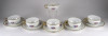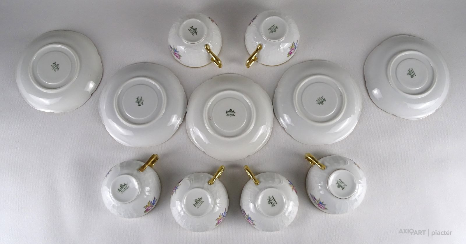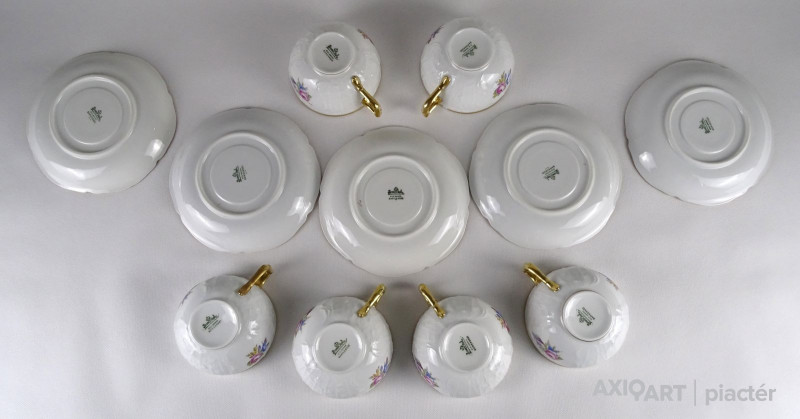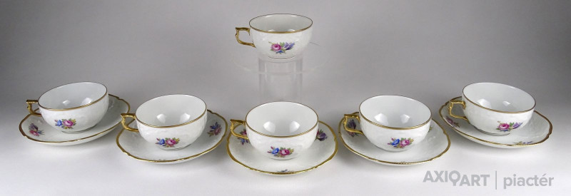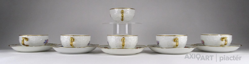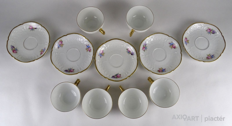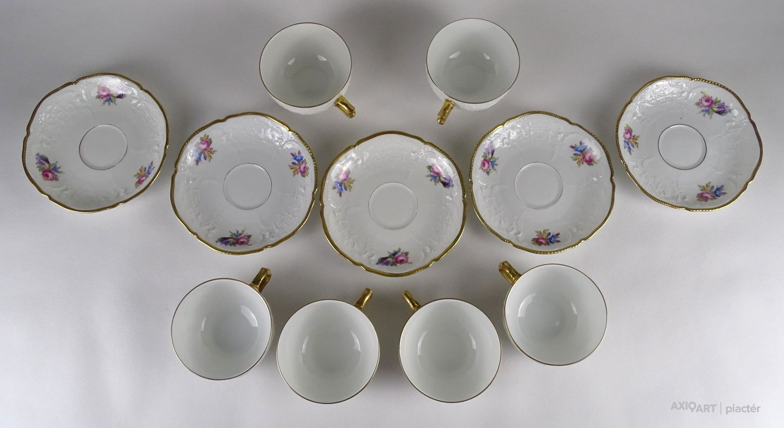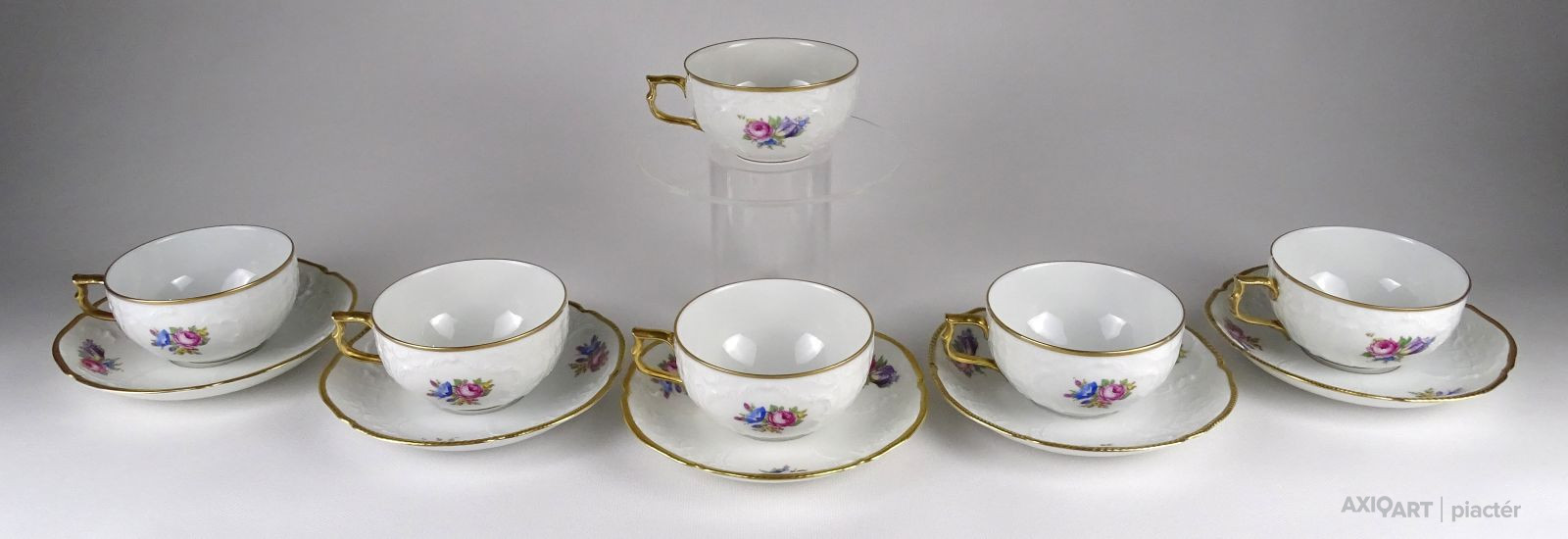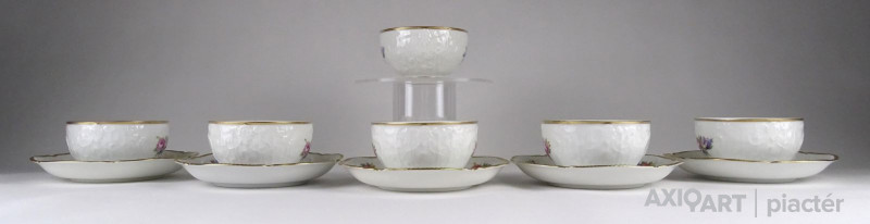 [1N006/X228] Régi jelzett, gyönyörű, gazdagon és vastagon aranyozott Rosenthal porcelán teáskészlet. Rajta virágdíszítés és plasztikus gyönyörű motívumok láthatók. A készlet darabjai: - 6 darab teáscsésze (5.3 x 9.5 x 12 cm) - 5 darab alátét tányér (15.5 cm) Alján zöld koronás márkajelzés: ROSENTHAL SELB BAVARIA SANSSOUCI Súly: 1.3005 kg