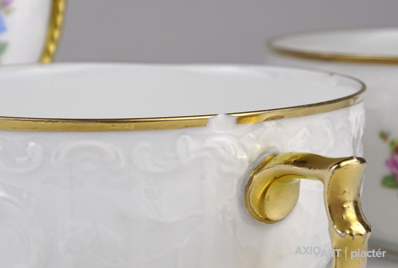 Régi jelzett, gyönyörű, gazdagon és vastagon aranyozott Rosenthal porcelán teáskészlet. Rajta virágdíszítés és plasztikus gyönyörű motívumok láthatók.